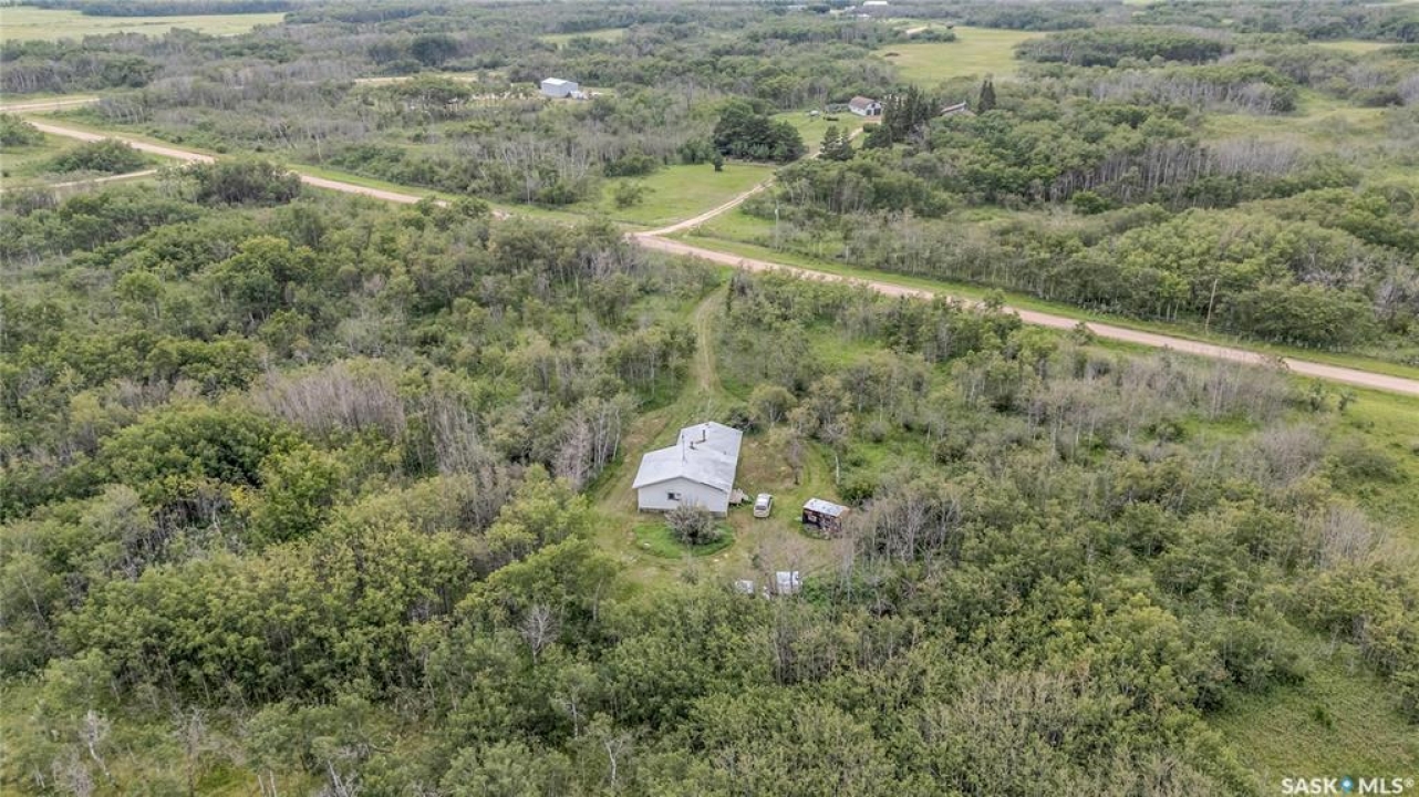 A rare opportunity to own10 acres just 15 minutes from Saskatoon, make this acreage your own personal sanctuary. Heavily covered by poplars, it's not uncommon to see deer, moose, fox, and a vast array of bird species. This 720 square foot bungalow is 1984 built, with an attached heated 26 X 36 shop for wood work, art studio or hobby space. Primary heat is two Osburn wood stoves and electric baseboards, natural gas to the property line & well water source. Features handmade oak & ash cabinets, custom stained glass door, 4 piece bathroom, front & back deck, and more!