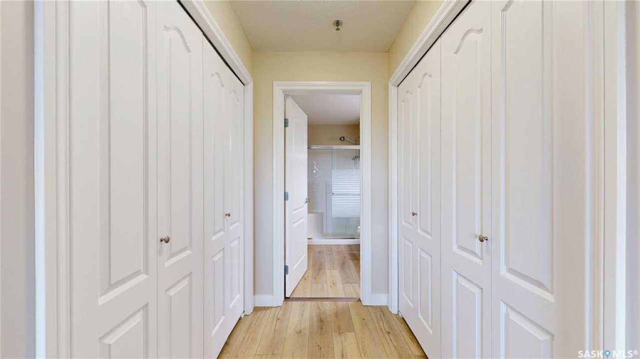 Welcome to �Unit 308 at 2885 Arens Road E, a meticulously maintained and spacious residence situated in the desirable �Wood Meadows �neighborhood,offering unparalleled access to all East End amenities. This �third-floor unit �boasts a desirable �open-concept layout,perfect for modern living and entertaining. The well-appointed kitchen features ample storage and counter space, complemented by a convenient �eat-up breakfast bar. Recent updates include new �countertops(2021) and a full suite of �stainless steel Whirlpool appliances. The entire unit features durable, recently updated �vinyl plank flooring(2025) and baseboards, �along with a bright interior finished with a �neutral paint palette �(2021). The dining area flows seamlessly into the large living room, which provides direct access to a good-sized �west-facing balcony—ideal for relaxing and enjoying stunning �sunset views. The smart floor plan offers privacy,separating the sleeping quarters. The �primary bedroom �features double closets and a private �three-piece ensuite bathroom. The secondary bedroom and the main four-piece bathroom are situated on the opposite side of the living space. This unit comes equipped with modern conveniences,including �in-suite laundry,central air conditioning, natural gas connection with Colman Revolution BBQ included, all custom blinds and a �built-in central vacuum system. Ownership includes �one exclusive parking stall �and a secure �storage unit cabinet �within the heated parkade which is uniquely built at ground level for ease of access. The building is exceptionally well-maintained and offers an impressive array of �amenities �for residents to enjoy, including:Hospitality Room, Exercise Room,Craft/Games Room,Workshop,Guest Suite, Internal shared storage room, Wash Bay in the Parkade, Elevator and Visitor Parking. �Condo fees include � water, sewer, centralized water heater and water softener, snow removal, lawn care, garbage and recycling, common area maintenance, building insurance and reserve fund.