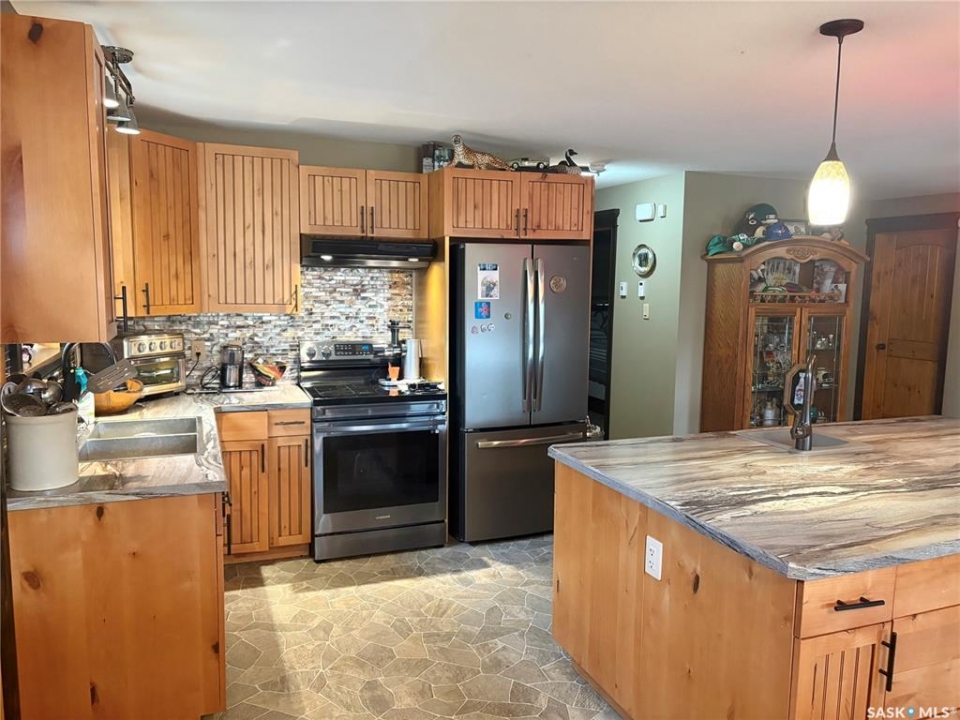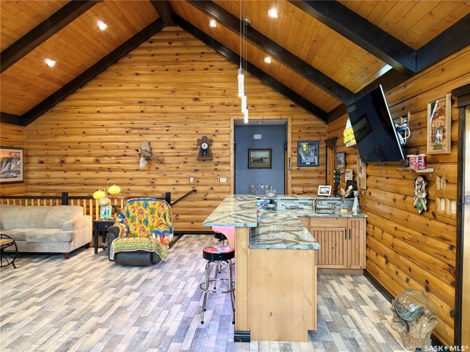 Welcome to 964 Whitesand Avenue at Burgis Beach, a stunning four-season home designed for comfort, entertaining, and lakeside living. Originally built in 2008 with a major addition in 2015, only steps away from the beach, this property offers a perfect mix of warmth, space, and functionality. Inside, you'll find in-floor heat, a forced-air propane furnace, and even a generator for peace of mind. The great room is a showstopper, featuring a natural wood-burning fireplace and a wet bar, the perfect setup for watching the game or hosting friends. Upstairs, there are two bedrooms and a luxurious 5-piece bathroom with a jet tub and tiled shower, plus a private patio overlooking the lake. The main floor offers plenty of space to gather, including a bright sunroom, a spacious kitchen with a large island and ample counter space, a 4-piece bathroom, a bedroom, and a convenient laundry area. The impressive L-shaped garage (35.5' x 24.3' with an extra 18.7' x 13.1' bay) features heated floors, a 3-piece bathroom, and loads of storage — ideal for vehicles, toys, and tools. Outside, you'll find three sheds, including one large enough to park a side-by-side or snowmobiles. The yard also boasts a beautiful fire pit area with hardwired lights along the path. Whether you're looking for a year-round home or a retreat to relax and entertain, 964 Whitesand Avenue delivers comfort, quality, and lake life at its best. (LED lights under bar - in pictures shows red - but changeable to your favorite team colors)