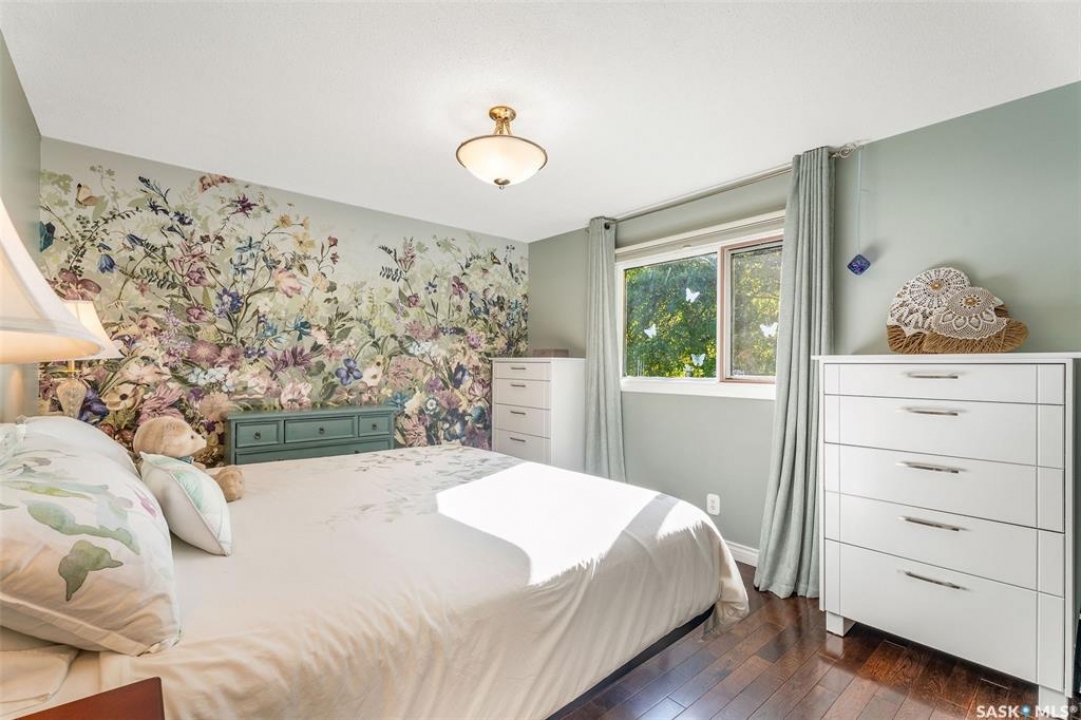 Remarkable 1,044 sqft bungalow located within walking distance to schools and parks! As you step inside you are greeted by gleaming dark oak hardwood flooring that flows throughout the main living areas and an open concept layout that creates a warm and inviting atmosphere. The spacious living room features a large bay window that fills the space with natural light and connects seamlessly to the dining area and kitchen. The modern kitchen is both stylish and functional and offers stainless steel appliances, white cabinetry, a beautiful tile backsplash and an island with bar seating that brings family and friends together. The main floor also includes 2 comfortable bedrooms, a convenient laundry area with direct access to the back deck and a beautifully finished 3 piece bathroom featuring a stand up shower with striking tile surround. The fully finished basement provides an expansive family room centered around a cozy gas fireplace, a 3rd bedroom with a walk-in closet, a 4-piece bathroom that has a beautiful tub surround, utility room and plenty of storage space. Notable features and updates include central air conditioning, an energy efficient furnace (2017), hot water heater (2017) and shingles (2017). The exterior is just as impressive with a fully fenced and thoughtfully landscaped yard with mature trees, a large deck and patio, perfect for outdoor enjoyment. The property also includes 2 sheds with beautifully finished exteriors that provide both charm and additional storage, along with a partially insulated single attached garage and parking pad. Act now and make this your next home!