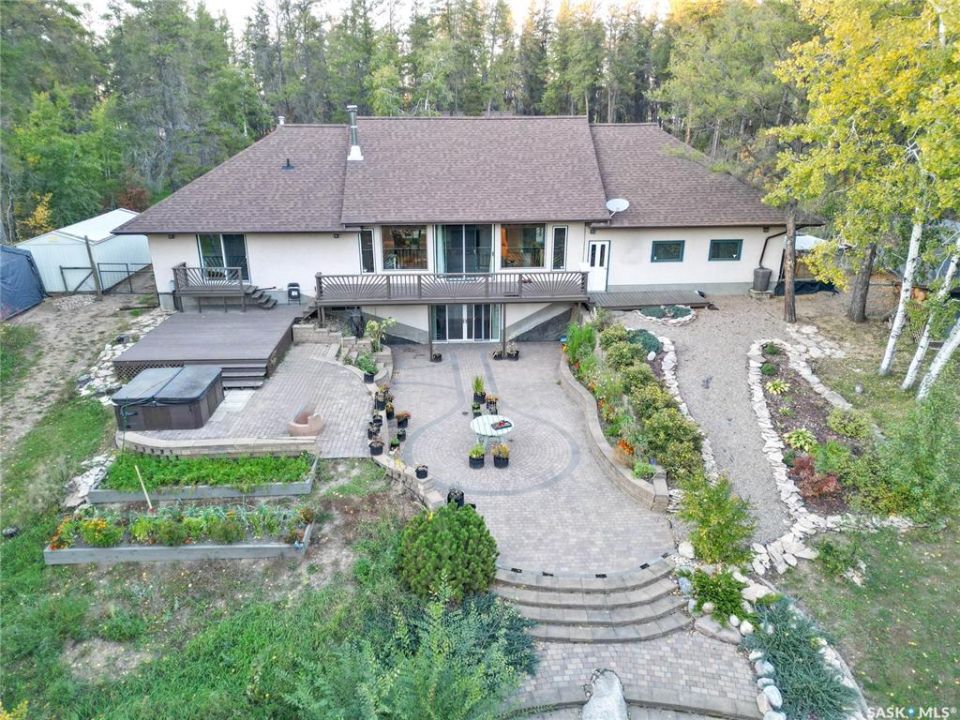Immaculate 4 Bedroom + Den Acreage with Walkout Basement & Dream Garages only 5 Minutes from Prince Albert! This stunning and meticulously maintained 1,518 sq/ft bungalow offers the perfect blend of luxury, privacy, and convenience on a beautifully landscaped 2.47-acre lot. Built in 1994, this home features a spacious walkout basement, attached 26' x 28' double attached garage, and an incredible 24' x 48' heated detached triple garage complete with a carport and fully finished loft space above — ideal for hobbies, storage, or a home business. The main floor welcomes you with vaulted ceilings, hardwood flooring, and a cozy wood-burning fireplace with stone surround and built-ins in the bright south-facing living room. The kitchen offers an abundance of cabinetry and opens to the dining area. Three spacious bedrooms, a full bathroom, and a private ensuite in the primary which also has access to the deck and hot tub overlooking the breathtaking yard. The walkout basement is an entertainer's dream with a massive games room and family room featuring built-ins, cork flooring, and access to the covered patio. You'll also find a fourth bedroom, den, full bathroom, laundry, and plenty of storage space. Outside, the fully fenced and heavily treed property provides complete seclusion with green space, and manicured landscaping that must be seen to be appreciated. Additional features include central air conditioning, central vac, multiple sheds, and pavement right to your driveway. A one-of-a-kind property offering the best of acreage living with city convenience — truly impressive inside and out!