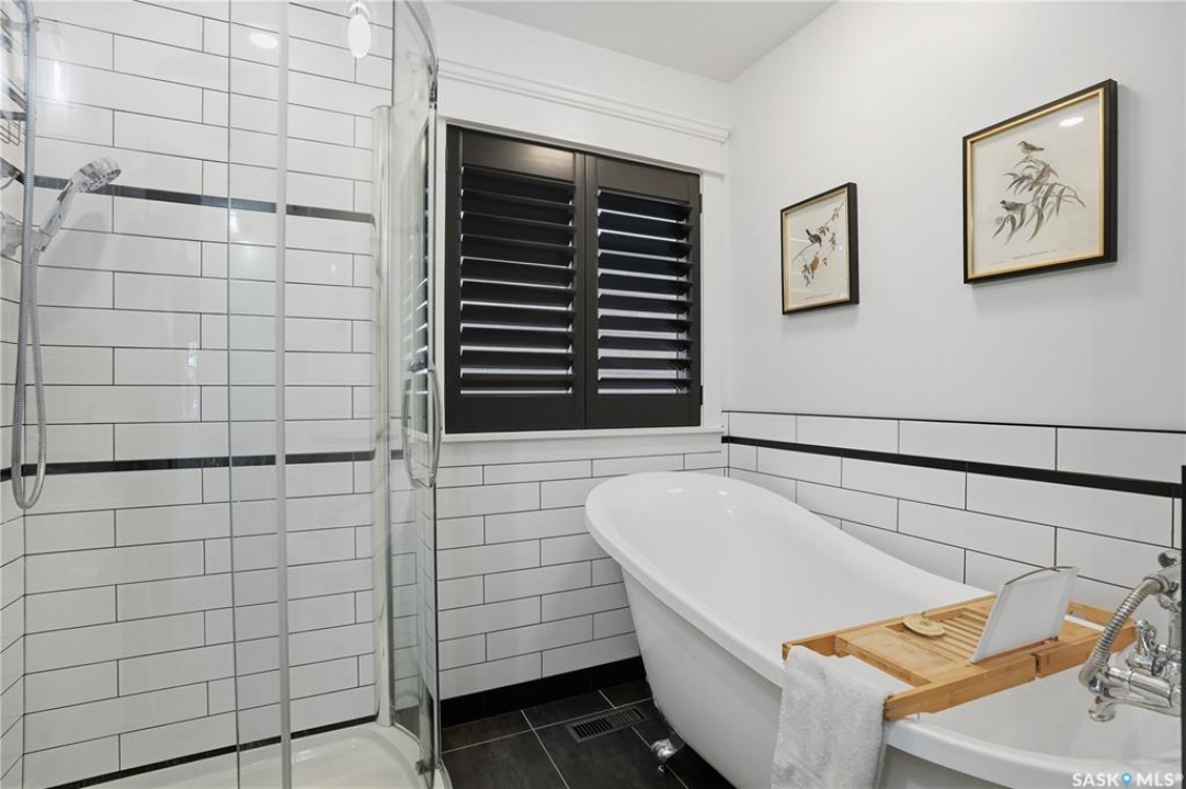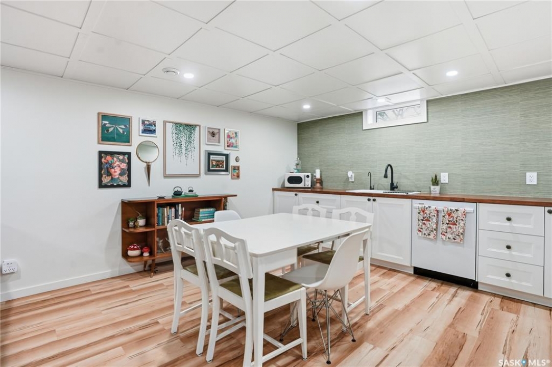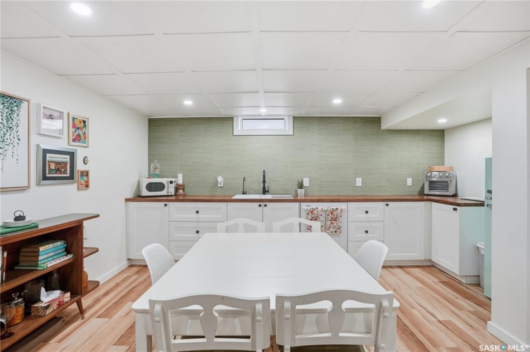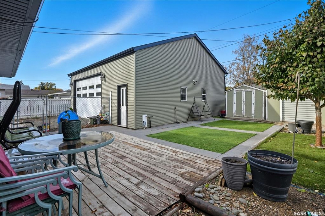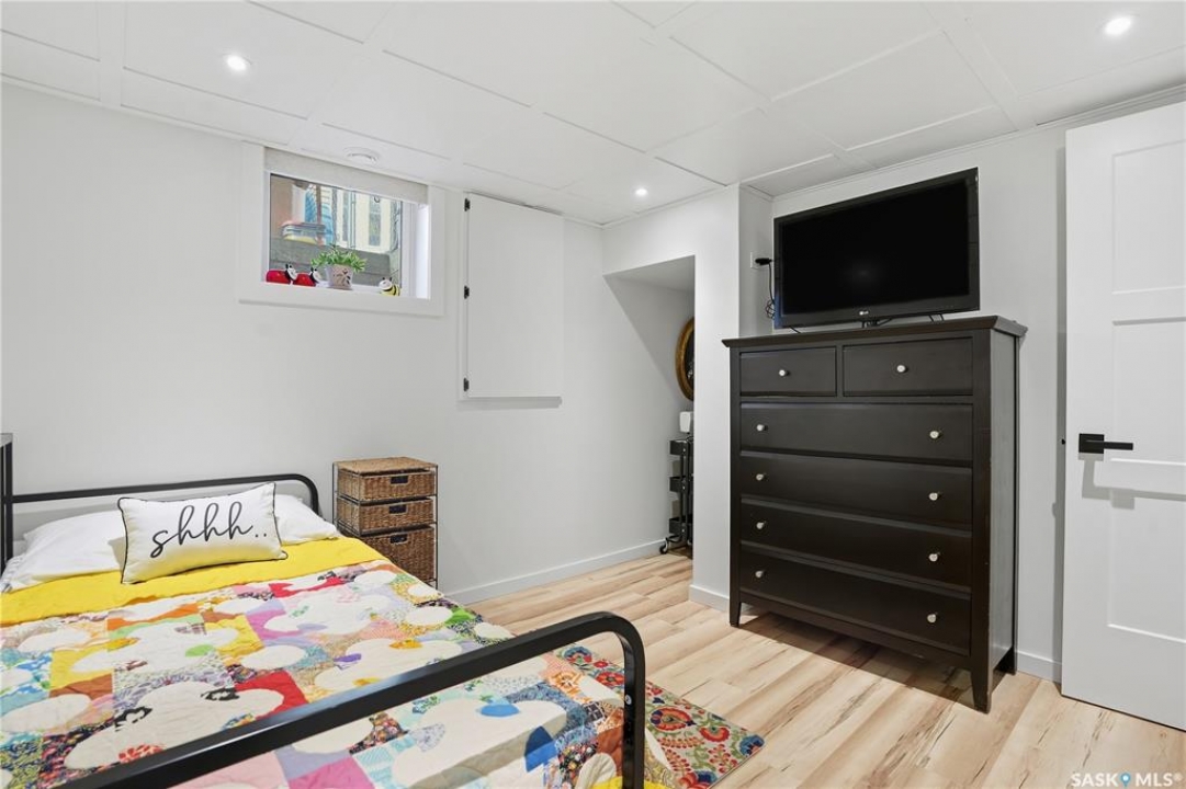 Welcome 3318 4th Avenue N! This beautifully renovated 1,054 sq ft bungalow blends modern updates with timeless charm. Offering four bedrooms and two bathrooms, the home's thoughtful layout provides flexibility — one bedroom is attached to the primary suite, ideal for a nursery or dressing room, while another has been converted into a home office. The main bathroom features a heated tile floor and a charming clawfoot tub for a touch of luxury. The farmhouse-style kitchen brings warmth and character to the heart of the home. The lower level offers incredible versatility — it can serve as a non-regulation suite or as a fantastic entertainment space complete with a wet bar and room for a full-size fridge, electric fireplace and tons of storage. Outside, you'll find a xeriscaped backyard designed for easy maintenance and year-round enjoyment. The shop-quality garage is a dream — 32x32 in size with an oversized door, steel I-beam, radiant heat, air conditioning, and a built-in radial arm saw (to stay). Recent updates/upgrades include newer siding and windows (2022), newer shingles, new LVP flooring, upgraded lighting, and motorized blinds. Seller states the north wall has been blue-skinned with weeping tile installed and run out to the street. Situated on a mature, quiet street in Coronation Park, this home is move-in ready and packed with upgrades — perfect for anyone seeking comfort, functionality, and craftsmanship. This home absolutely must be seen to be appreciated!