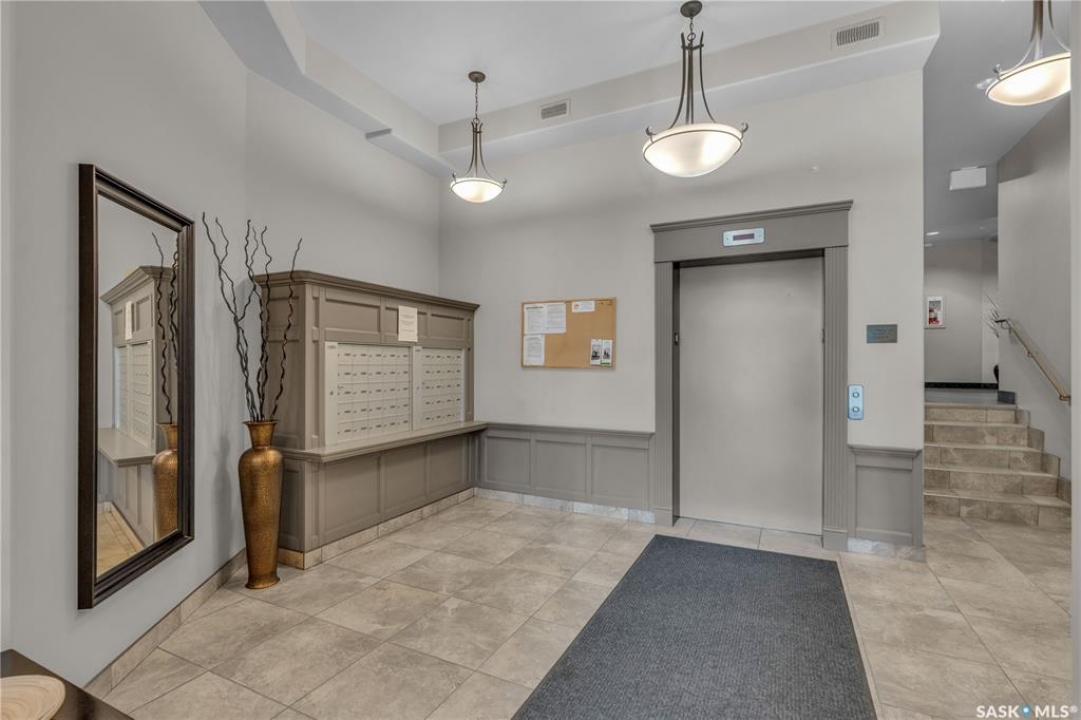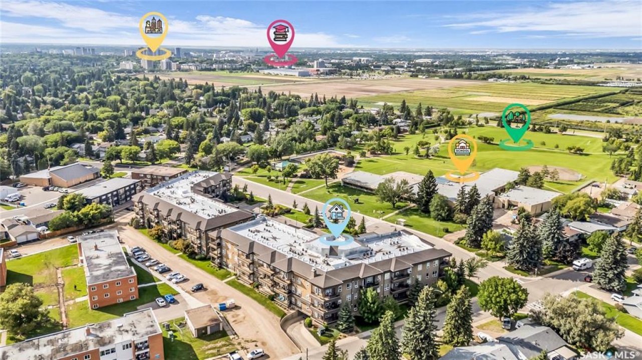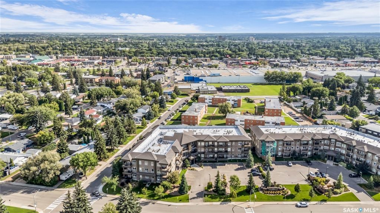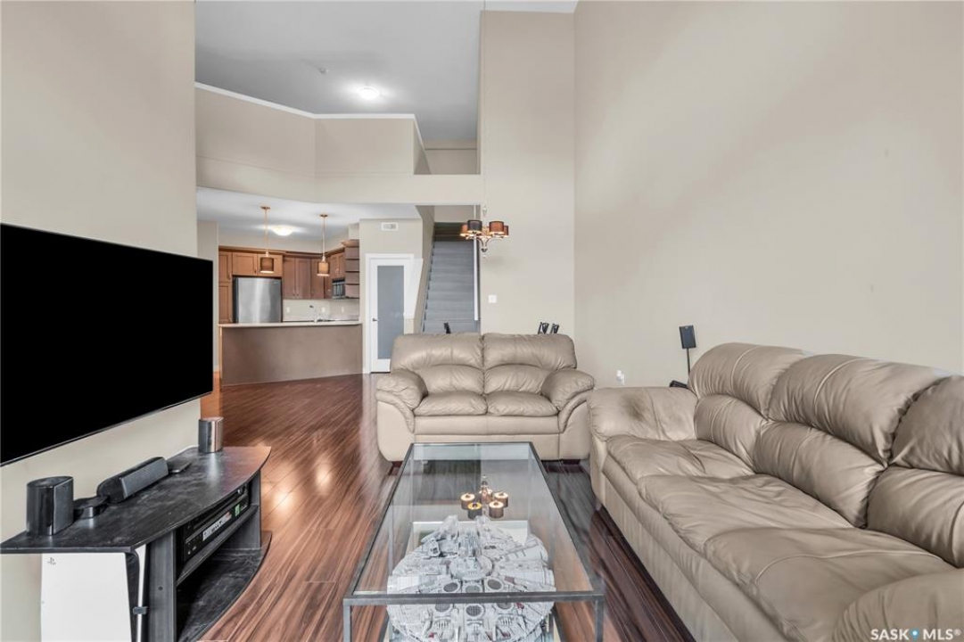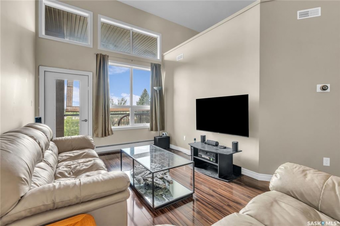 Top-Floor Loft Condo in Greystone Heights – 2 Underground Parking Stalls Welcome to 301-2730 Main Street, a spacious top-floor unit located in the heart of Greystone Heights. Offering 1,543 sq. ft. of well-planned living space, this unique condo features a rare loft-style layout, two underground parking stalls (Stalls 45 & 47) and storage unit (47) ( —a true gem in this sought-after community. The main floor welcomes you with a bright and functional kitchen, complete with granite countertops, peninsula seating, and included appliances: fridge, stove, dishwasher, and over-the-range microwave. The open-concept dining and living area boasts northwest-facing window and a garden door leading to a private balcony—perfect for enjoying summer evenings. A den with a glass-insert door provides the ideal space for a home office or hobby room. Also on the main floor is a generous second bedroom, a 4-piece bathroom, and a laundry/storage room with washer and dryer included. Upstairs, the primary suite offers a unique open-to-below layout overlooking the living space, plus a 3-piece ensuite and a cozy sitting or office area—perfect for work-from-home or quiet reading space. Located just steps from Greystone School and park, with easy access to 8th Street, the University, College Drive, and Circle Drive, this home offers the perfect blend of comfort, convenience, and style.