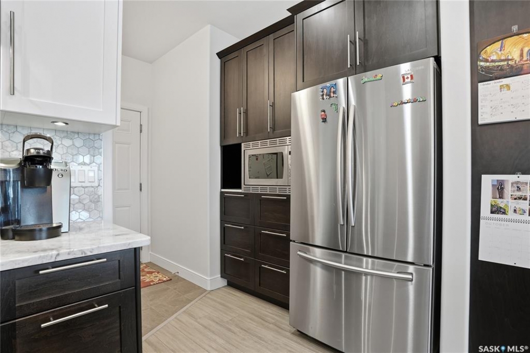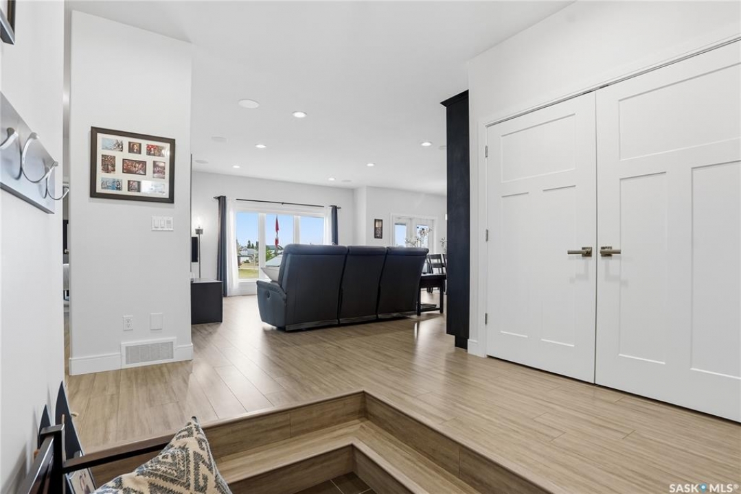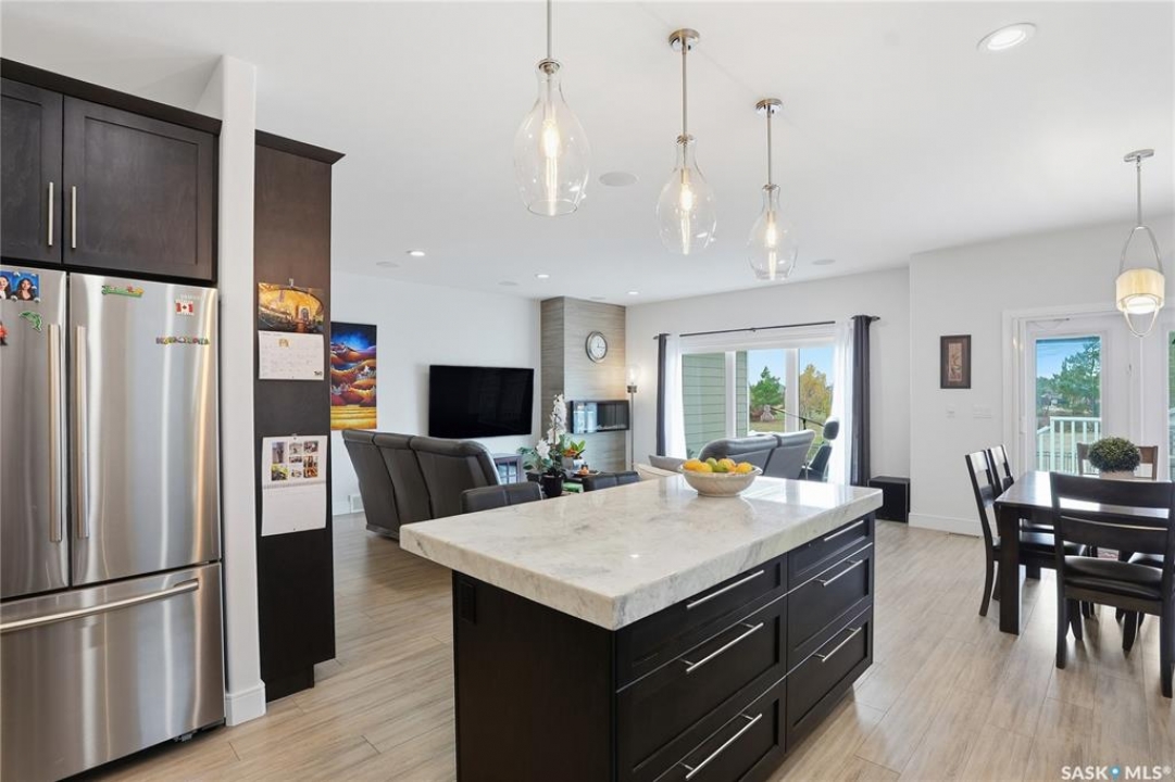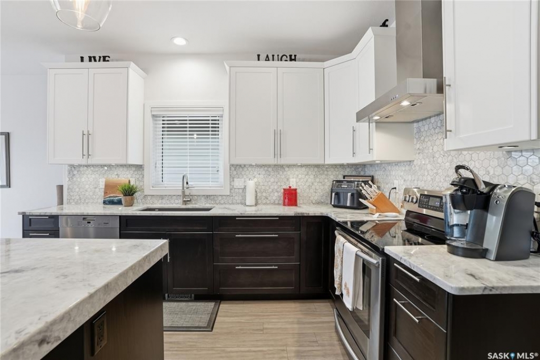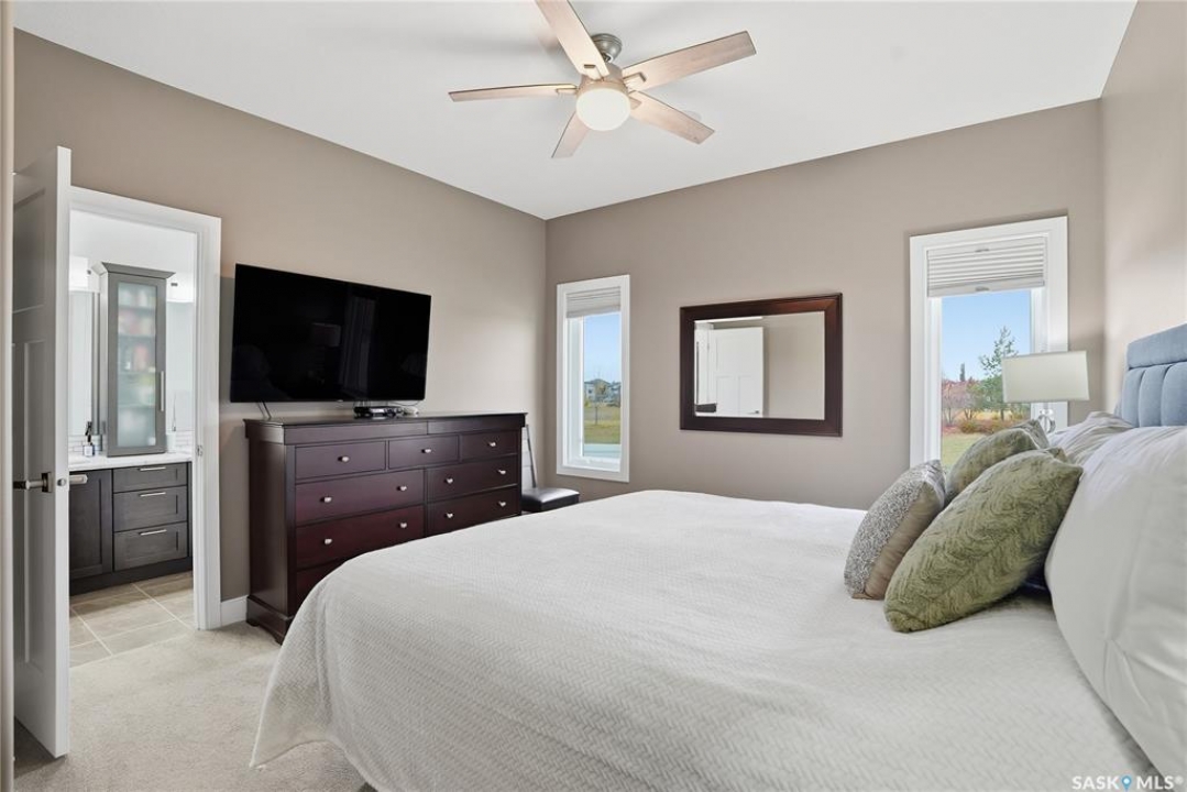 Wow! This home is truly a gem. This immaculate custom-built Fraser Homes bungalow (2014) offers 1730 ft. of fully developed living space, designed with functionality and luxury in mind. Featuring 6 bedrooms + a den, this home boasts high-end finishes, 9' ceilings, a sound system throughout, and multi-zone heating and cooling. The chef's kitchen includes a large island, custom maple cabinetry, stainless steel appliances, marble backsplash, and quartzite granite countertops. The primary suite features a spacious walk-in closet and ensuite with dual sinks and glass shower. All three bathrooms offer heated tile floors and Kohler fixtures. Enjoy maintenance-free landscaping with zero-scape turf, flagstone pathways, composite fencing, and a two-tier deck backing the park. Exterior upgrades include Trimlight LED event lighting (phone-controlled), polyaspartic-coated garage floors, and Hardie Board siding. With southwest exposure, three natural gas outlets, and a triple concrete drive, this home blends quality, comfort, and design in every detail.