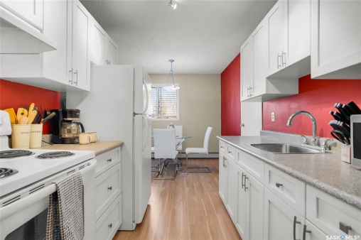 Are you looking for top-floor, corner-unit living, aka no noisy neighbours above you and way better natural light for your houseplants (or your gaming setup)? This bright and well-kept 2-bedroom, 1-bath condo in Tiffany Place offers 760 square feet of easy living with quick possession available, so you can be unpacking before your next rent payment is due. The updated kitchen has refreshed cabinetry and plenty of room for takeout containers and actual cooking. The open living area is filled with sunshine from the west-facing balcony. It's the perfect spot for sunsets, study breaks, or convincing your friends you're thriving at adulthood. Wall-mounted A/C keeps things cool all summer, and the in-suite storage room handles everything from camping gear to your “someday” treadmill. You'll have your own electrified parking stall, so no more winter extension-cord acrobatics or endless street-parking searches. The building is quiet, clean, and ideal for anyone who wants low-maintenance living with zero drama. East College Park is one of Saskatoon's most underrated areas. It's family-friendly, close to the U of S, and just minutes from 8th Street's shopping, groceries, and coffee options. Plus, Circle Drive is right nearby for quick access anywhere in the city. If you've been looking for your first place, your freedom pad, or just an escape from landlord life, this one hits all the right notes. Affordable, comfortable, and completely move-in ready, it's basically the adulting upgrade you've been waiting for. Book your private showing and see what all the fuss is about!