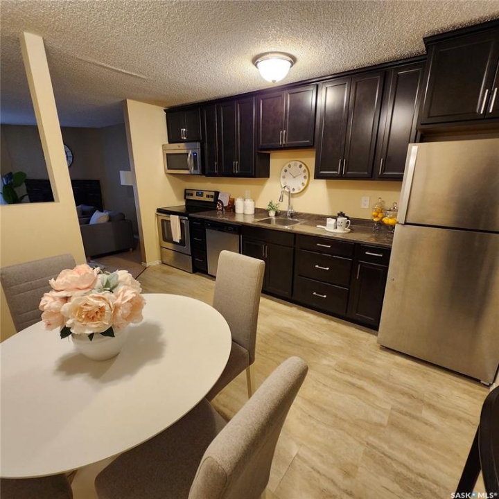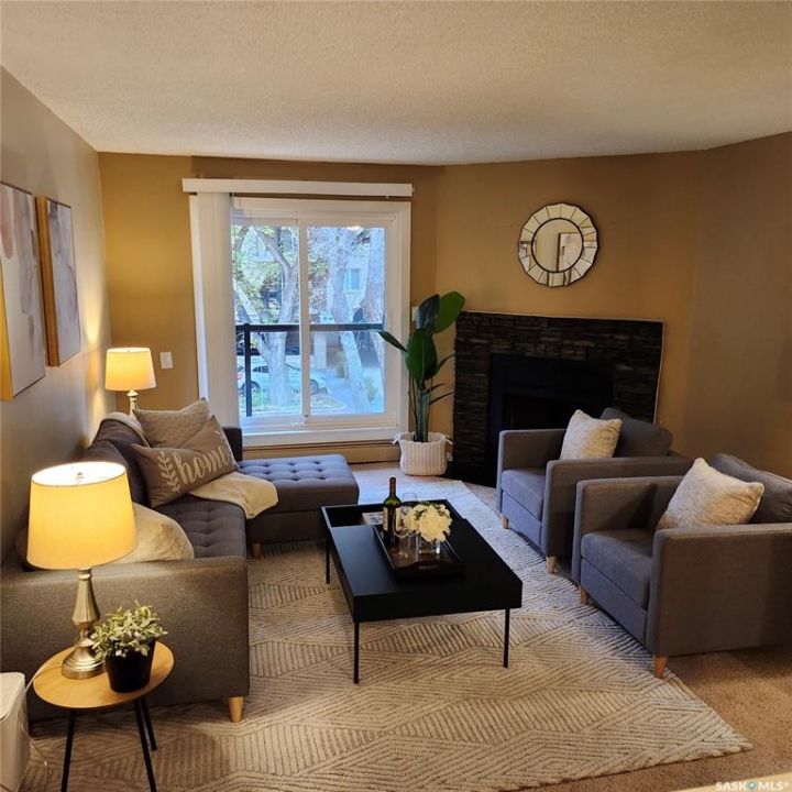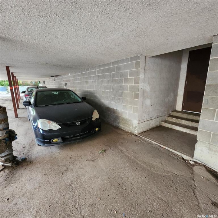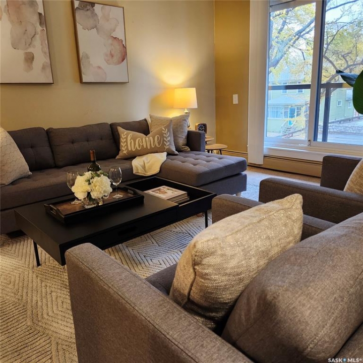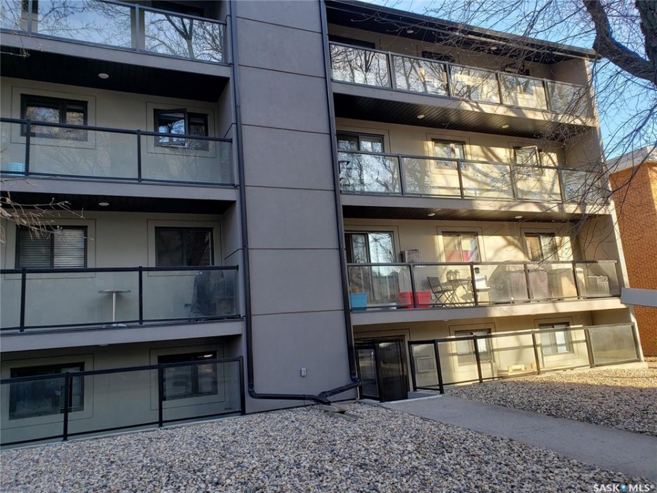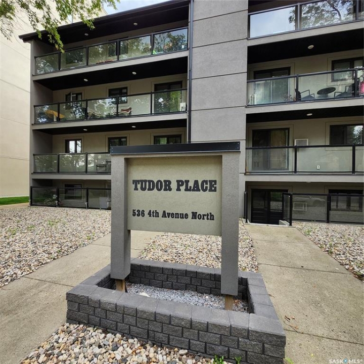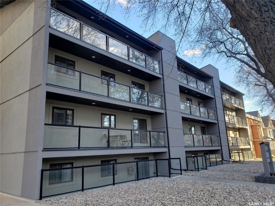 CITY PARK - - - Updated, spacious 2 bedroom condo in City Park walking distance to the river, U of S, and downtown. Renovations over the years include: newer kitchen with dark maple cabinets, countertops, vinyl plank flooring, sink, tap, & stainless steel appliances. Updated bathroom with newer vanity, taps, and tub surround. All newer trims & baseboards, paint, and lighting. Master bedroom with cheater ensuite & double closet. Ensuite laundry. Huge west facing balcony shaded by mature elm trees. One covered, electrified parking stall included. This spacious unit is in a superb City Park location. Great for U of S, AIRBNB, & downtown workers. Don't miss this one!