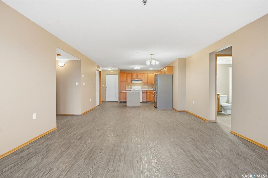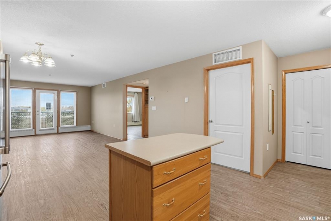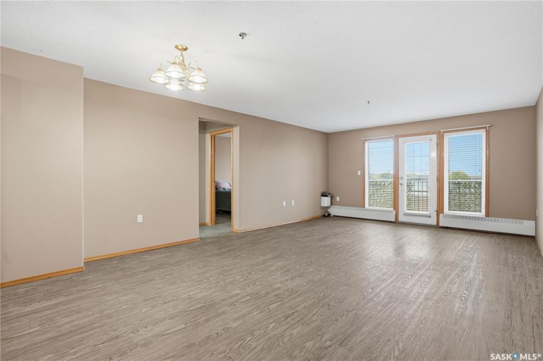 Welcome to this spacious and beautifully maintained 2-bedroom, 2-bathroom condo, ideally situated just steps from amenities and public transit. Step inside to a bright, open-concept living, dining, and kitchen area that's perfect for both relaxing and entertaining. The functional kitchen offers plenty of counter and cabinet space, making meal prep a breeze. Enjoy the comfort of upgraded vinyl plank flooring that flows throughout the main living areas, adding a modern and stylish touch. The primary bedroom features plenty of closet space and an ensuite complete with a sleek new walk-in shower. A second bedroom and full bathroom provide excellent space for guests or a home office. Additional highlights include in-suite laundry, central air conditioning, and a large private balcony—perfect for morning coffee or evening sunsets. You'll also appreciate the convenience of heated underground parking, especially during Saskatchewan winters. Condo fees include heat and water, offering excellent value and peace of mind. Located within a block of shopping, restaurants, and a bus stop, this home combines comfort, convenience, and low-maintenance living.