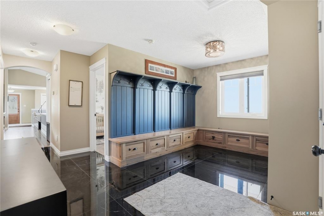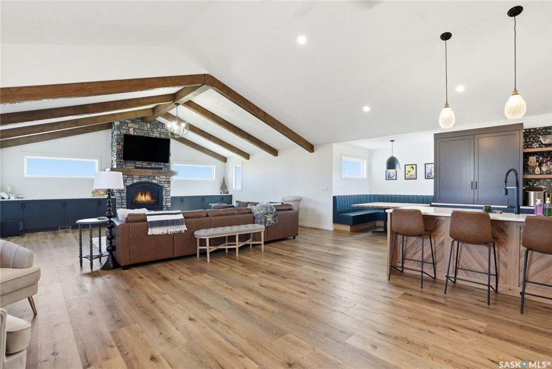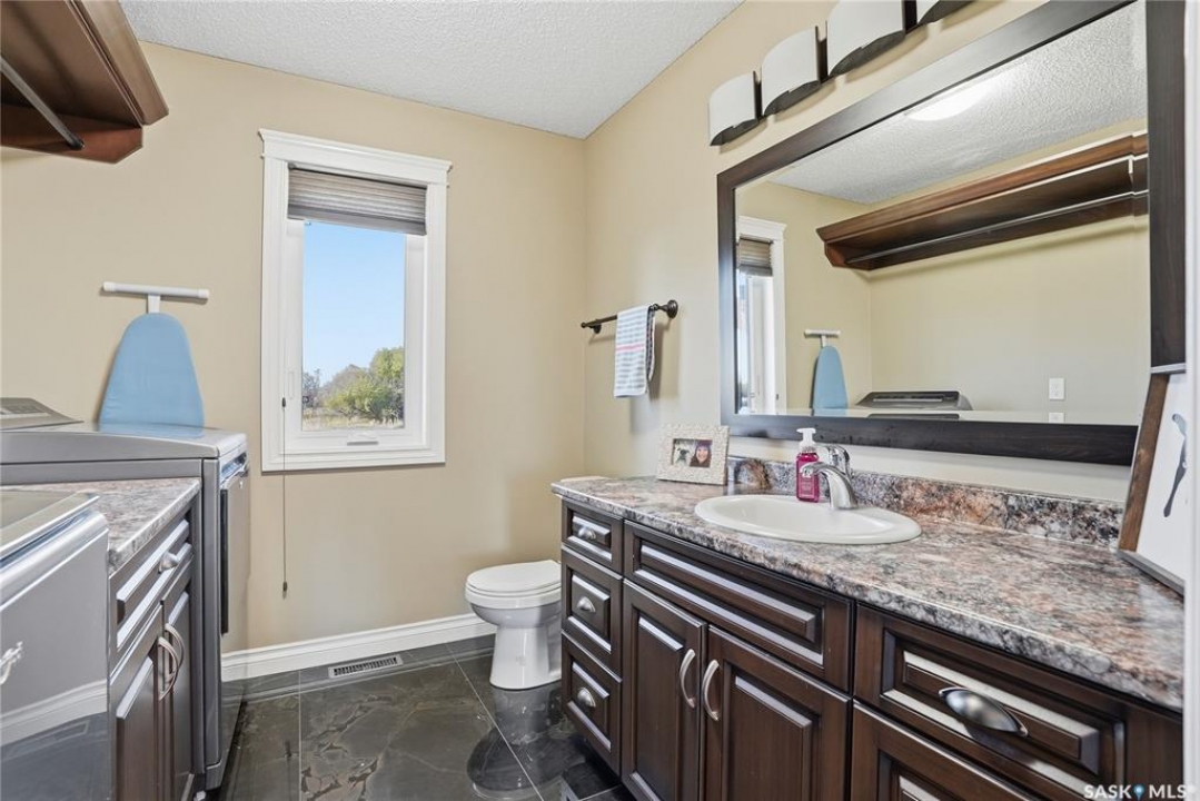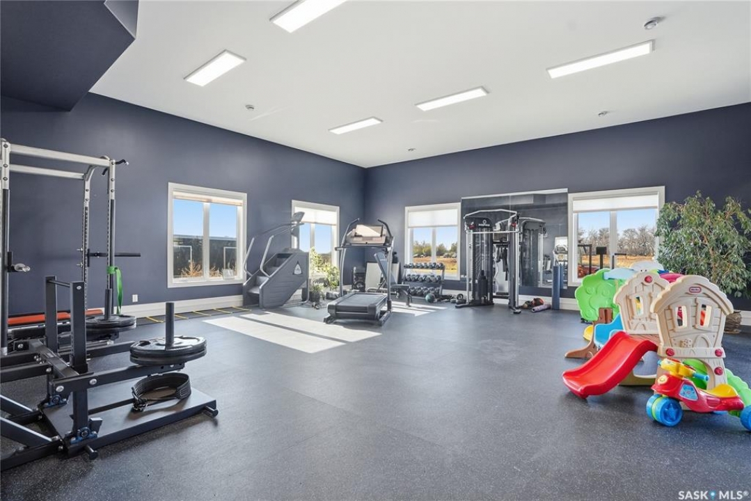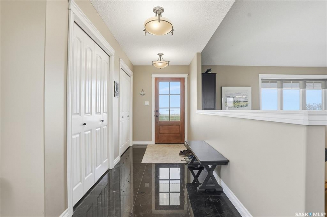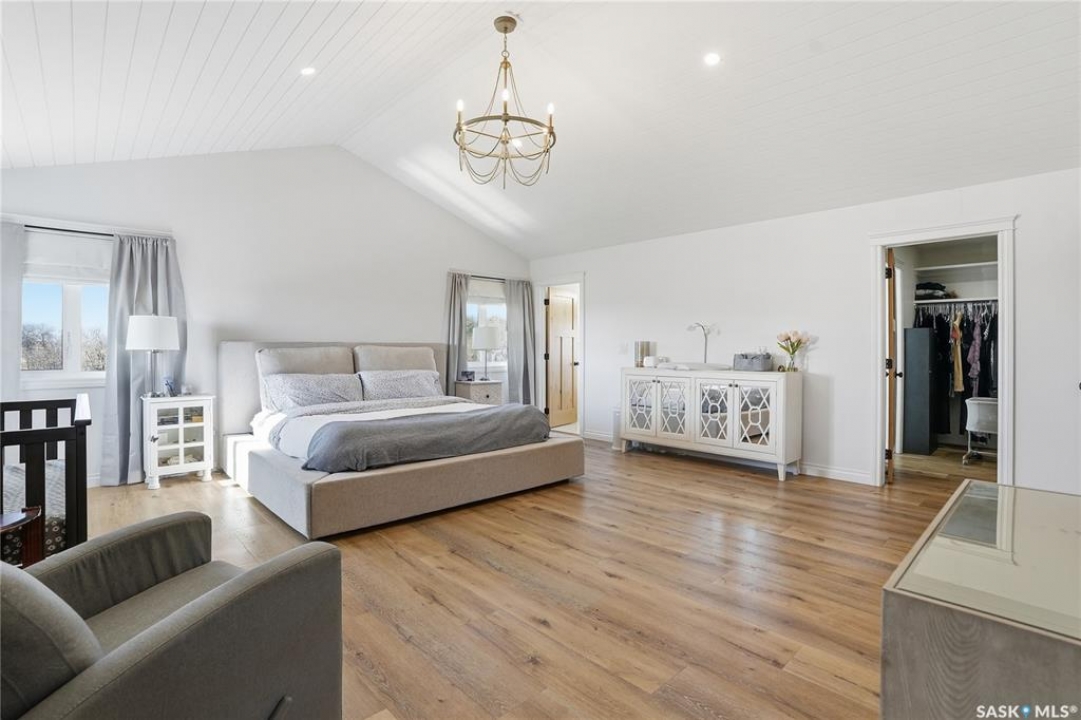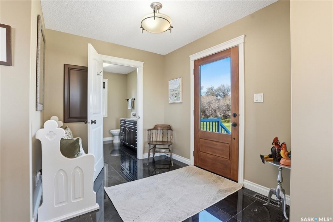 Located southeast of Saskatoon in the RM of Blucher, off Highway 16, along McConnel Road. This stunning 10-acre property offers the perfect blend of luxury and country living. Nestled among scenic farmland, the impressive 4,170 sq ft family home boasts 5 spacious bedrooms and a thoughtfully designed layout ideal for multi-generational living. Step into the grand front foyer, where sleek black tile flooring extends into the main floor laundry and bath. The open-concept main floor is bright and welcoming, featuring a chef-inspired kitchen with wooden cabinetry, tile backsplash, stainless steel appliances, a corner pantry, and a large island perfect for entertaining. Two main-floor bedrooms include one with a private ensuite, while a custom mudroom off the triple heated garage(31'x36') adds practical elegance with built-in shelving and bench storage. Upstairs, the loft showcases a striking glass railing, exposed beams, a cozy stone gas fireplace, and a wet bar complete with tile backsplash, Miele fridge, and dishwasher. The luxurious primary suite is a true retreat with vaulted ceilings, white paneling, a beautiful chandelier, and a spa-like ensuite, featuring white marble tile, quartz counters, double sinks, a glass-enclosed rain shower, heated floors and a corner Jacuzzi tub. The custom walk-in closet offers abundant built-in storage. The fully developed basement includes a large family room, a 4-piece bath with heated floors, two additional bedrooms, and a mechanical room with drip system, a/c, HRV. The 36' x 31' triple heated garage (12' ceilings) is complemented with a bonus space—a home gym or studio—with floor-to-ceiling windows and 12' ceilings. Perfect for fitness or yoga classes. Start the day with morning coffee on the east-facing deck off the kitchen and enjoy serene prairie sunsets from the west-facing back deck or on the stamped concrete patio roasting hotdogs and marshmallows. Call Today. Must be viewed to be truly appreciated.