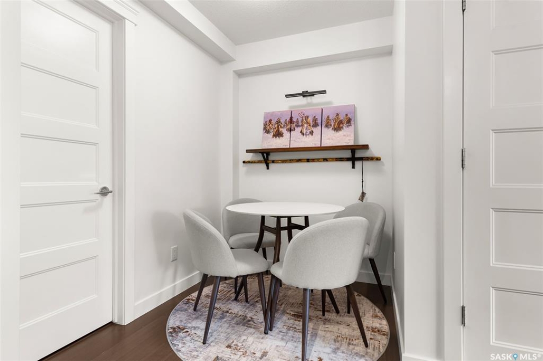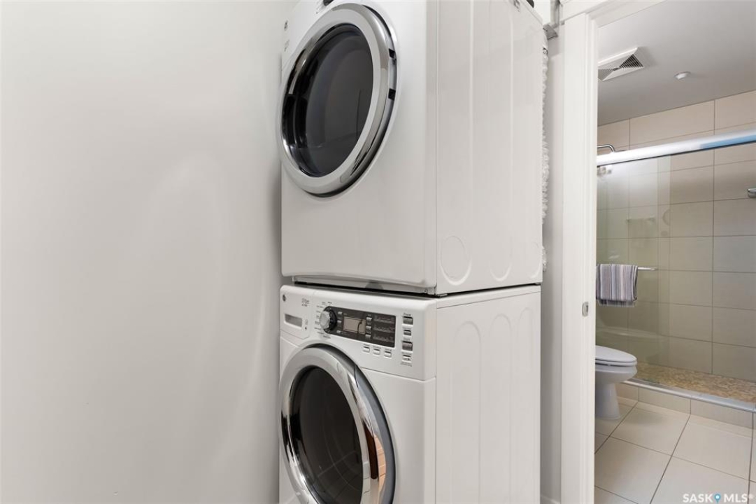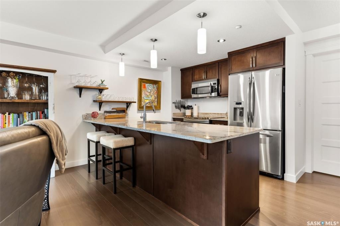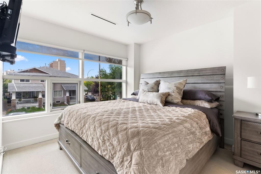 Welcome to this unique and stylish condo ideally located in Regina's Transition area. Bright and open the main floor offers expansive windows, a street-level entrance and private outdoor patio area. Step inside and you will be welcomed to a modern kitchen with plenty of prep space, matching appliances and living and dining areas ideal for entertaining. A thoughtful pantry, designated mudroom and direct access to the underground parking complete this floor. Upstairs, enjoy a spacious primary suite with walk-in closet and luxurious 4-piece ensuite. Here you will also find a versatile den, 2nd full bathroom and laundry/storage room. Additional perks include generous underground parking with storage unit, access to the roof top patio, walking track and fitness centre and condo fees that include heat and water utilities. With its unbeatable location, smart layout and elevated finish this condo is the perfect blend of comfort, style and convenience.