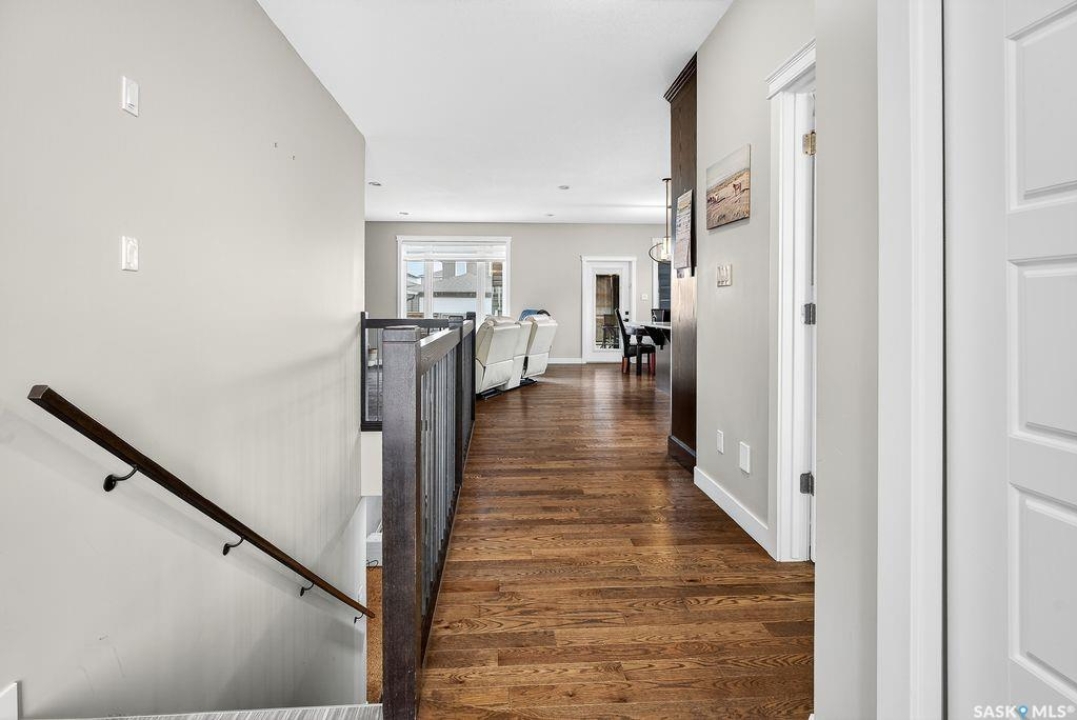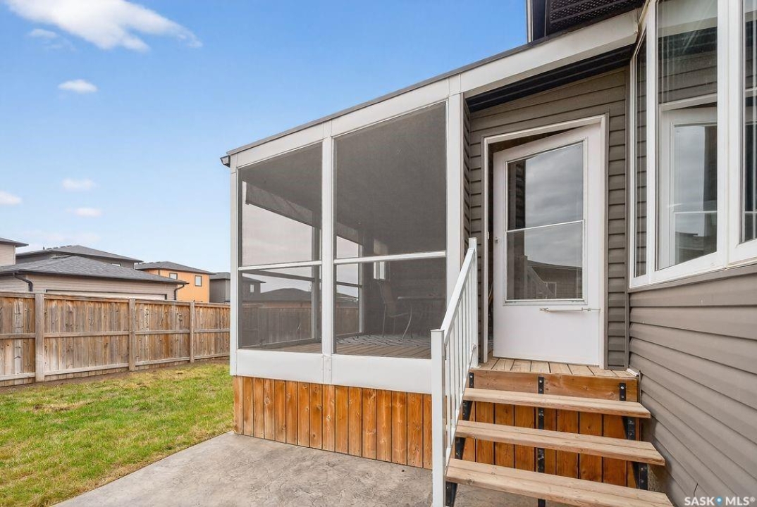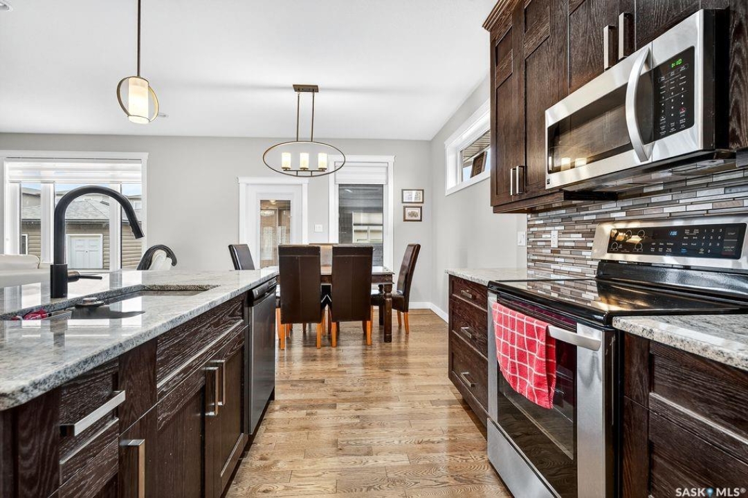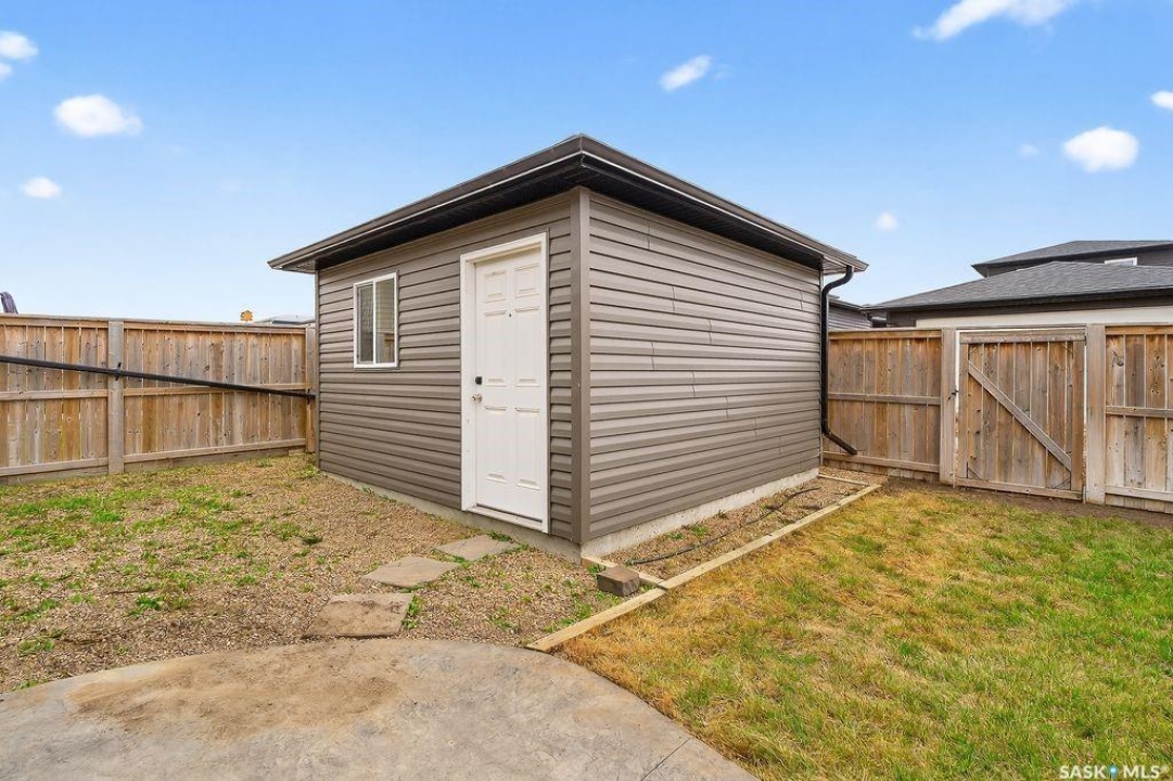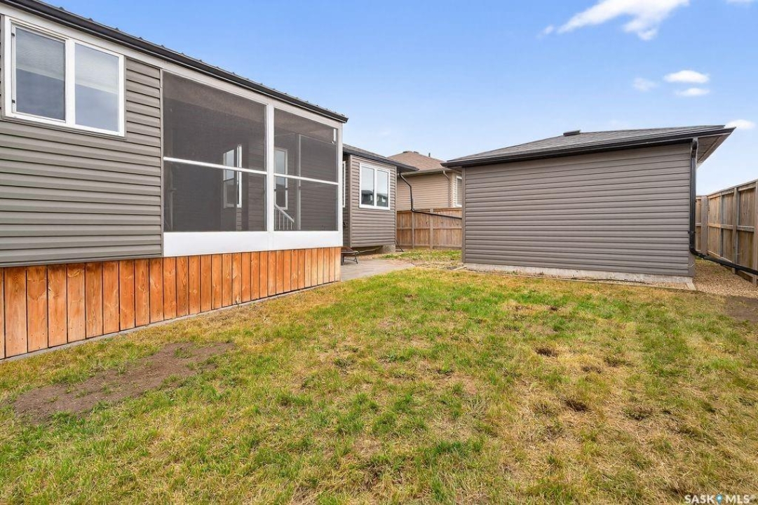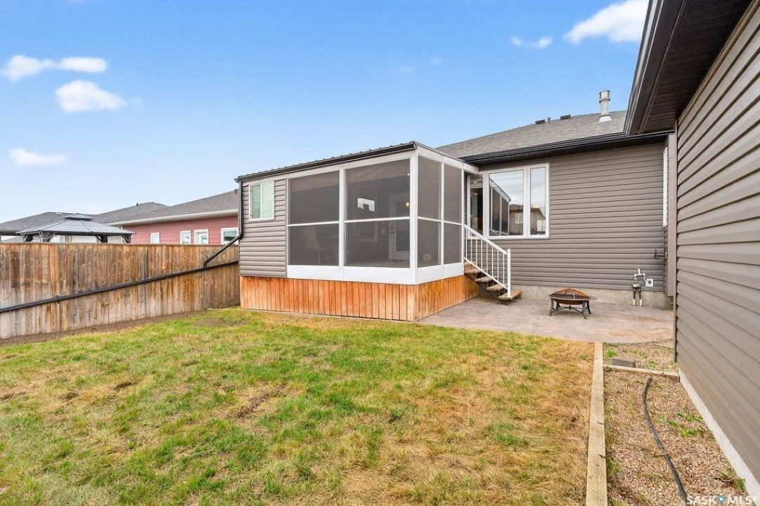 Welcome to 171 Wellington Drive! This beautiful 5-bedroom, 3-bathroom home, built in 2015, offers all the modern conveniences of newer construction. As you enter, you're greeted by 9-foot ceilings and a spacious foyer with direct access to the heated and insulated double attached garage. The main floor features hardwood flooring, stylish tiled bathrooms, and solid surface granite countertops throughout. The open-concept kitchen includes an oversized walk-in pantry, perfect for storage and organization. The living room boasts built-in cabinetry and a cozy gas fireplace, ideal for those chilly Saskatchewan winters. You'll also find main floor laundry for added convenience. The master bedroom includes a built-in window bench with cabinetry, a full 4-piece ensuite bath, and a walk-in closet. Two additional main floor bedrooms provide ample space for family or guests, along with another full 4-piece bathroom. The fully developed lower level offers a spacious family room, two more bedrooms, another 4-piece bath, a utility room, and a dedicated storage area. This home comes with all appliances included, as well as central air, central vac, a high-efficiency furnace, and hot water on demand. Outside, the property is fully landscaped and fenced, with underground sprinklers, a large shed (14' x 14' ) on a concrete pad, enclosed screened-in deck off the dining area—finished with authentic barnboard and privacy walls, making it perfect for three-season enjoyment. Located just around the corner from a newly opened school, this home is ideal for families seeking comfort, convenience, and quality. If this sounds like what you're looking for, don't miss your chance to take a peek!