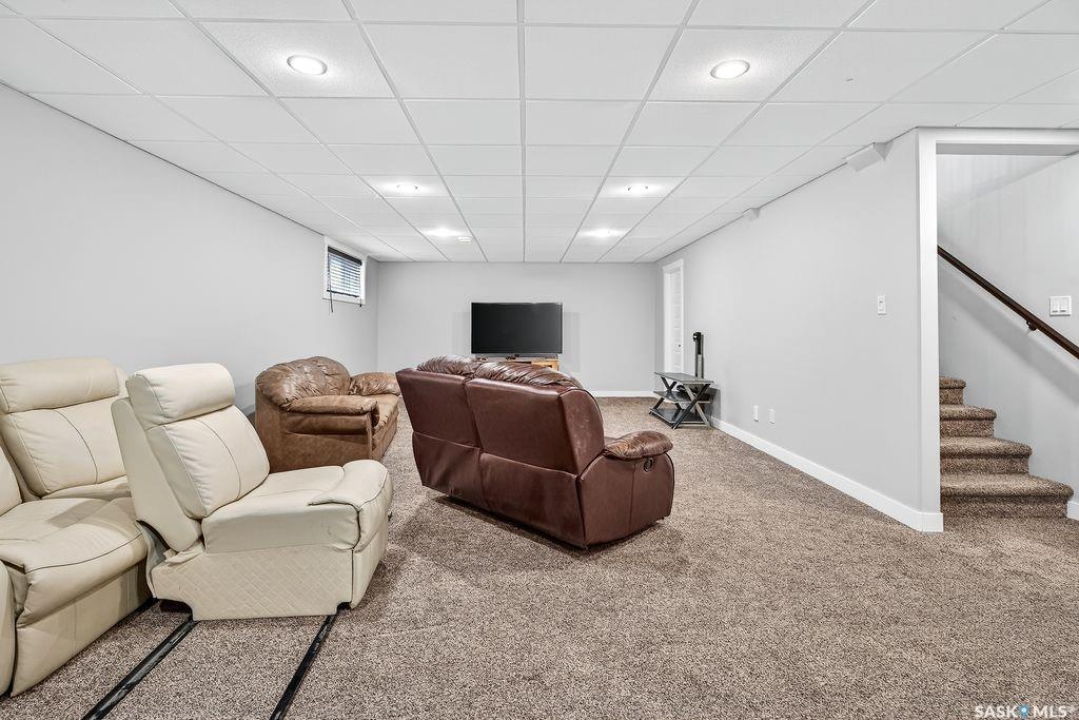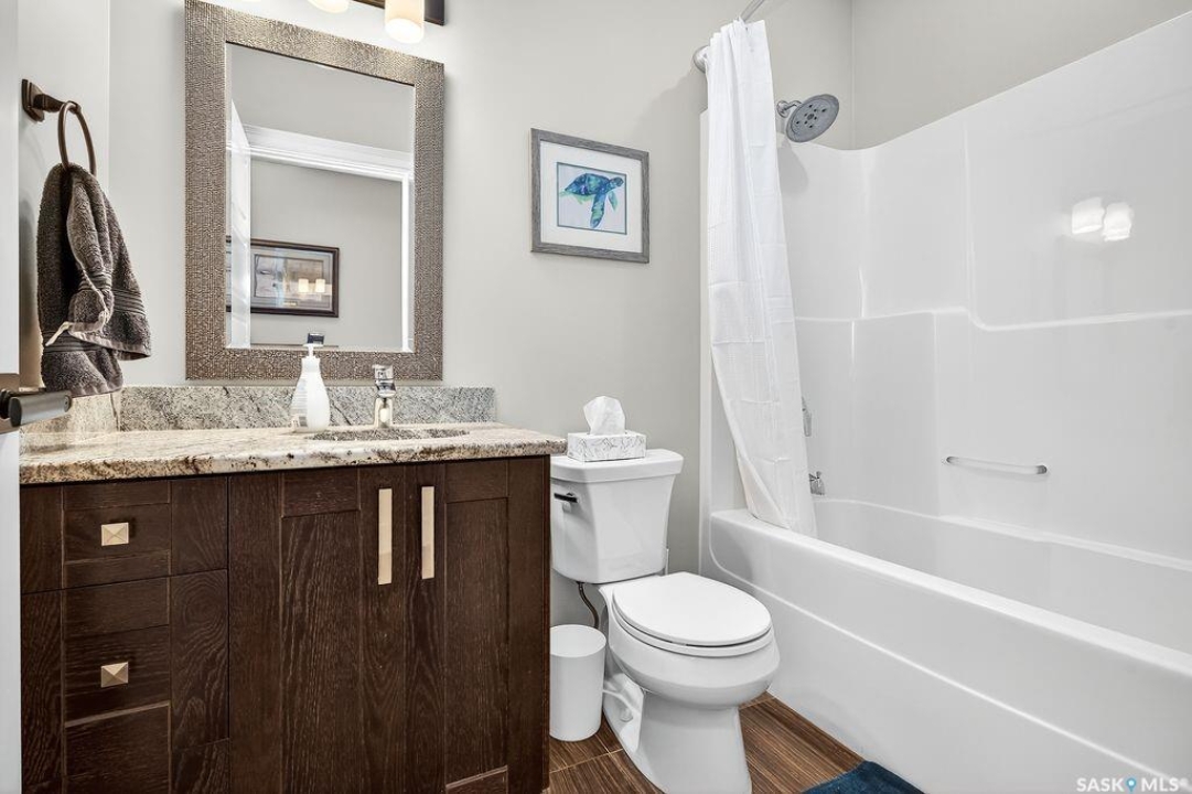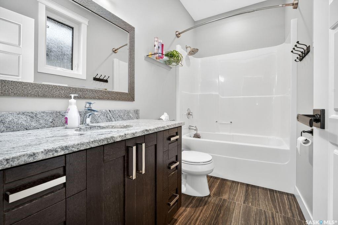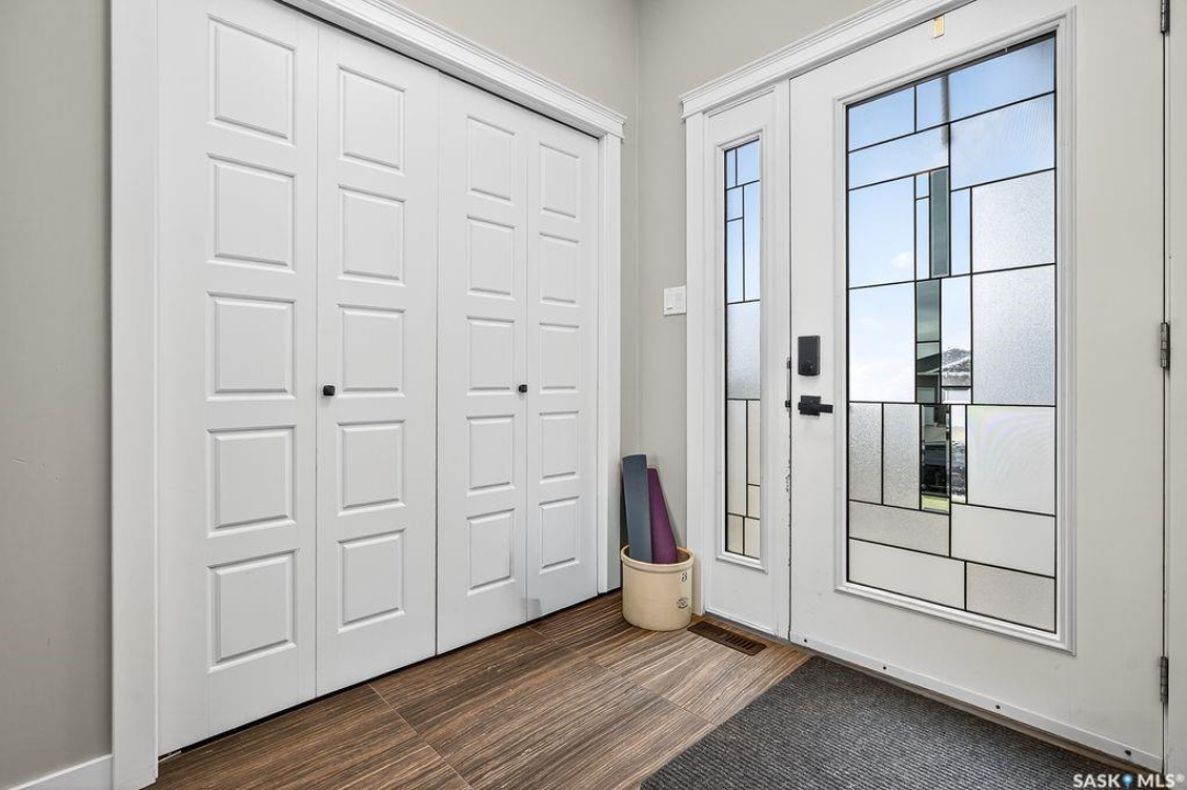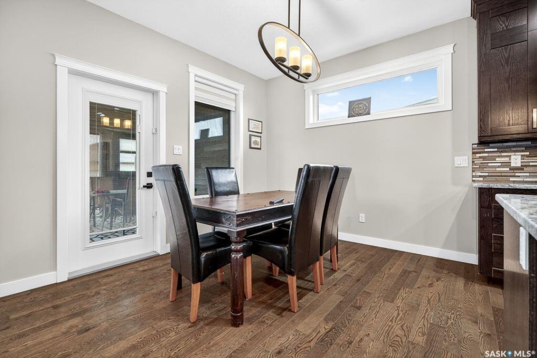 Welcome to 171 Wellington Drive! This beautiful 5-bedroom, 3-bathroom home, built in 2015, offers all the modern conveniences of newer construction. As you enter, you're greeted by 9-foot ceilings and a spacious foyer with direct access to the heated and insulated double attached garage. The main floor features hardwood flooring, stylish tiled bathrooms, and solid surface granite countertops throughout. The open-concept kitchen includes an oversized walk-in pantry, perfect for storage and organization. The living room boasts built-in cabinetry and a cozy gas fireplace, ideal for those chilly Saskatchewan winters. You'll also find main floor laundry for added convenience. The master bedroom includes a built-in window bench with cabinetry, a full 4-piece ensuite bath, and a walk-in closet. Two additional main floor bedrooms provide ample space for family or guests, along with another full 4-piece bathroom. The fully developed lower level offers a spacious family room, two more bedrooms, another 4-piece bath, a utility room, and a dedicated storage area. This home comes with all appliances included, as well as central air, central vac, a high-efficiency furnace, and hot water on demand. Outside, the property is fully landscaped and fenced, with underground sprinklers, a large shed (14' x 14' ) on a concrete pad, enclosed screened-in deck off the dining area—finished with authentic barnboard and privacy walls, making it perfect for three-season enjoyment. Located just around the corner from a newly opened school, this home is ideal for families seeking comfort, convenience, and quality. If this sounds like what you're looking for, don't miss your chance to take a peek!