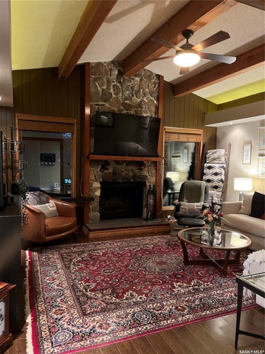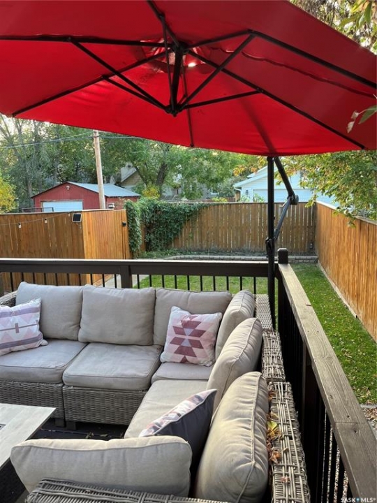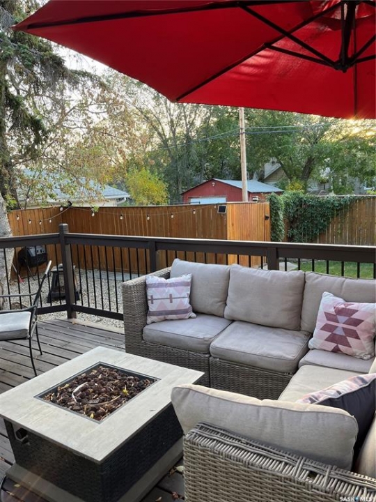 Absolutely beautiful one of a kind, spacious two bedroom one bathroom bungalow with true character. The original home had two additions in 1979 and 1981 with a beautiful dining room feature a beautiful sky light and feature shelving, as well as a spacious living room with cathedral ceilings and a wood fireplace in a fieldstone feature wall. This home features quality finishes. The backdoor opens out onto a spacious wraparound deck facing a beautifully landscaped and fenced backyard. Included in the sale is a patio table with chairs, a sectional, propane fire table, and two large umbrellas. The Smart Thermostat is included.There is a convenient lean too shed attached to the north side of the home. There are two parking spaces off a paved back lane. Plenty of space for a future double garage. We have the building plans from the City of Regina for both the dining room addition and the living room addition, that indicate that their foundations are built on piles, with crawl space. We also have an Engineer's Certificate. Showings are easy to book on Broker Bay.