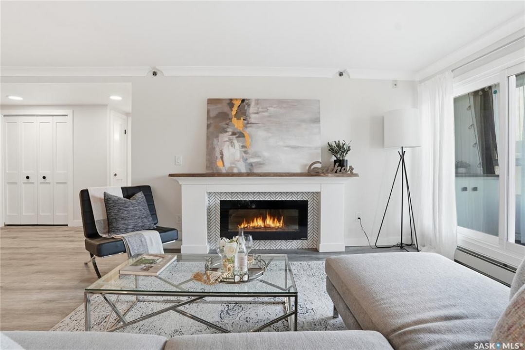 Welcome to The Wycliffe – A Rare City Park Gem! Experience modern elegance and timeless charm in this immaculate, 2-bedroom, 2-bathroom+den executive condo located in the heart of downtown Saskatoon. With over 1,475 sq.ft. of beautifully renovated living space, this third-floor suite offers the perfect blend of sophistication, comfort, and convenience at an unbeatable price! Step inside to discover a custom-designed kitchen featuring quartz countertops, a sleek tile backsplash, stainless steel appliances, and a massive island with seating — ideal for entertaining or everyday living. The kitchen opens seamlessly into a spacious living area, where a cozy fireplace with a classic live-edge mantle sets the tone for relaxed evenings at home. The primary suite is a true retreat, complete with a large walk-in closet and a stunning ensuite boasting a tiled glass shower. A second generous bedroom and a fully renovated 4-piece bath provide the perfect guest wing. Working from home? The private den with French doors offers the perfect quiet workspace. Highlights include: Covered breezeway deck – a unique feature of this unit, ideal for morning coffee or evening relaxation, crown molding throughout with newer paint, flooring, and trim, newer fridge and washer and dryer, newer windows and doors, wide hallways, and two elevators for convenience, covered parking stall included, beautifully maintained building with rooftop patio and welcoming common area. Perfectly positioned in Saskatoon's highly sought-after City Park neighborhood, you're just steps from the river, downtown core, Earls restaurant, shopping, and City Hospital. All buyers/buyer's agents to verify measurements. This condo must be seen to be appreciated – opportunities like this are rare! Book your private showing today.