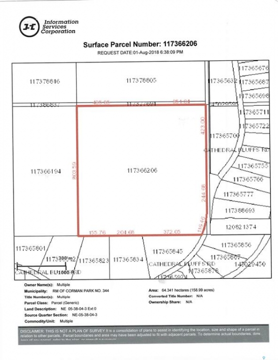 Excellent investment opportunity. A short scenic drive along the river past national historic Wanuskewan Park. Full 160 acres bordering high end country residential development of Cathedral Bluffs. Present zoning allows for 4 country residential permits of up to 5 acres with balance being agriculture residential also with building permit. Future development possible with RM of Corman Park and Hamlet of Cathedral Bluffs approval. Paved access from City of Saskatoon.