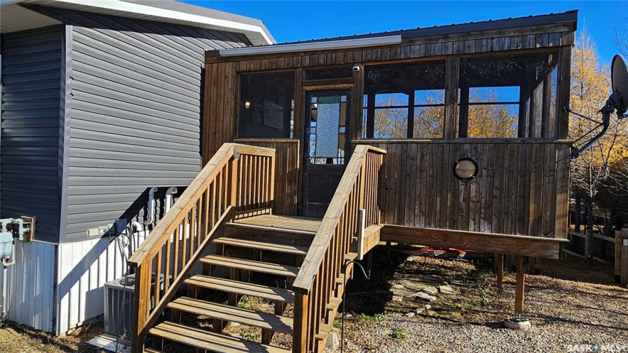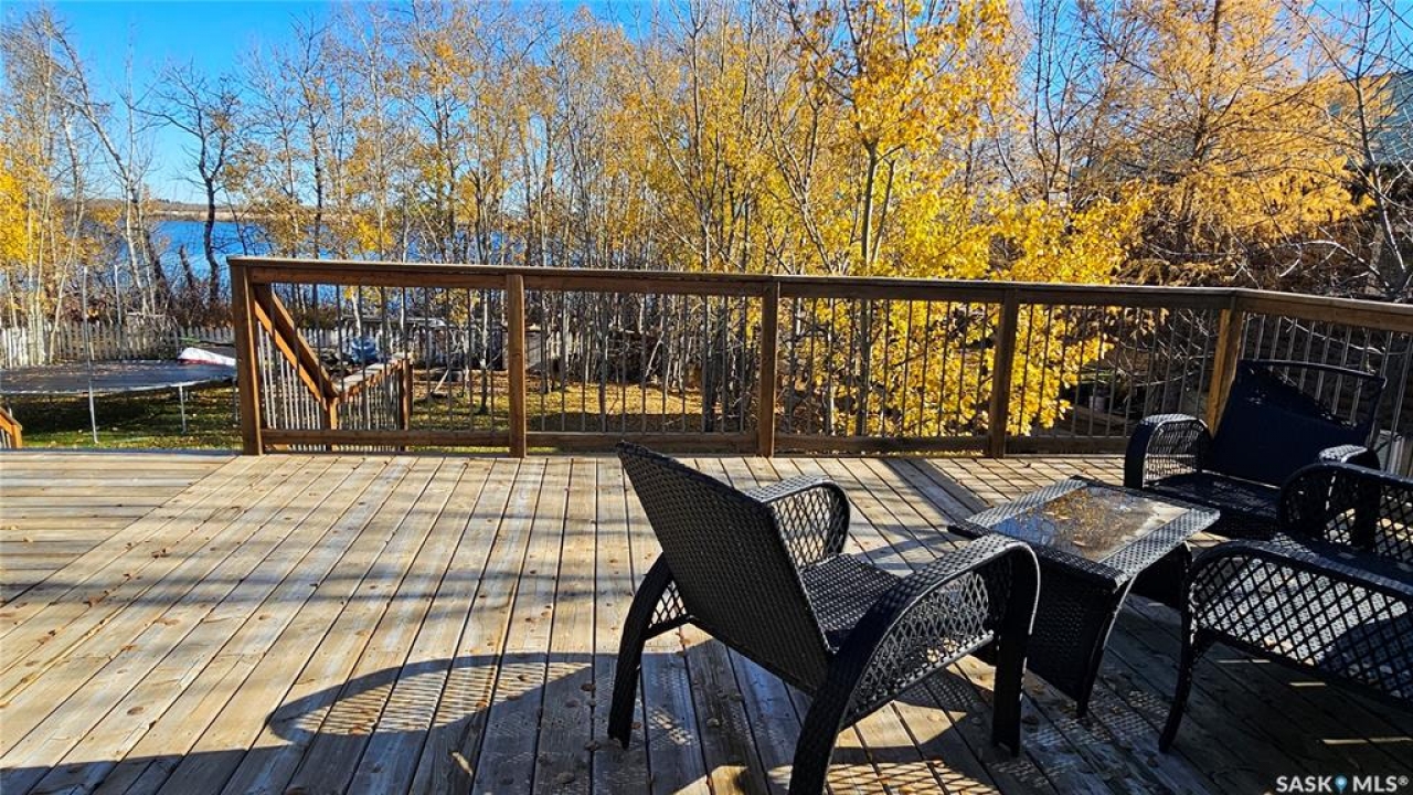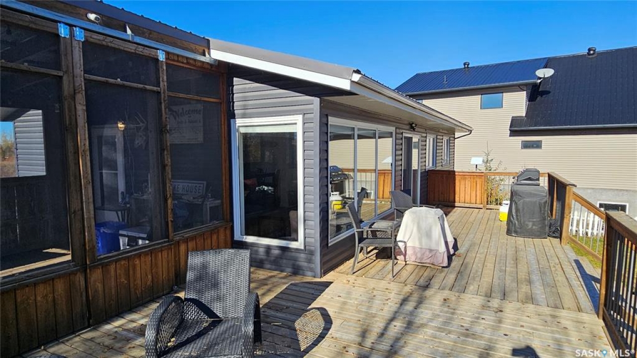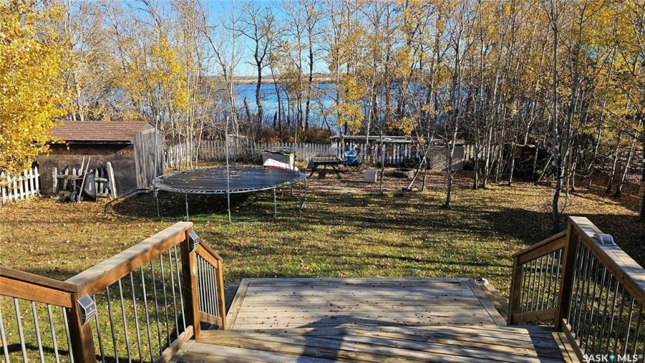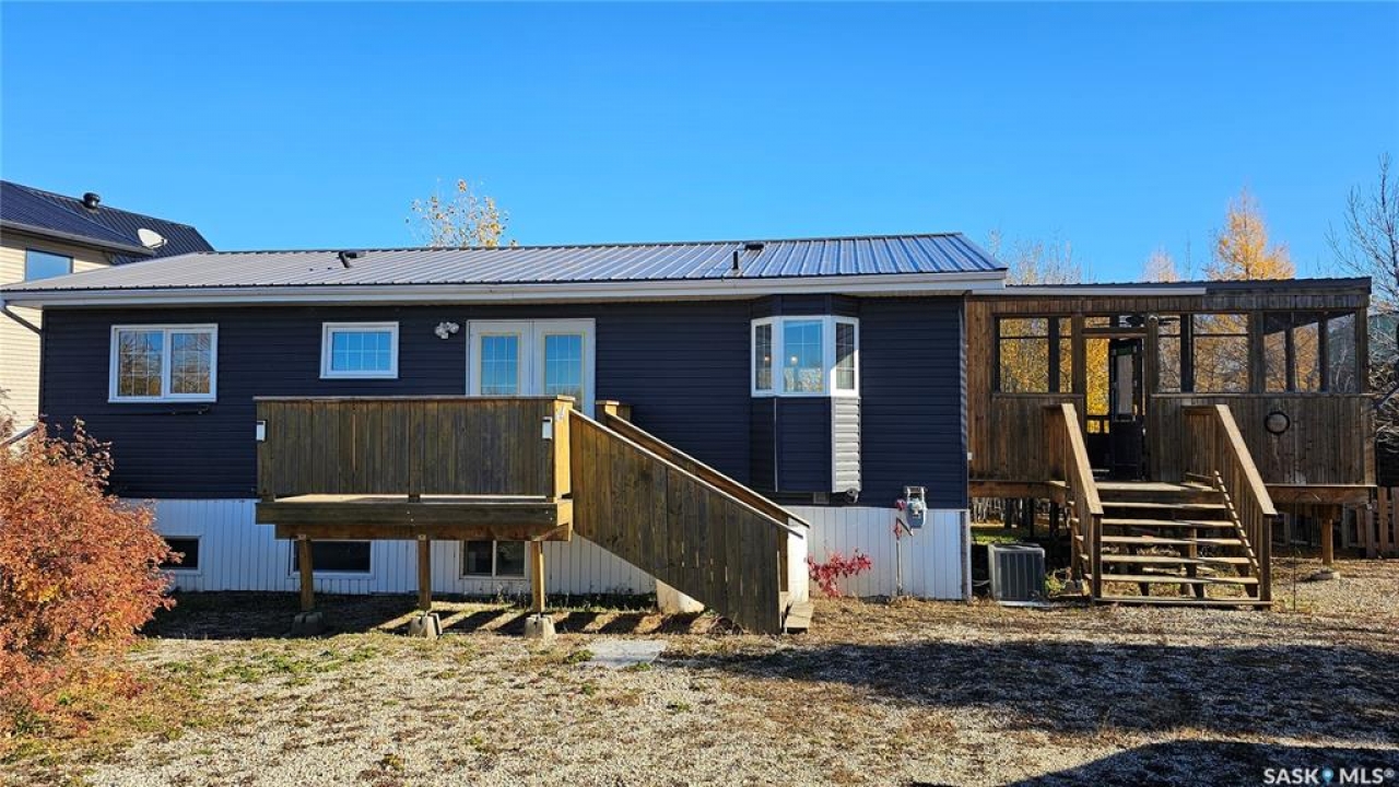 Enjoy year-round lakefront living at 38 Lucien Lakeshore Drive, a 960 sq ft four-season bungalow with direct water access and no stairs to the shore. This cabin offers 4 bedrooms and 2 bathrooms (3 up, 1 down + potential 5th bedroom). The bright open-concept kitchen, dining, and living area features large lake-facing windows and stainless-steel appliances, including an island and bay-window nook. A large screened-in covered porch welcomes you at the entry—perfect for extra seating or summer dining. The spacious deck overlooks the yard and provides plenty of space for BBQs and outdoor furniture. The level yard has room for kids to play, a firepit area, and two storage sheds—one oversized for lake gear and one smaller for tools or toys. The basement is built with ICF walls, offering high ceilings and a partially finished layout including laundry, a 3-piece bath, and one bedroom, with room to add another. Utilities and features include: 1,800 gal. water storage (hauled from Middle Lake), 2,500 gal. septic tank, Metal roof, Vinyl plank flooring throughout, Central air conditioning, Sump pump, Starlink internet equipment included. Located about 35 km North of Humboldt, Lucien Lake is a popular family-friendly destination with a regional park, sandy beaches, boat launch, and excellent fishing for walleye, northern pike, and perch. This move-in-ready lakefront property offers great indoor and outdoor space, modern utilities, and one of the most accessible waterfront lots on Lucien Lake—ideal for both summer fun and year-round enjoyment.
