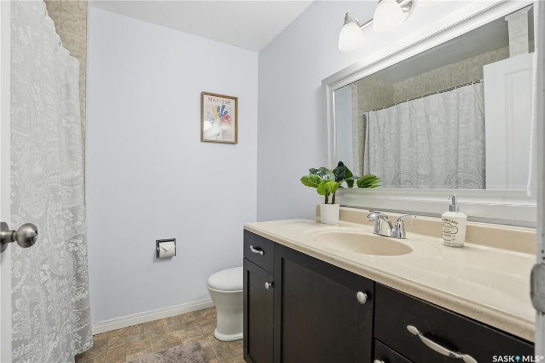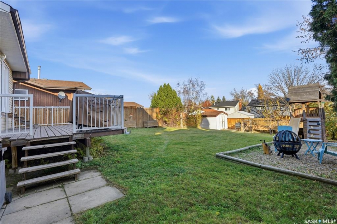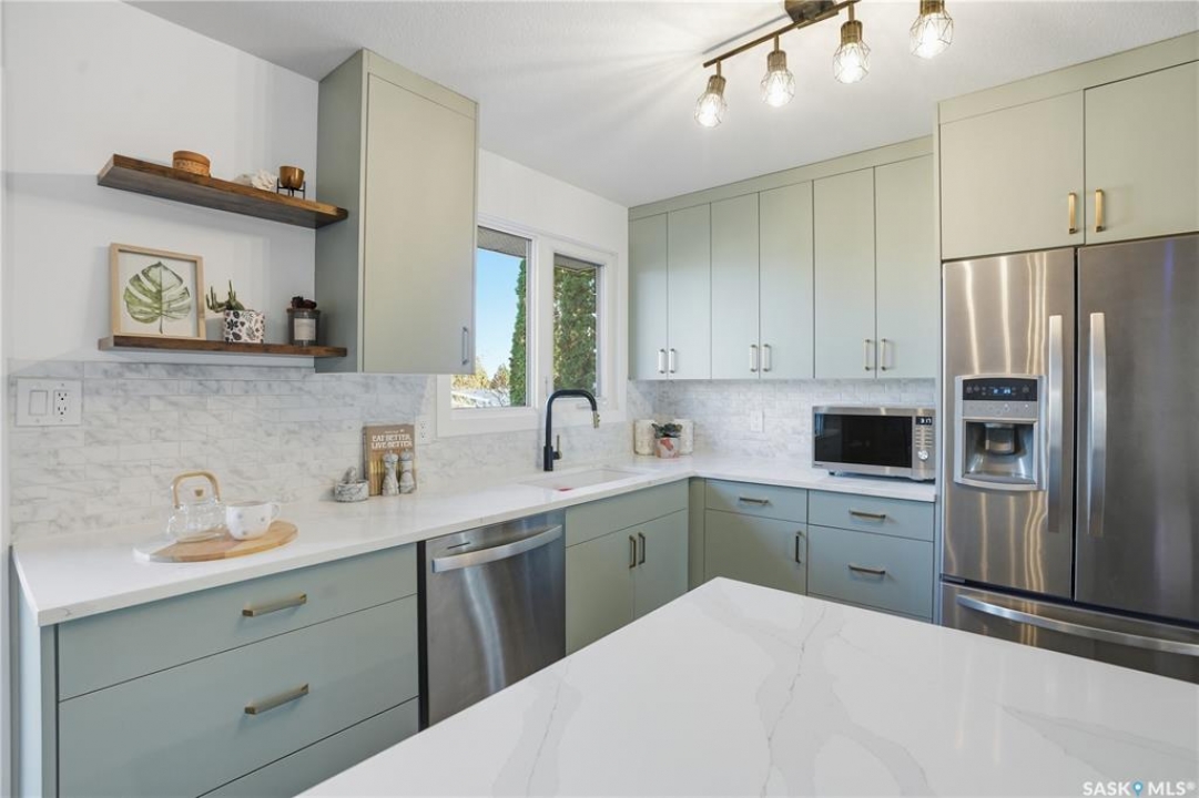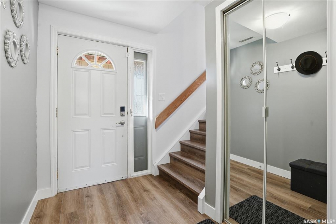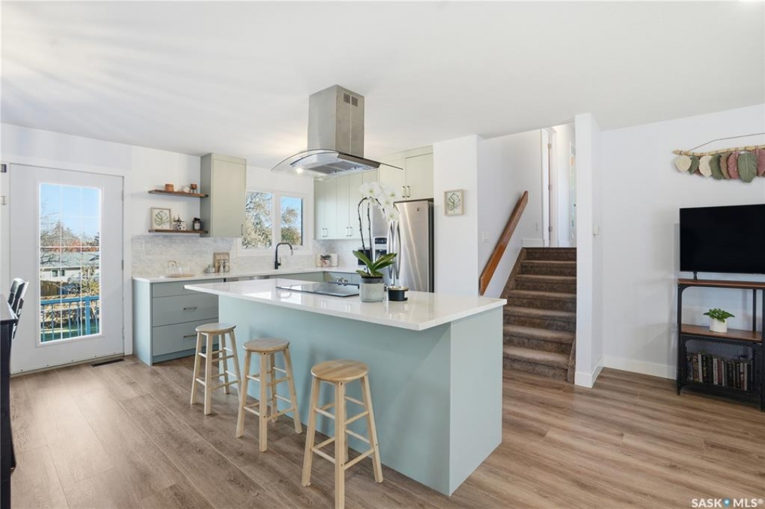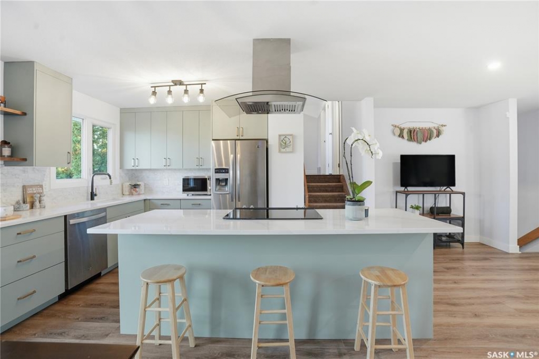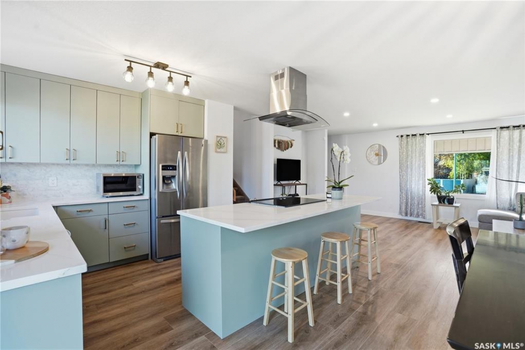 Welcome to 415 Wathaman Crescent, a stylishly updated split-level home nestled in one of Saskatoon's most desirable north-end neighborhoods. The main level showcases a stunning renovation featuring a brand-new custom kitchen with quartz countertops, a large sit-up island with cooktop and built-in oven, and sleek stainless steel appliances. The kitchen opens seamlessly to the dining and spacious living areas, highlighted by premium water-resistant laminate flooring and a new ceiling with recessed lighting. Upstairs, you'll find a comfortable primary suite complete with a walk-in closet and a private 2-piece ensuite. Two additional bedrooms and a modern 4-piece bathroom complete this level. The third level, situated at ground level, offers a welcoming foyer and a fourth bedroom. The single attached garage provides direct entry and is equipped with cabinetry, a workspace, and convenient parking. On the fourth level, you'll find another full 4-piece bathroom, a cozy family room with a Murphy bed for guests, and a utility/laundry room with additional storage space. Outside, the home features a durable rubber asphalt driveway, a private, fully fenced backyard with an attached deck, garden boxes,play structure, raspberry bushes, and apple trees—perfect for outdoor living. This move-in-ready home combines thoughtful updates, functional design, and a prime location—ideal for families or anyone seeking comfort and style in Saskatoon's north end. Very close to schools, parks, the river and all northend amenities. A true north end gem at a great price!