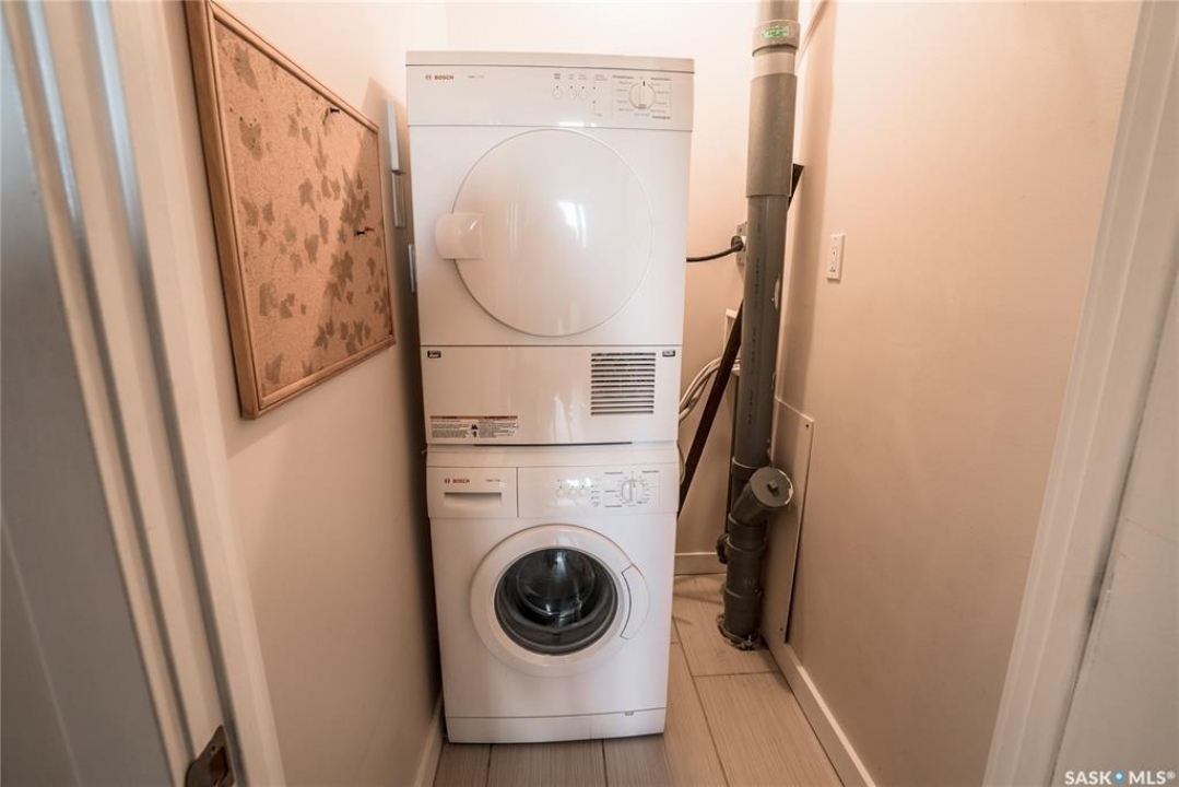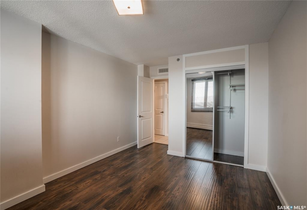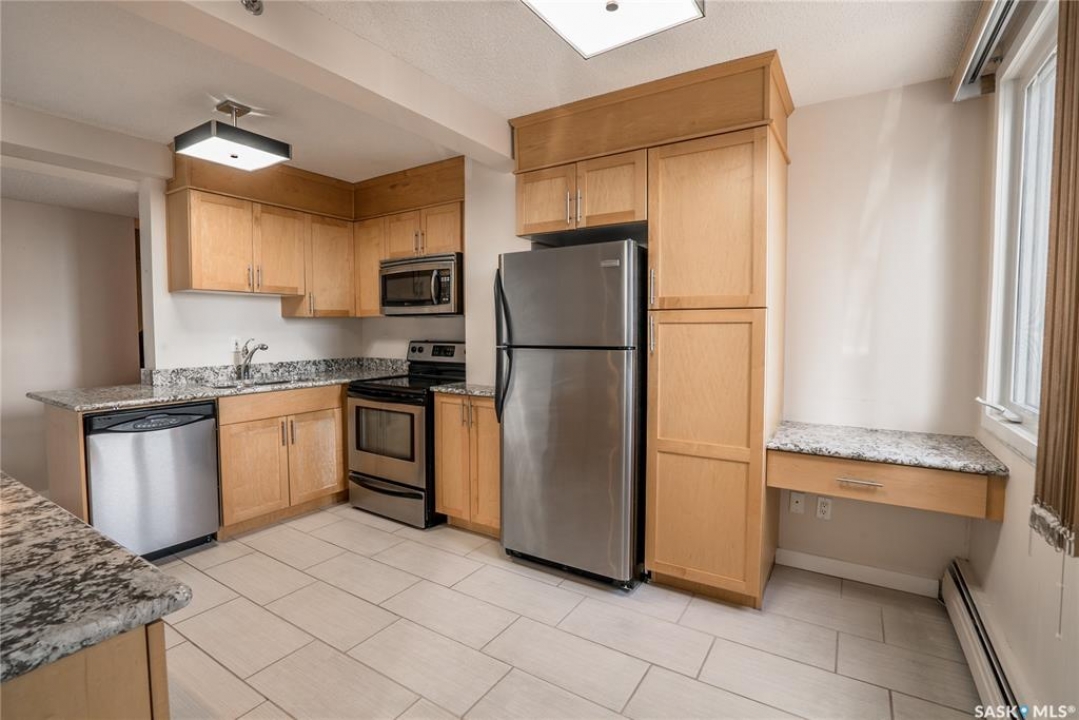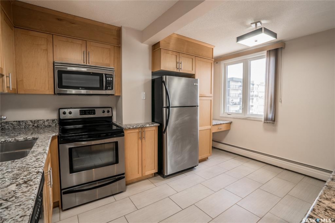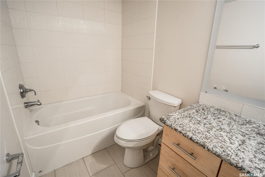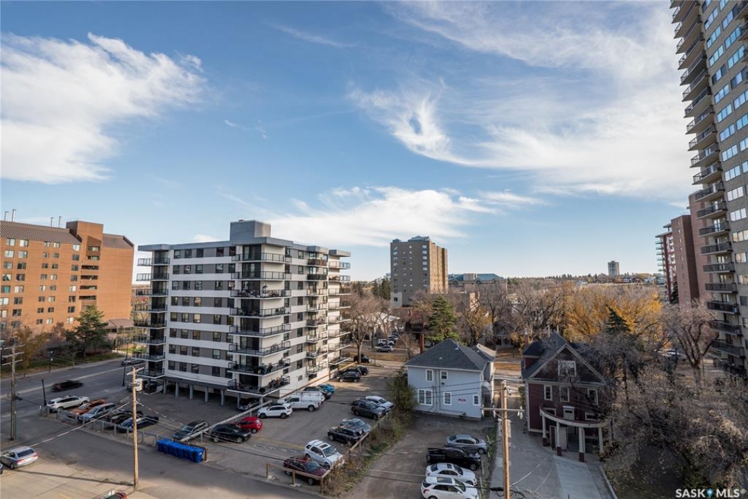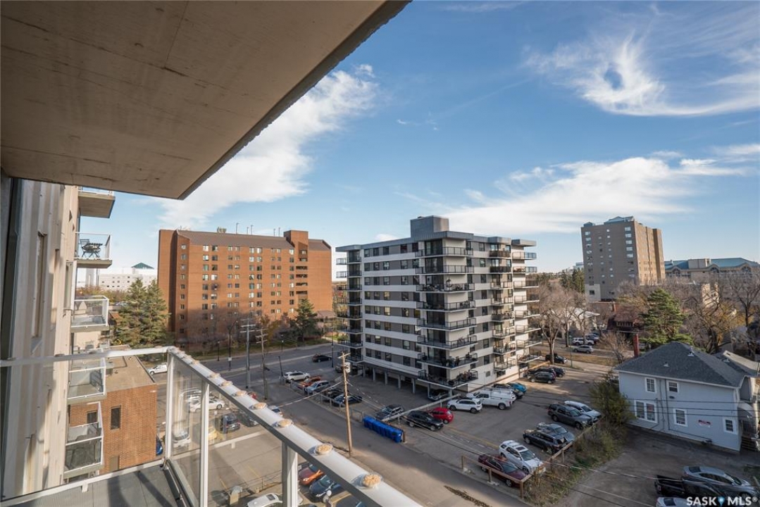 Experience the heart of Saskatoon's vibrant downtown with this stylish one-bedroom apartment in 'The View' building. This seventh-floor condo is an ideal choice for professionals, students, or investors. Enjoy a modern kitchen featuring granite countertops, stainless steel appliances, and a practical island with a breakfast bar. The four-piece bathroom also boasts a granite countertop and a tiled tub surround. The spacious bedroom can easily accommodate a king-sized bed. The living area is brightened by large windows and patio doors leading to a private deck. Building amenities elevate your lifestyle with an on-site fitness centre, in-suite laundry, and two rooftop patios offering panoramic views. One dedicated parking stall is included for added convenience. Location is key: you're just a stroll away from eateries, pubs, public transport, and the Meewasin river trail. Proximity to the University of Saskatchewan makes this a superb hub for academia and healthcare. Don't miss this opportunity and get in today.