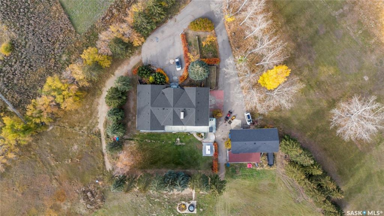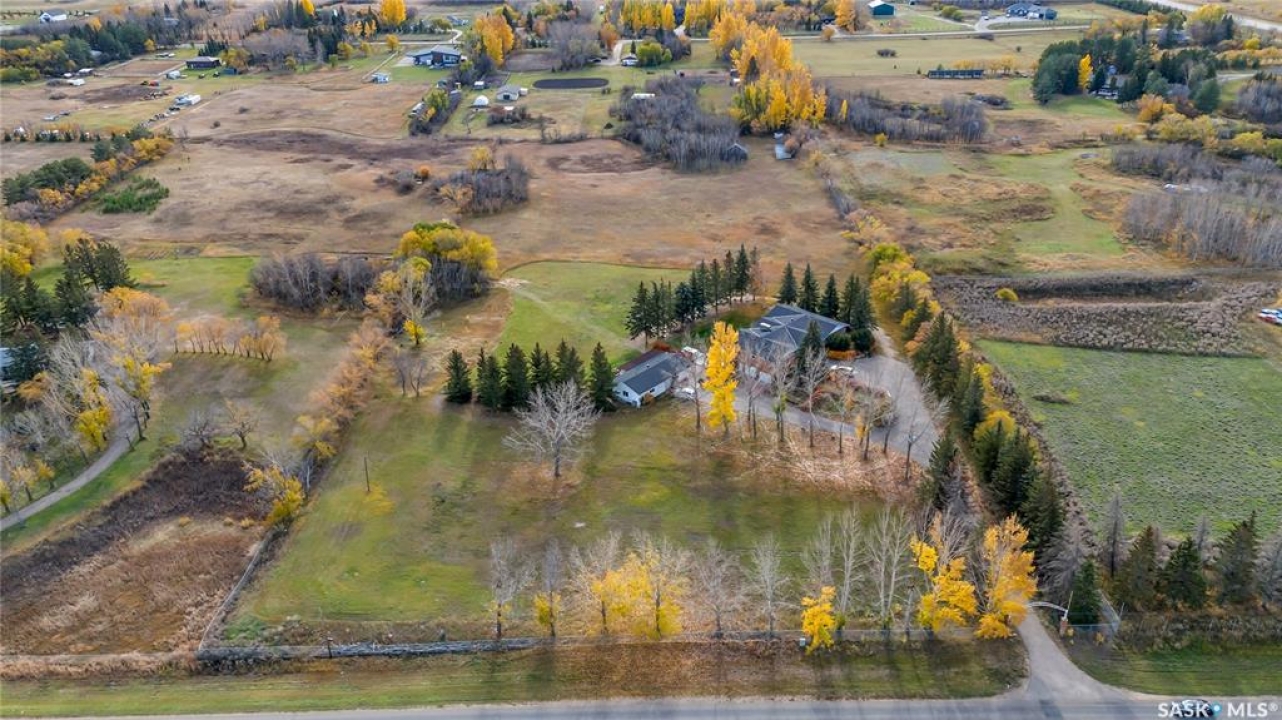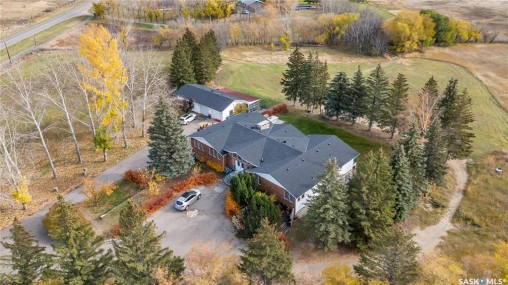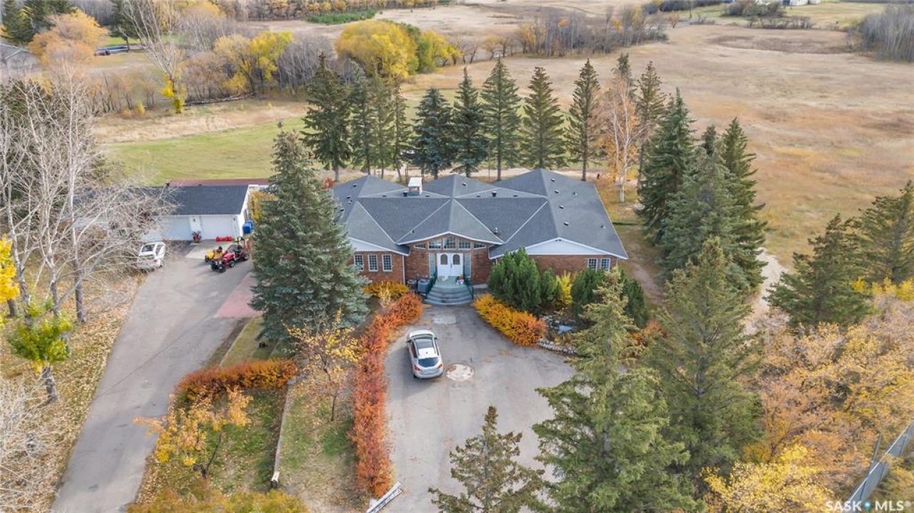 This remarkable estate combines luxurious residential living with expansive potential, offering a total of 9.06 acres. The property includes a 4.6-acre developed residential area with mature landscaping and a 3,447-square-foot walk-out bungalow (excluding the lower level) featuring five bedrooms and five bathrooms. With an open floor plan and formal spaces such as a 16' x 13.9' dining room, a 17' x 22' living room, and a gracious foyer, this home is designed for both comfort and elegance. Additional highlights include two wood-burning fireplaces, a spacious kitchen with an eating area, balconies, covered patio spaces, a double attached garage, a double detached garage, and a greenhouse. The remaining land is a natural lot, adding privacy and beautiful green space surrounding the residence. Additionally, this property offers potential for a zoning shift to commercial use, supported by nearby properties that have successfully made this transition. For those interested in expansion, an additional 5-acre parcel adjacent to the west side of the backyard is available for potential acquisition. This unique 9.06-acre estate, minutes from Saskatoon, offers an ideal blend of private, luxurious living with flexible zoning possibilities.