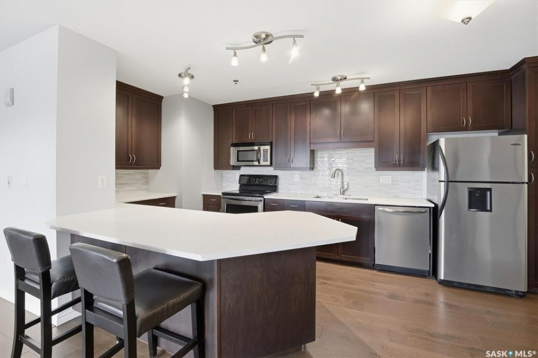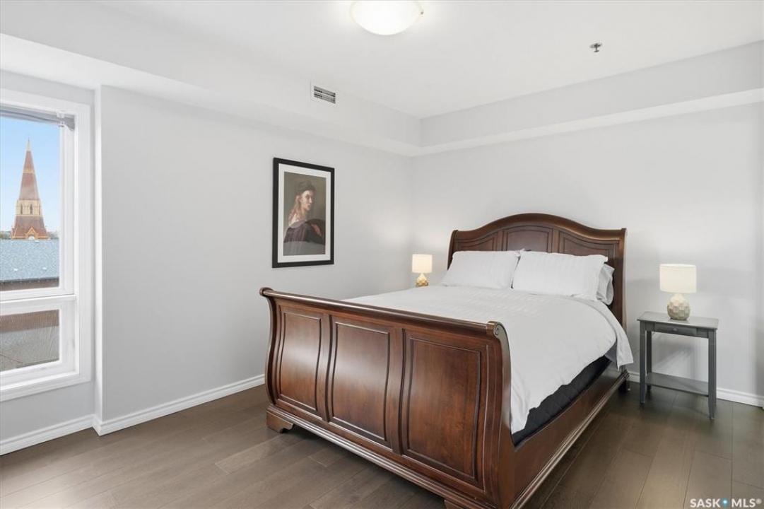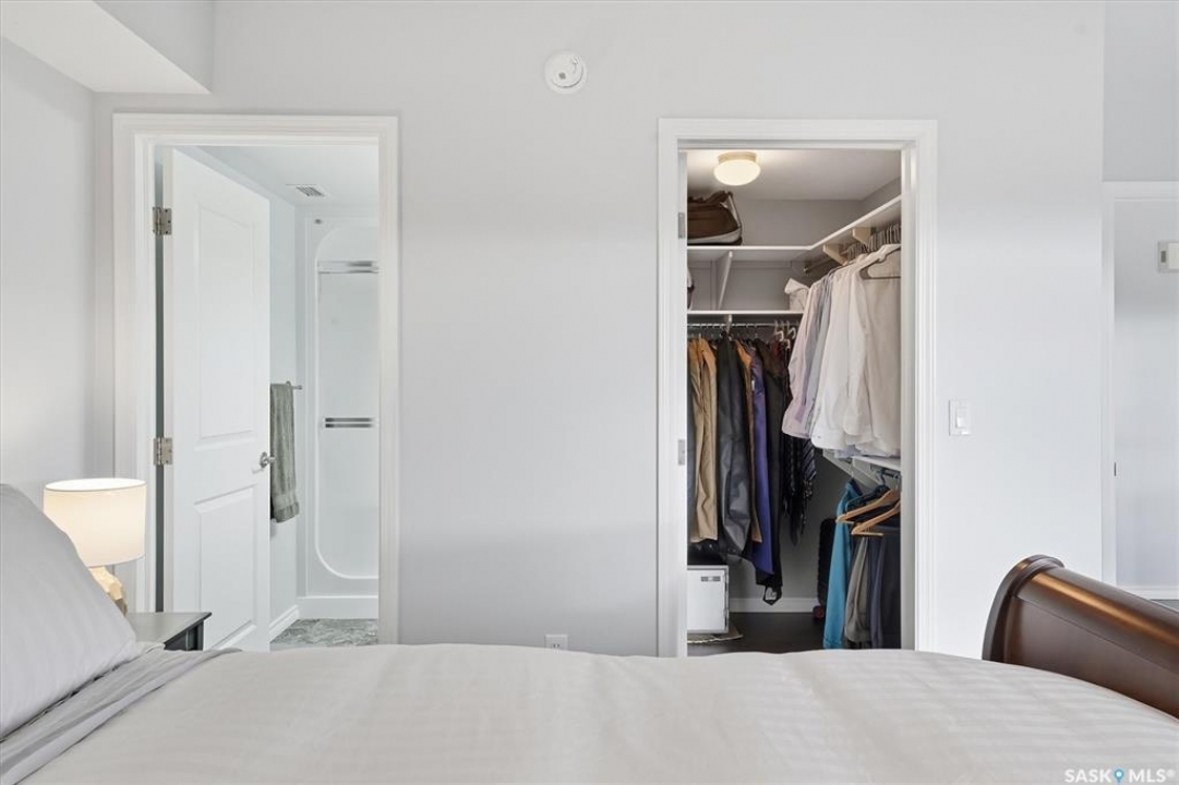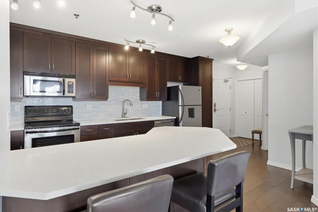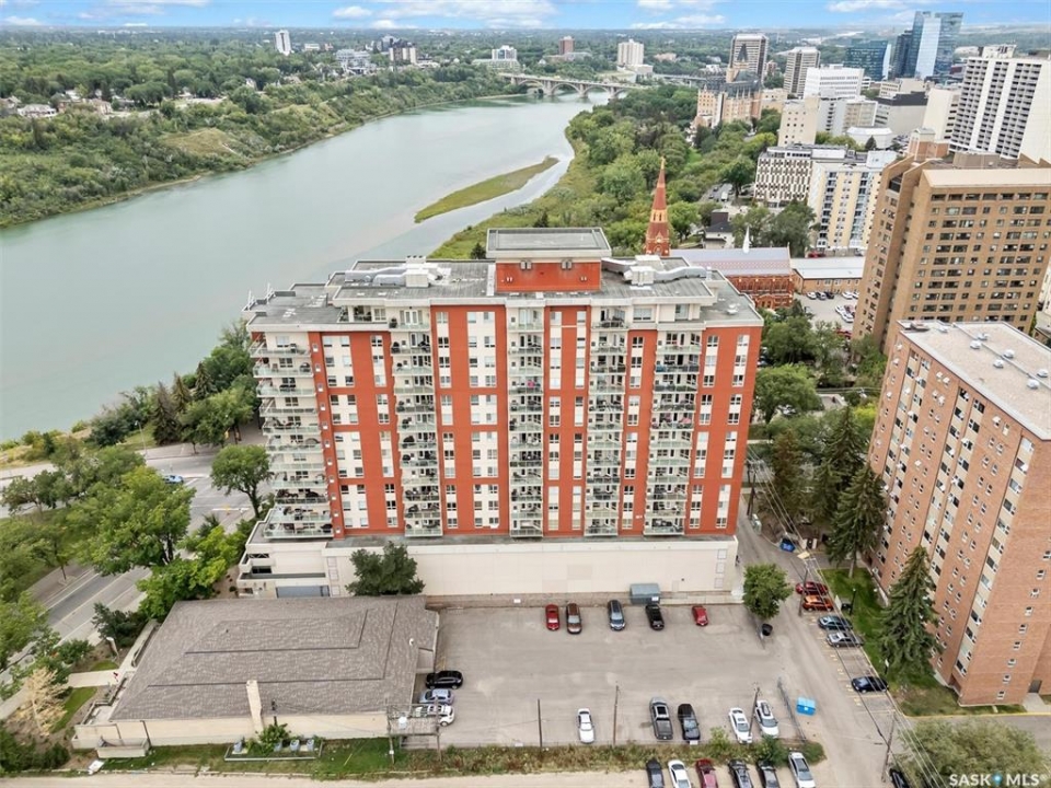Experience riverfront living in this stunning southeast-facing LUX condo in the heart of downtown Saskatoon. Offering 1,155 sq ft, this 2-bedroom, 2-bath unit features an UPDATED bright, open floor plan designed to take full advantage of the natural light and breathtaking river views. The kitchen is beautifully finished with modern cabinetry, newer gleaming quartz countertops, and stainless steel appliances, opening to a spacious living and dining area with newer engineered hardwood flooring throughout. Two spacious bedrooms, 2 full baths, and a primary walk-in closet, plus an in-suite storage/laundry room, complete this lovely floor plan. Enjoy relaxing or entertaining on the private balcony with a natural gas BBQ hookup, overlooking the river, Bessborough, and Broadway Bridge. This unit includes 1 heated underground parking stall and a heated storage unit for added convenience. The building offers fantastic amenities, including a fitness room, a meeting room, and two guest suites. Ideally located along the Meewasin River Trail and park and steps from downtown restaurants, shops, and entertainment- the best of what our city offers!!