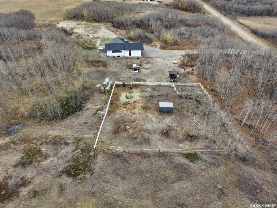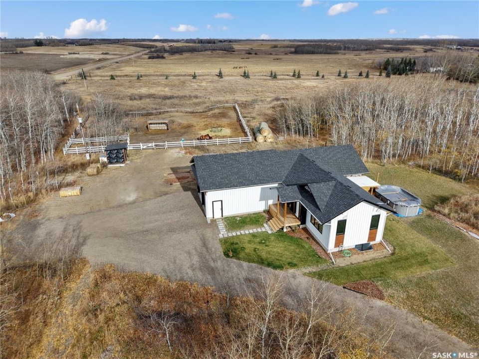 Welcome to this nearly-new acreage just 15 minutes from Saskatoon, offering modern efficiency, natural gas heat, Starlink internet, and horse-ready infrastructure already in place. Surrounded by mature trees and rolling hills. Built in 2024, this 1,353 sq/ft bungalow features an open concept main floor, quality finishes, and a bright, functional layout. 3 bedrooms and 2 bathrooms upstairs. The lower level is wide open and ready for future development, with space for two more bedrooms, a family room, and a bathroom. Plumbing for the bathroom and wet bar is already roughed in. The basement will be framed, insulated and poly'd prior to sale. The oversized 26'x30' attached garage is insulated and provides ample parking, storage and work space. Situated on 5.02 private acres, the yard is partially fenced for horses and includes a tack shed with electricity, horse shelter, automatic watering bowl with room to expand. Properties with horse setup and natural gas are increasingly rare in this price category. Excellent water along with RO drinking water system, reliable road access, and a short commute to the city make everyday living easy. Enjoy quiet country privacy with convenience.