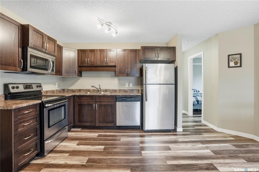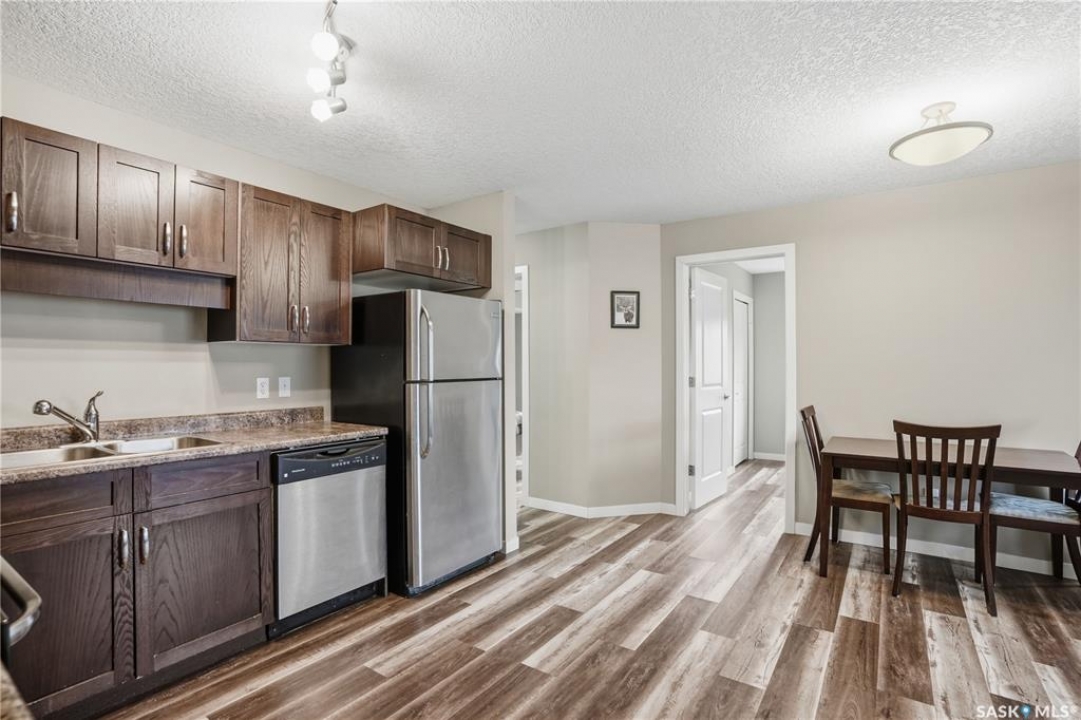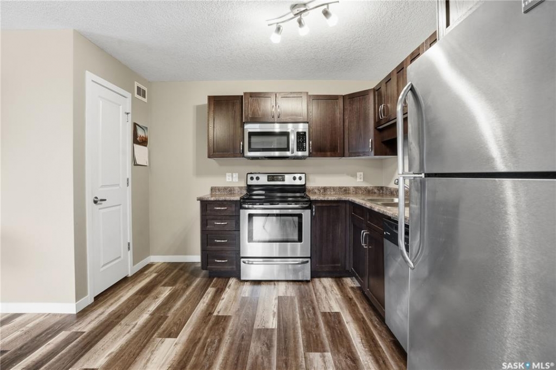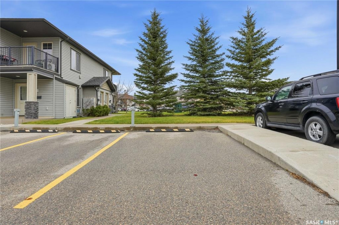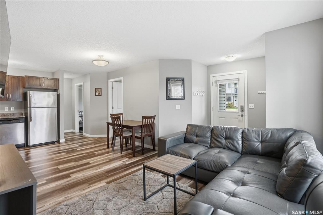Exceptional condo in the heart of Harbour Landing is a great starter home or investment. Shows 10/10, this owner occupied 2 bedroom, 1 bathroom condo has been very well kept by its owner. Quiet development. Main floor unit. Open concept living room, breakfast nook area and kitchen with stained maple cabinetry, plenty of cupboard space and additional pantry storage. Both bedrooms are bright and spacious. Full bathroom. Laminate flooring throughout. Tankless water heater and in-floor heat throughout the condo. BONUS is 2 electrified parking stalls! Condo fees are $200.56 per month and include common area maintenance and insurance, reserve fund, snow removal and lawn care, garbage pick up. Pets are allowed with restrictions. Close to all south end amenities of Grasslands and easy access to Highway #1 and the Regina Bypass.