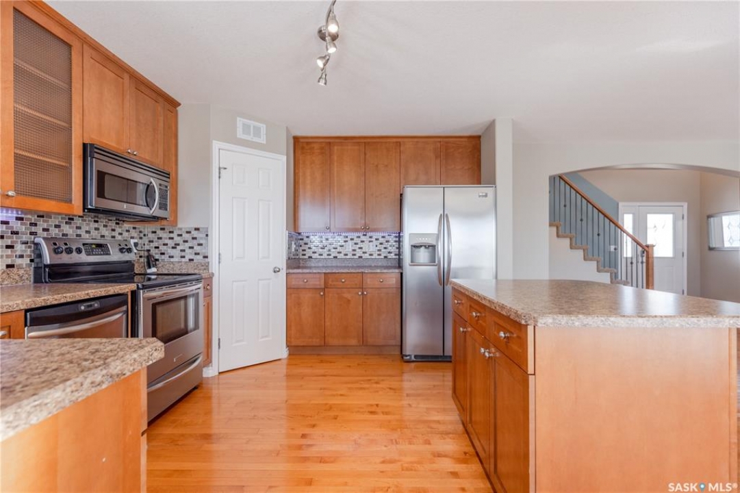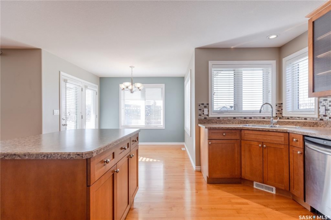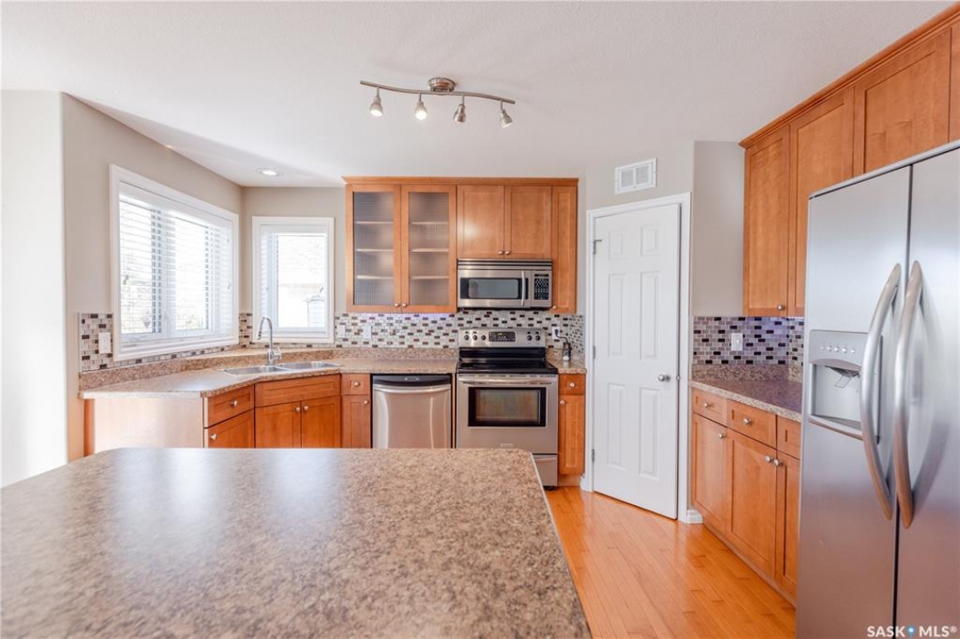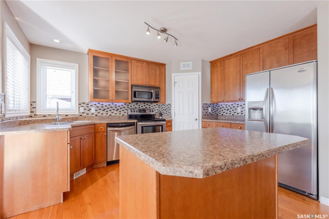 Pride of ownership is evident throughout! Check out this 4 bedroom, 4 bath, 2 Storey located on a family friendly street in Hampton Village backing Al Anderson Park. Upon entering, you are greeted with a spacious foyer. The main floor features an open concept, great for entertaining and family time. The kitchen has an island, a corner pantry, stainless steel appliances and a separate eat-in dining area. The main floor also offers a 2-piece bath and main floor laundry. On the second level you will find a spacious primary bedroom with a walk in closet and a 3-piece ensuite, as well as 2 additional bedrooms and a 4-piece bath. The lower level is totally developed, featuring a family room, a bedroom with a walk in closet, a 3-piece bath and storage area. The double attached heated garage, with direct entry, has been freshly painted. Enjoy the beautiful Saskatchewan sunsets and view of the park, on the maintenance free covered deck. Additional features: gazebo, fire pit, newer shingles, central air conditioning, under ground sprinklers, RV parking, high efficiency furnace and water heater.