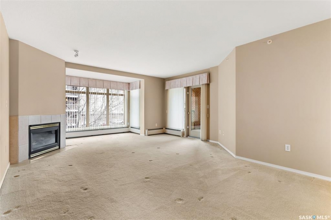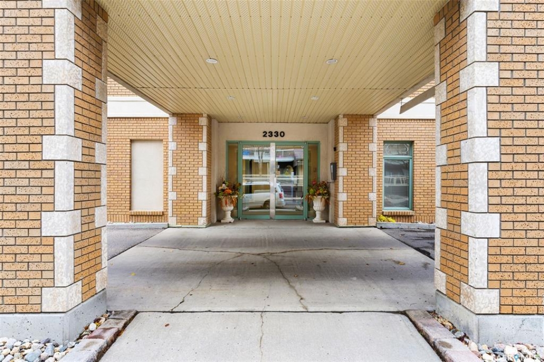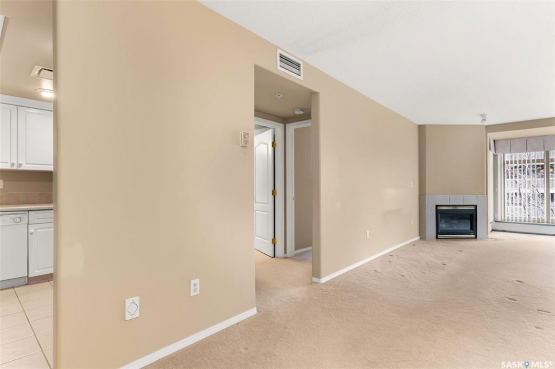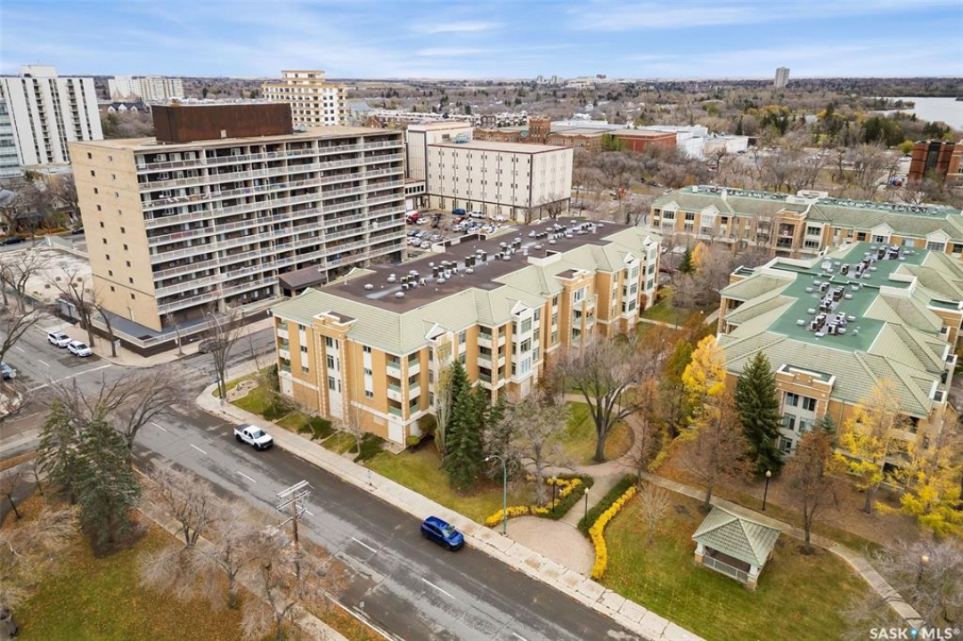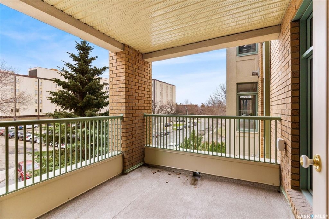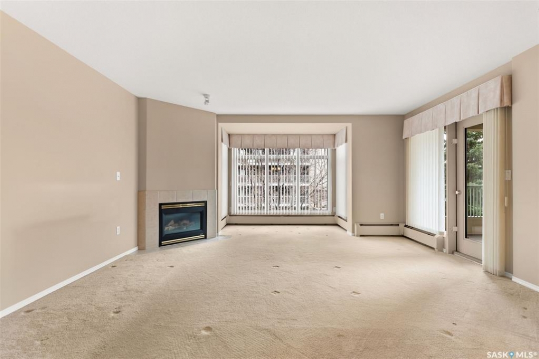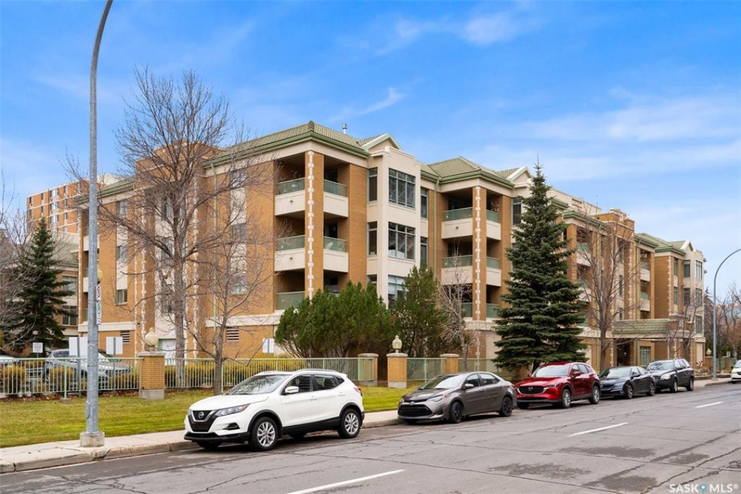 Experience the height of elegant, easy living in this impressive executive condo in the highly sought-after College Park community. Offering 1,338 square feet of thoughtfully designed space, this third-floor unit is filled with natural light and features an open-concept layout ideal for relaxing or entertaining. Step into a grand tiled foyer that leads to the spacious main living area. The inviting living room is anchored by a cozy gas fireplace and a sunlit alcove surrounded by windows—perfect for reading, working, or unwinding. The dining area easily accommodates a large table, while the well-appointed kitchen offers ample cabinetry, white appliances including a built-in oven and cooktop, and generous counter space. A covered east-facing balcony provides a peaceful retreat for morning coffee, complete with a gas BBQ hookup for outdoor dining. The spacious primary suite includes a large walk-in closet and a sleek three-piece ensuite with an oversized shower. A second bedroom offers flexible space for guests or a home office, with a four-piece main bath nearby. Additional conveniences include in-suite laundry with shelving, custom blinds, central air, and elevator access. This condo also includes a 120-square-foot secure storage room and a heated underground parking stall (#31). Residents enjoy an amenities room with games and fitness equipment, a parkade car wash, off-street visitor parking, and a same-floor garbage chute. Steps from Wascana Park, shopping, dining, and essential services, it's also within walking distance to downtown, Darke Hall, and the refurbished Globe Theatre. Enjoy refined urban living at its best—condo fees cover heat, water, sewer, garbage/recycling, exterior maintenance, lawn care, snow removal, building insurance, and reserve fund contributions. Contact your realtor for more information or a private tour.