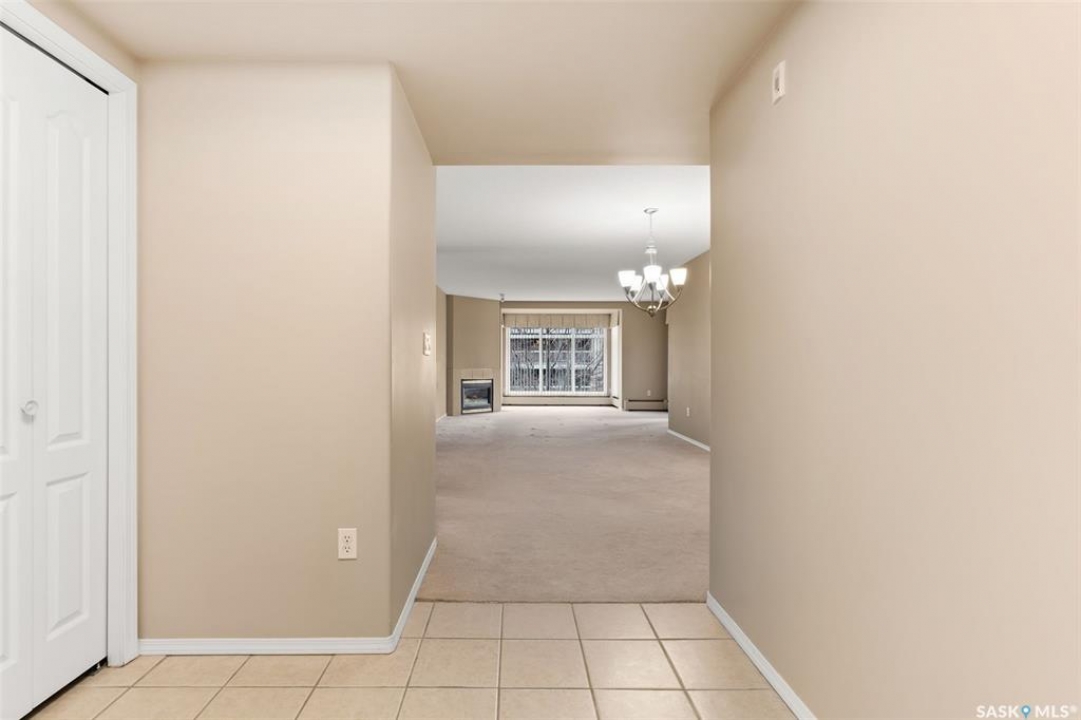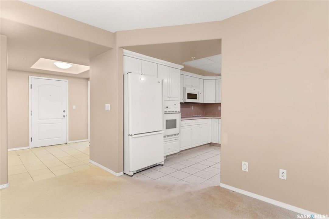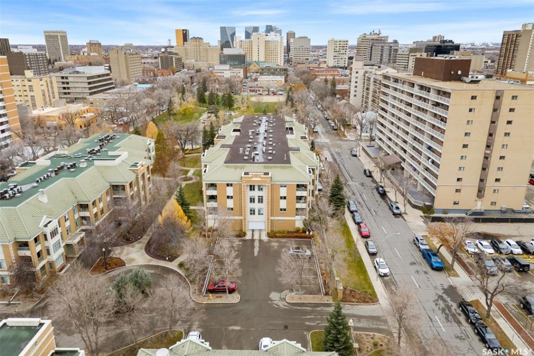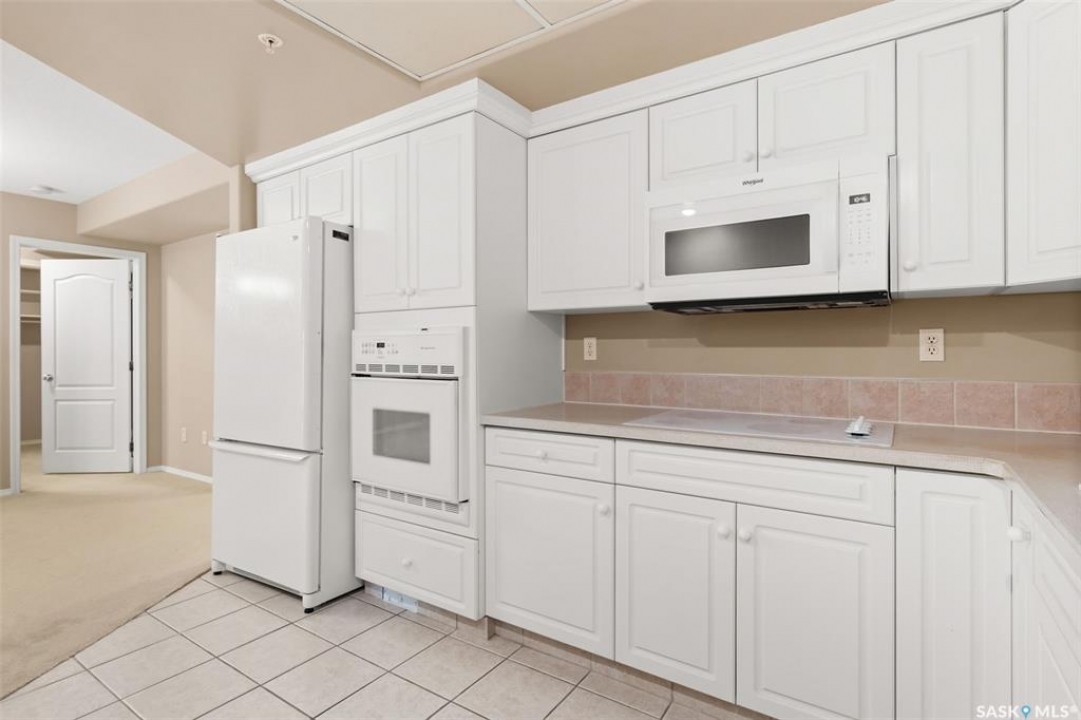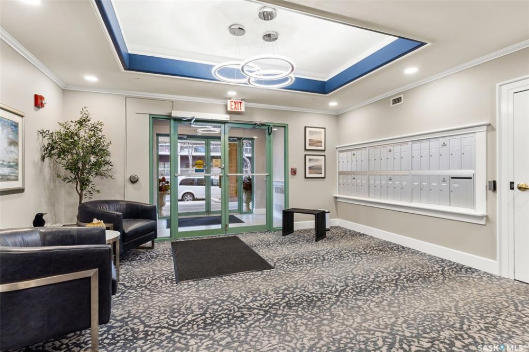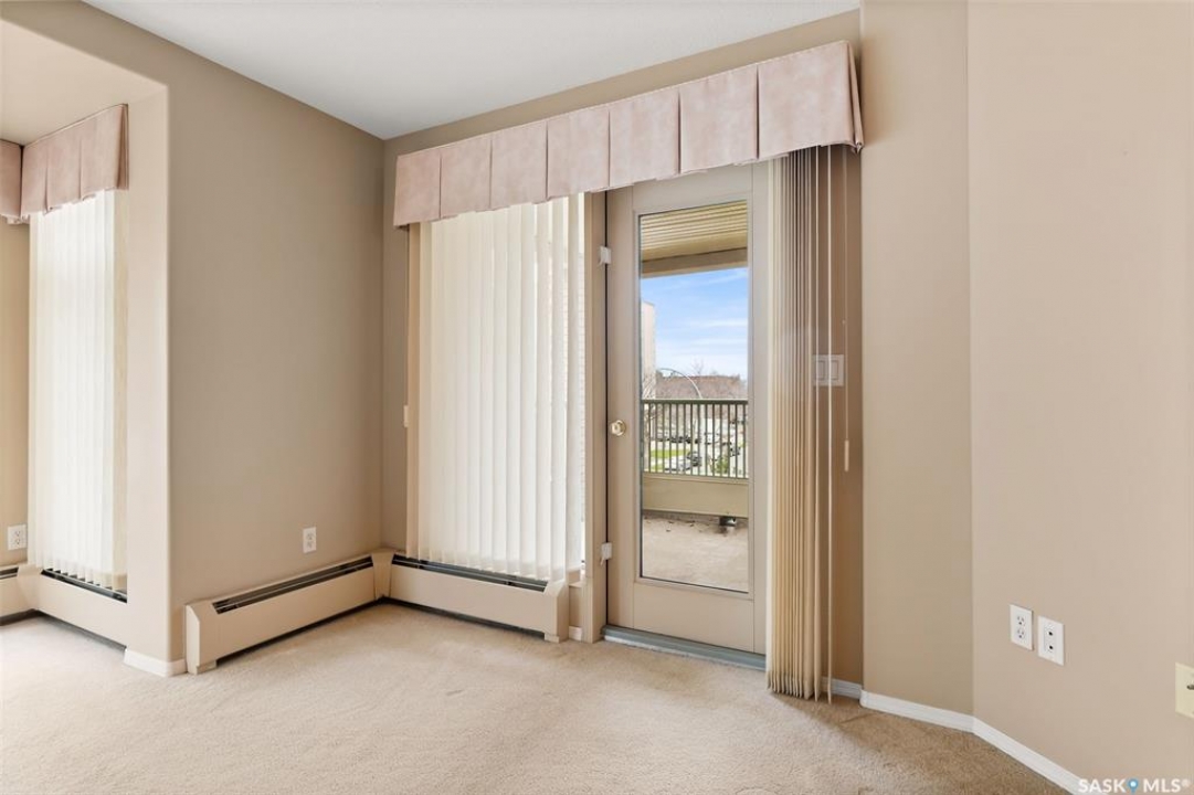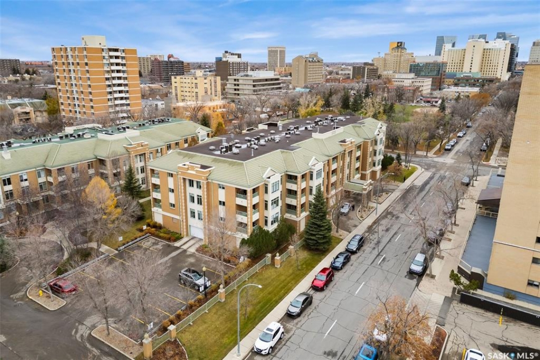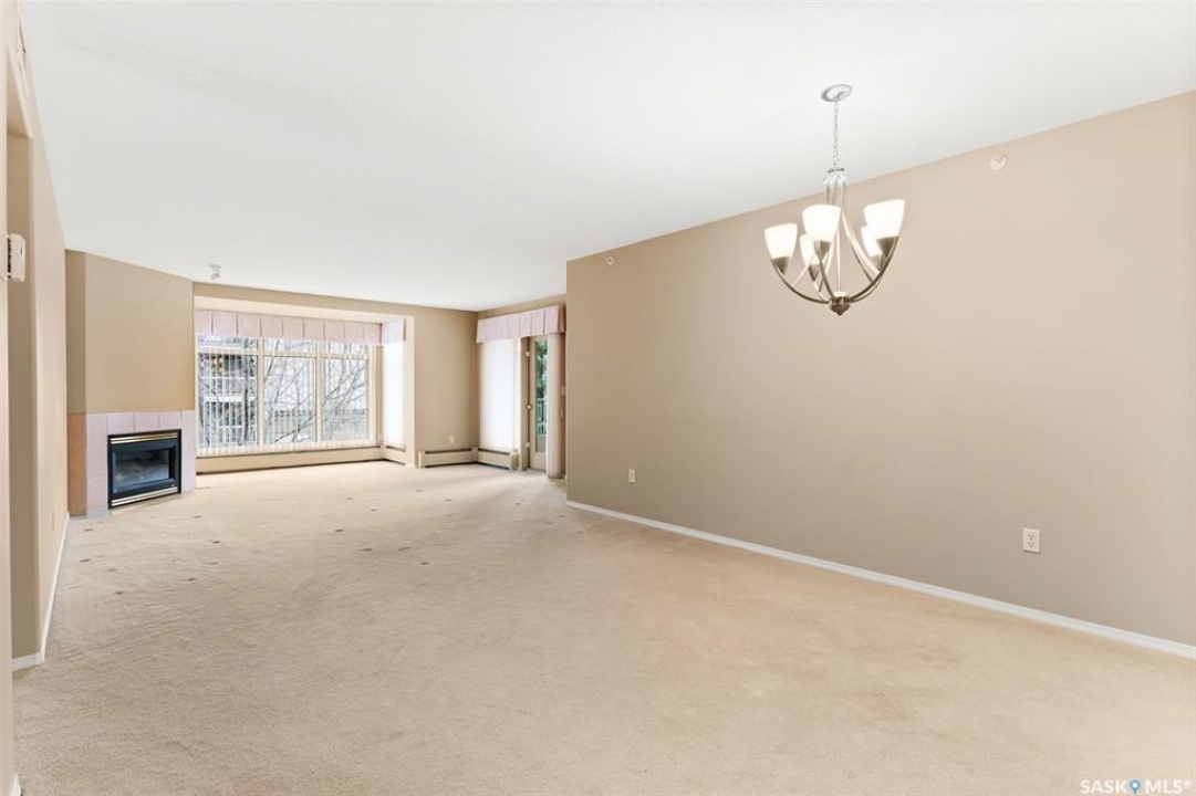 Experience the height of elegant, easy living in this impressive executive condo in the highly sought-after College Park community. Offering 1,338 square feet of thoughtfully designed space, this third-floor unit is filled with natural light and features an open-concept layout ideal for relaxing or entertaining. Step into a grand tiled foyer that leads to the spacious main living area. The inviting living room is anchored by a cozy gas fireplace and a sunlit alcove surrounded by windows—perfect for reading, working, or unwinding. The dining area easily accommodates a large table, while the well-appointed kitchen offers ample cabinetry, white appliances including a built-in oven and cooktop, and generous counter space. A covered east-facing balcony provides a peaceful retreat for morning coffee, complete with a gas BBQ hookup for outdoor dining. The spacious primary suite includes a large walk-in closet and a sleek three-piece ensuite with an oversized shower. A second bedroom offers flexible space for guests or a home office, with a four-piece main bath nearby. Additional conveniences include in-suite laundry with shelving, custom blinds, central air, and elevator access. This condo also includes a 120-square-foot secure storage room and a heated underground parking stall (#31). Residents enjoy an amenities room with games and fitness equipment, a parkade car wash, off-street visitor parking, and a same-floor garbage chute. Steps from Wascana Park, shopping, dining, and essential services, it's also within walking distance to downtown, Darke Hall, and the refurbished Globe Theatre. Enjoy refined urban living at its best—condo fees cover heat, water, sewer, garbage/recycling, exterior maintenance, lawn care, snow removal, building insurance, and reserve fund contributions. Contact your realtor for more information or a private tour.