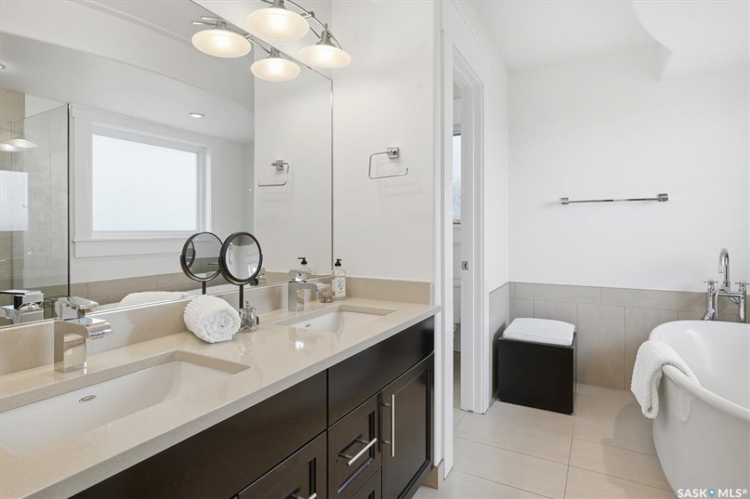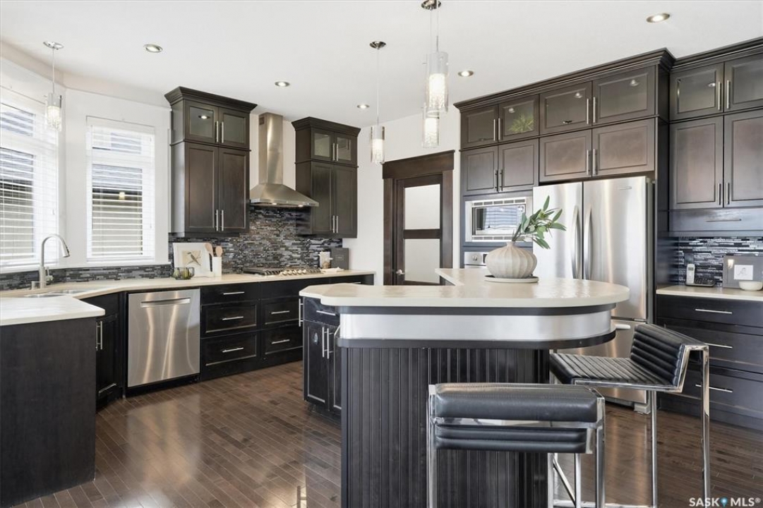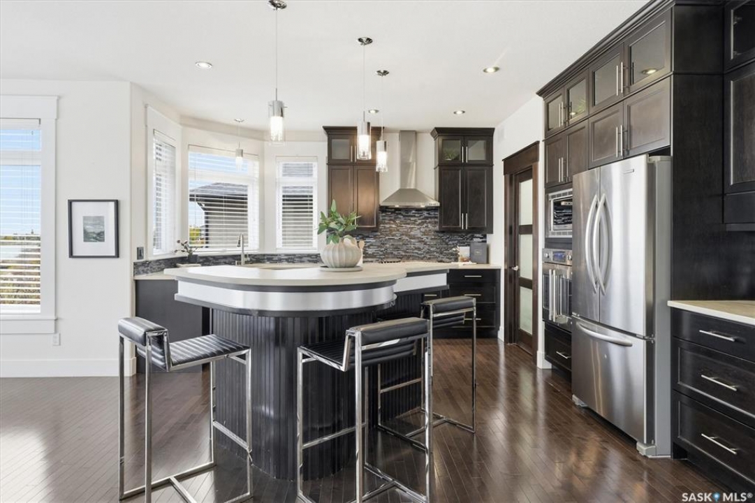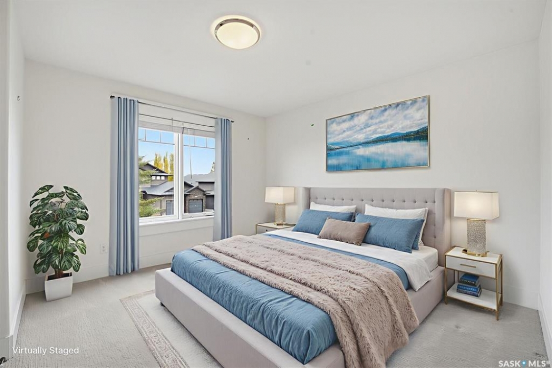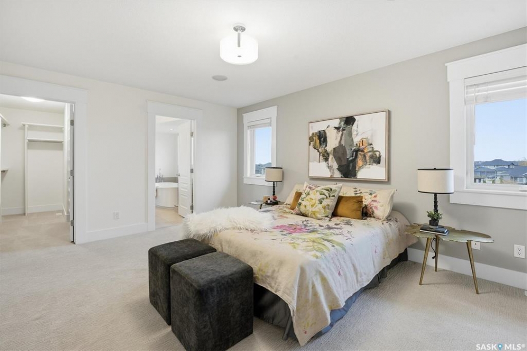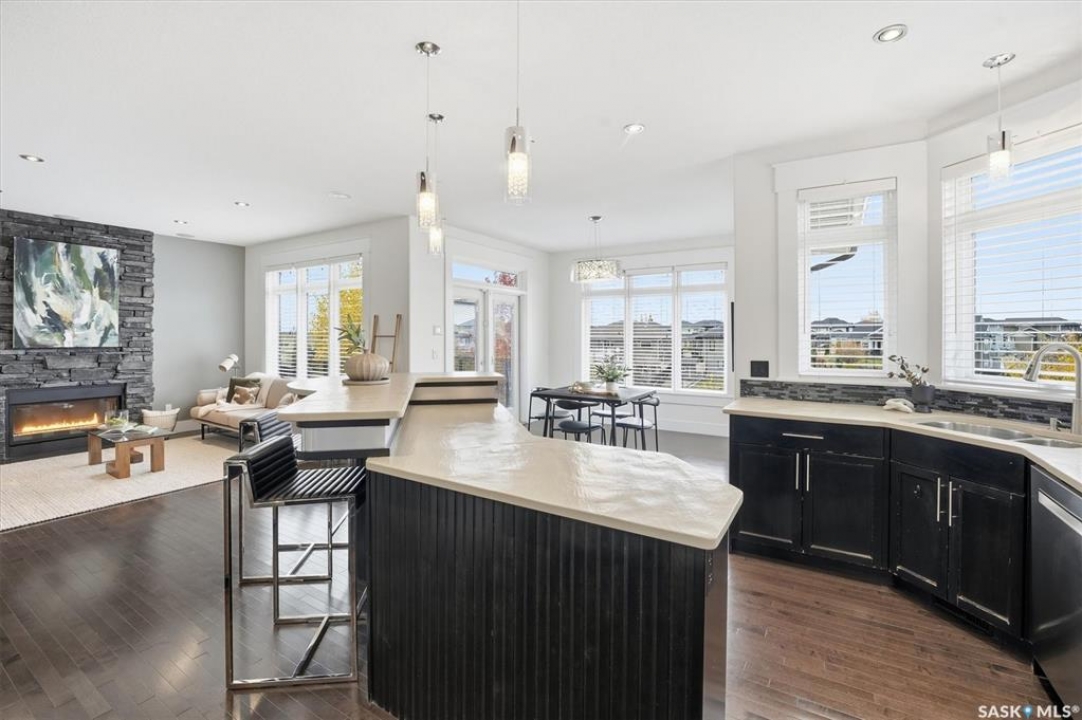 Stunning former lottery home in Stonebridge, backing onto a beautiful park and green space! This 2,114 sq ft two-storey offers a walkout basement with radiant in-floor heat, wet bar, fitness room, large windows, and a cozy gas fireplace overlooking the park. The main floor features a spacious office, an open-concept living, dining, and kitchen area with an angled island, maple cabinets, gas cooktop, and a park and lake view. Upstairs boasts 3 bedrooms including a luxurious primary suite with double sinks, stand-alone shower, and Jacuzzi tub. Enjoy two gas fireplaces (main & basement), triple-pane windows, under-cabinet lighting, heated garage, and professionally landscaped yard. In-slab patio lighting plus heated underground downspout drainage—great for spring melt. Exceptional craftsmanship built by D&S Homes and move-in ready — a truly one-of-a-kind park-backing home!