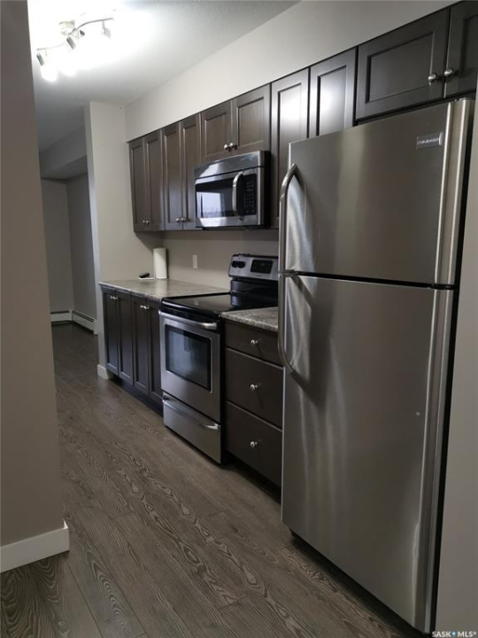 Main Floor North East facing 907 sq.ft. condo!! This unit features 2 bedroom and 2 bathroom. A walk in closet and full bathroom are located in the master bedroom. Entering the condo you're greeted with an open concept layout Kitchen, Dining room and living room with Laminate flooring. Kitchen with large island with seating for 3, plenty of cupboards, appliance package. This unit also has ensuite laundry. One added bonus with this unit is the added space on the balcony. One underground parking stall is included. Call to view!!