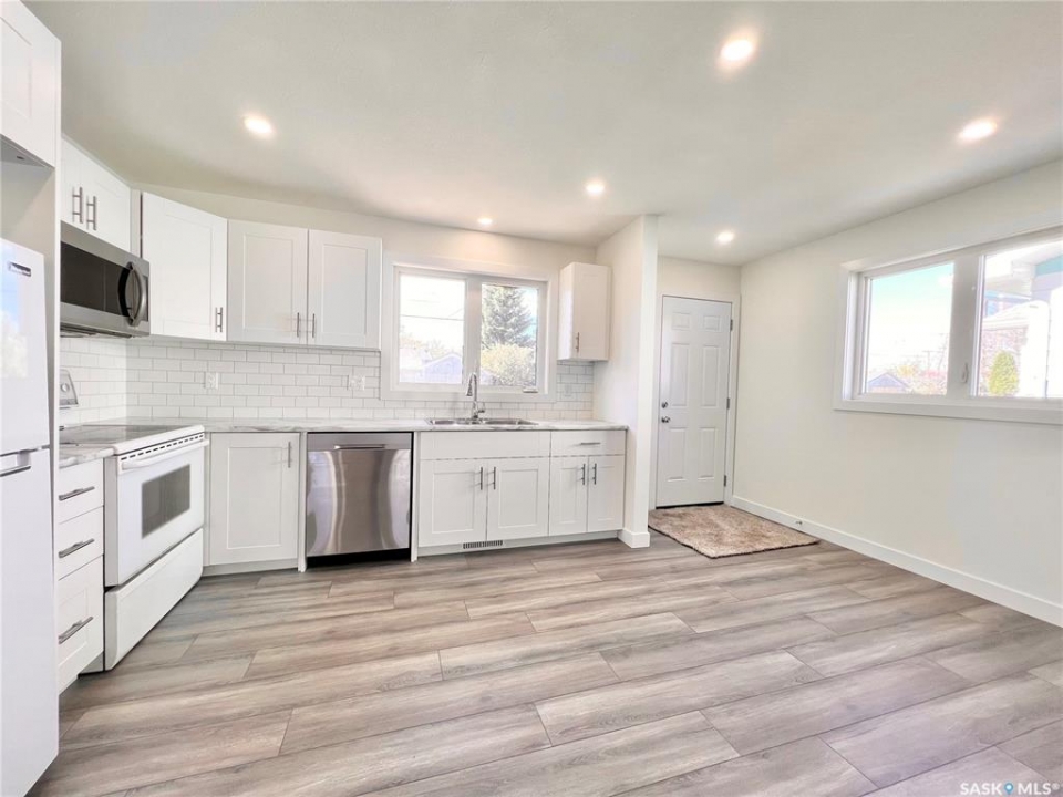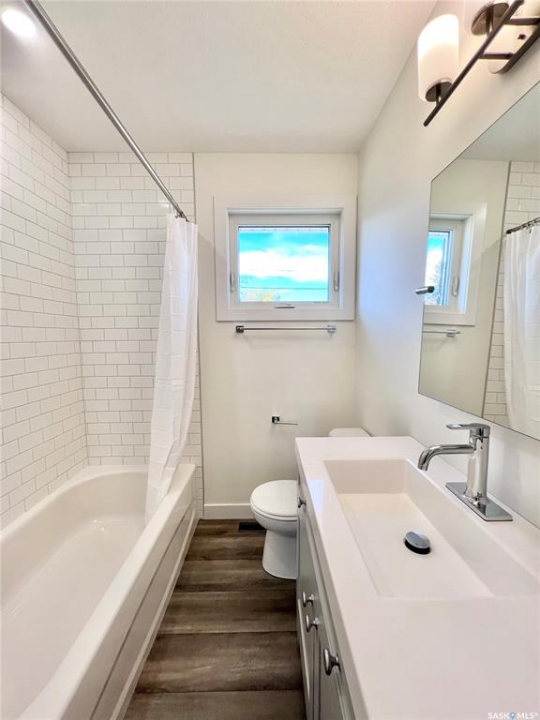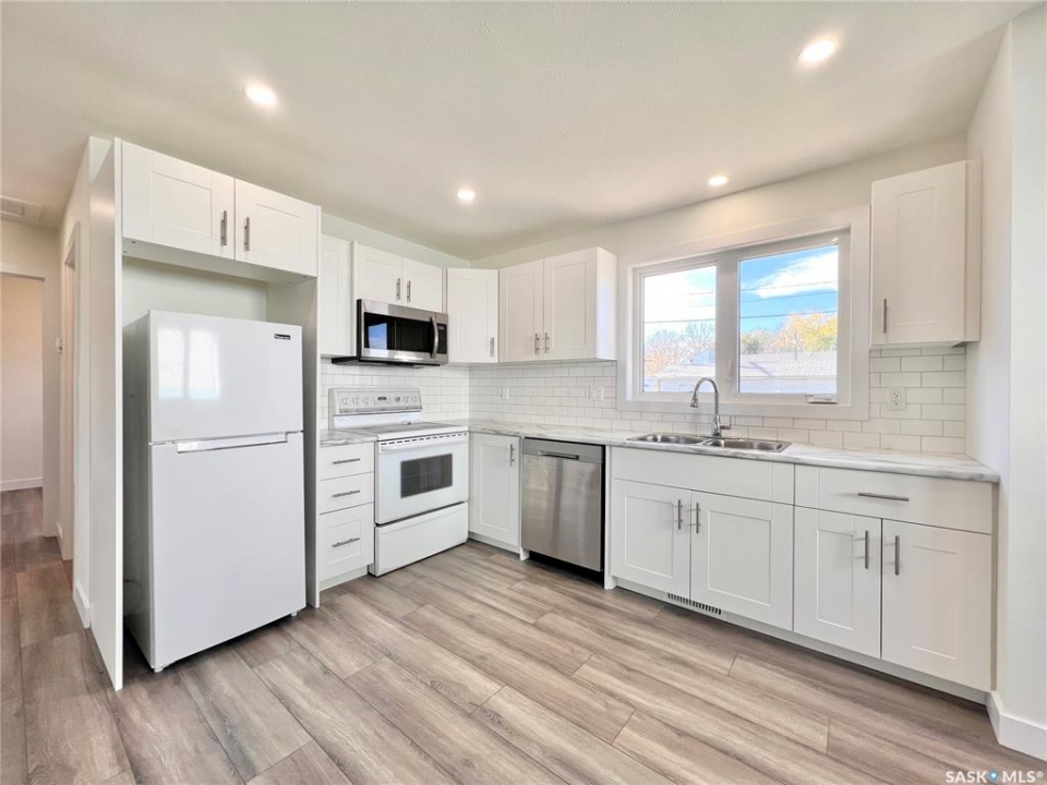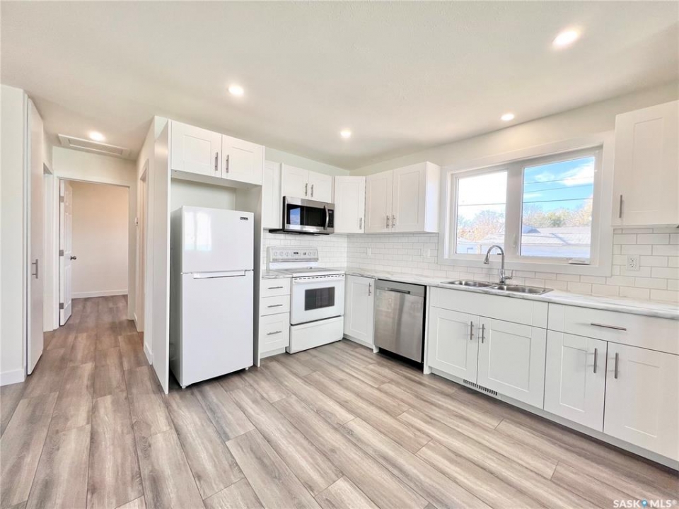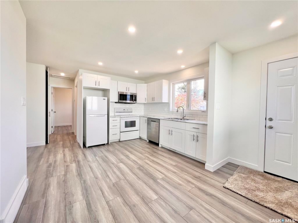 Newly renovated home for sale only a 1.5 blocks to the schools and 1.5 blocks to shopping! This adorable home has tasteful updates and feels like a brand new home! There is gorgeous laminate flooring throughout the main floor, pot lighting, and new kitchen cabinetry. A beautifully renovated 4 piece bathroom with tiled shower is located near the large master bedroom and secondary bedroom. The living room has generous space and access to the basement where you'll find a large completely finished recreation room. There is another bedroom in the basement with a 2 piece bathroom nestled nearby, laundry room and a mechanical room with upgraded furnace and water heater. Outside is an open canvas with a small shed and older garage to get you started for outdoor storage. Come take a look with your realtor and see this lovely home! Call today!
