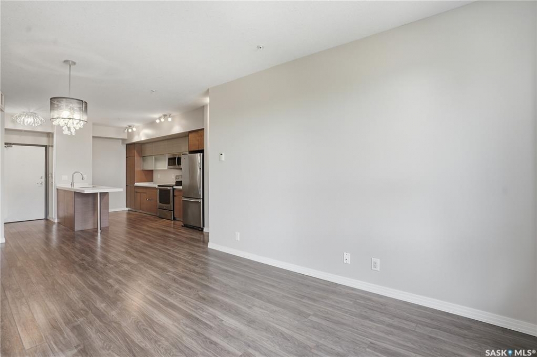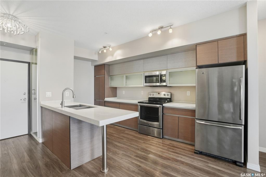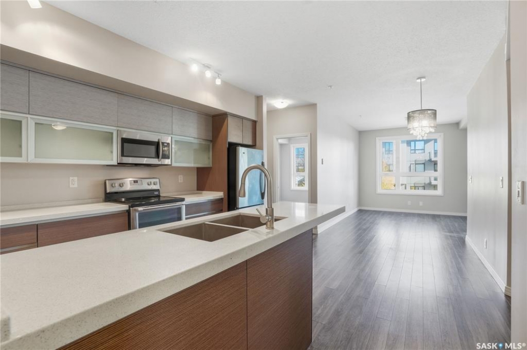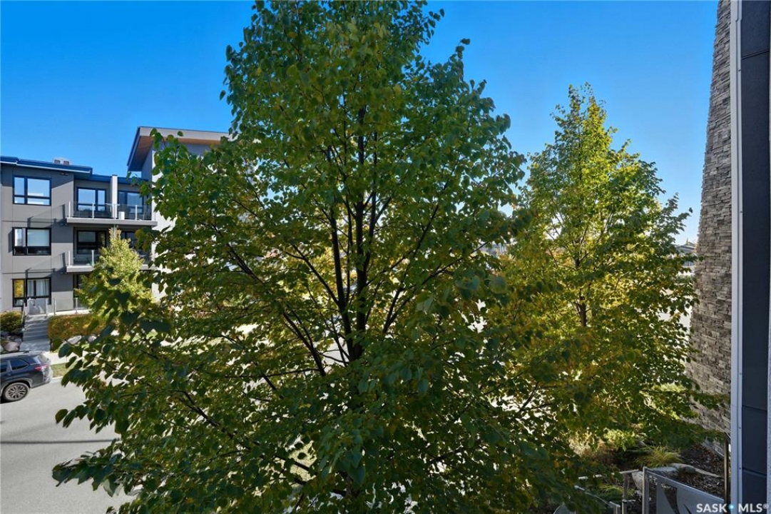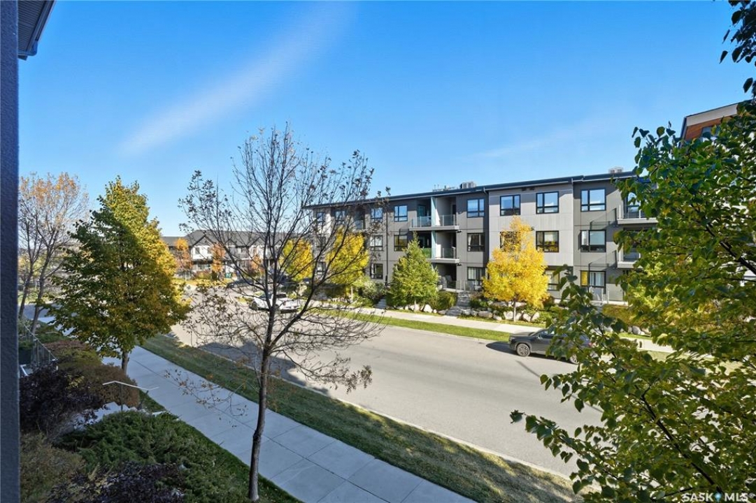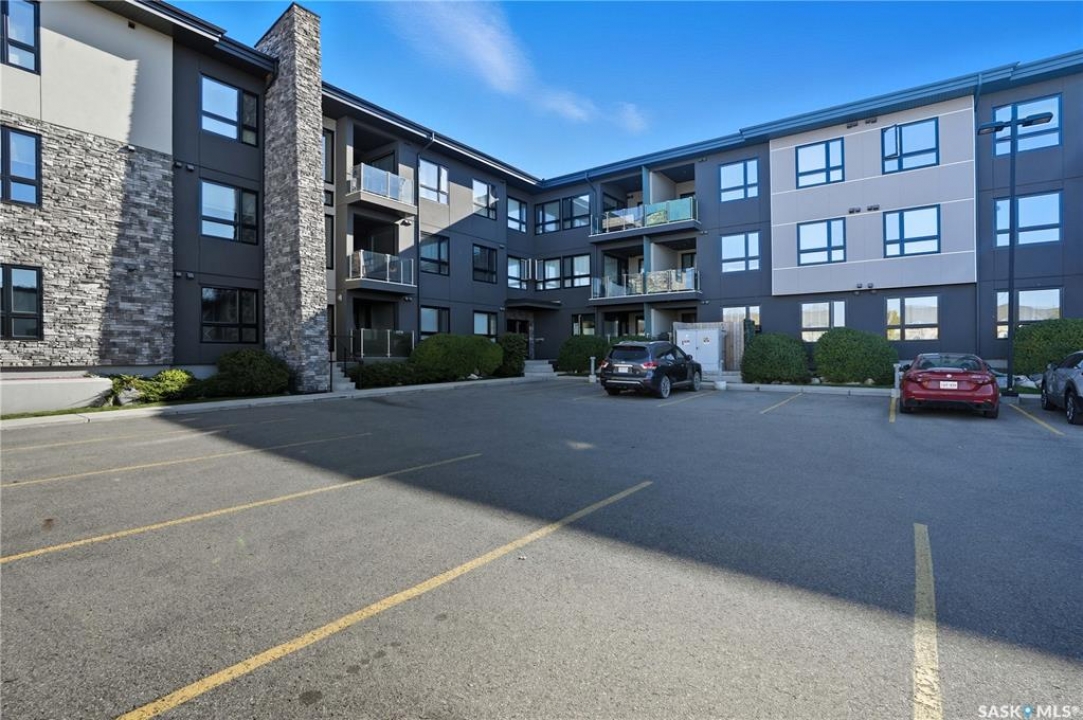 Excellent 2-bedroom, 2-bathroom east-facing condo with 2 parking spots (1 underground, 1 electrified surface-level) at Sequoia Rise, great location close to the Evergreen Square & bus routes to U of S. This trendy suite offers a functional layout with 9' ceilings, SoHo-style kitchen with quartz countertops and eating bar, ample living & dining space, in-suite laundry, split bedroom layout with generously-sized primary bedroom featuring walk-through closet to a beautifully-finished 4-piece ensuite with sit-down shower & dual sinks on a vastly-sized quartz-top vanity. A sheltered environment awaits you at the balcony, offering a relaxing space to soak up the sunrise with your morning coffee! Excellent climate control with in-floor zone heating (included in condo fees) & central air conditioning, providing gentle heating with the benefits of air handling. Building amenities include elevator access, intercom with cell phone compatibility, common exercise area & meeting room, visitor parking & mailboxes. Pet-friendly condo subject to restrictions. Whether you're looking to downsize, looking for economical living or buying your first home, this great condo should be on your list!