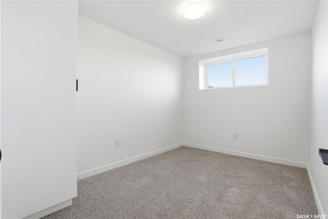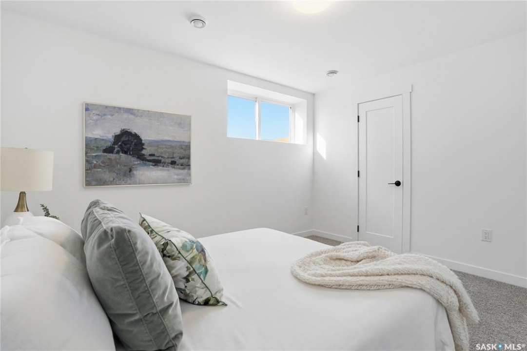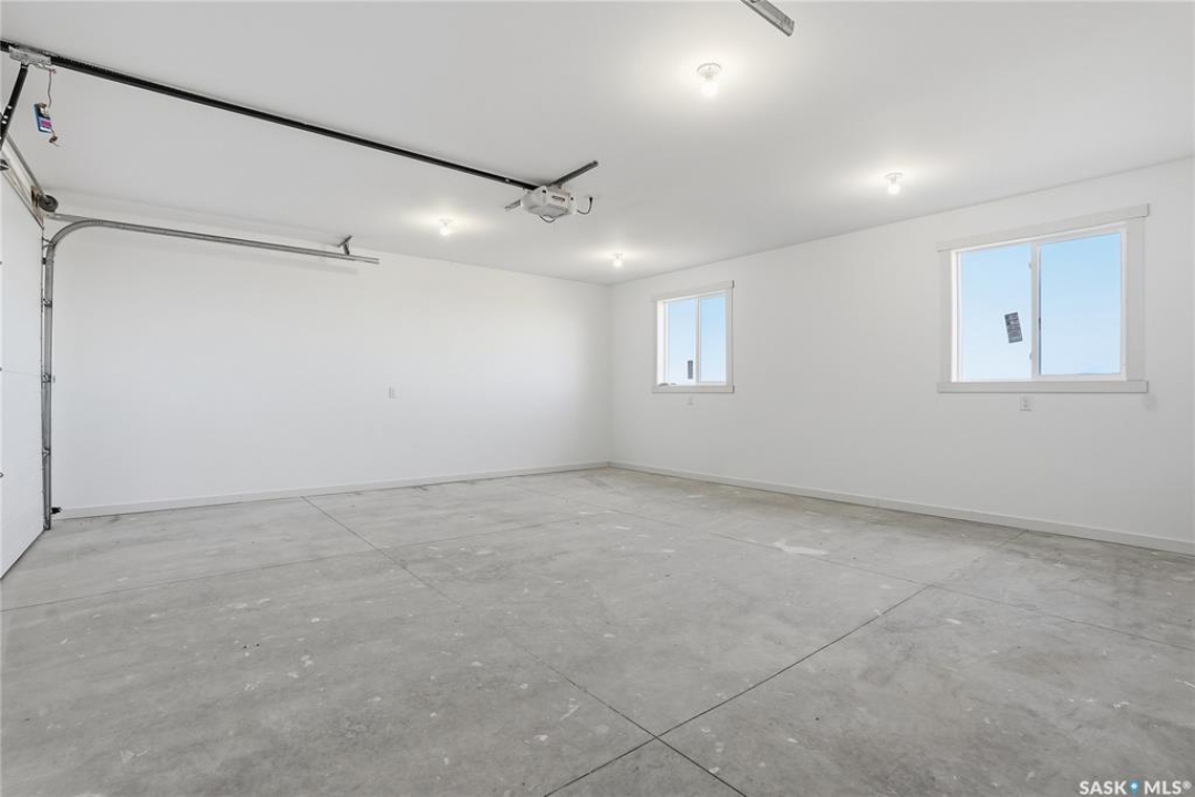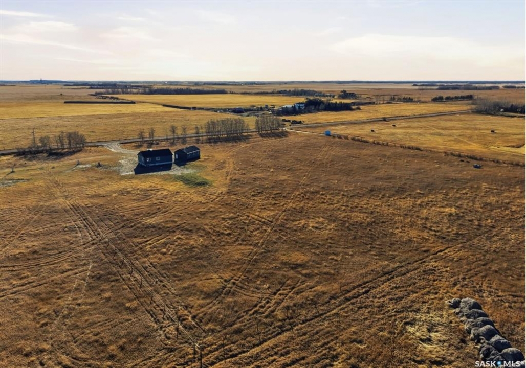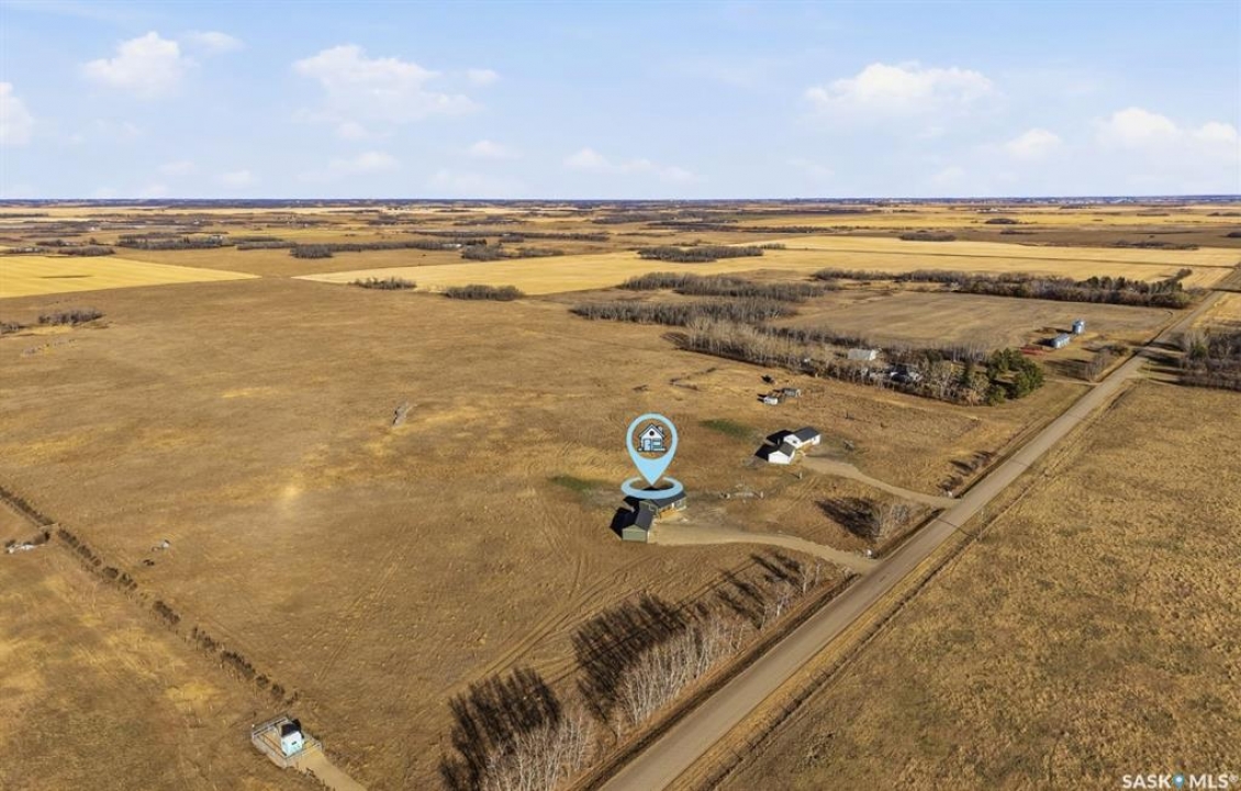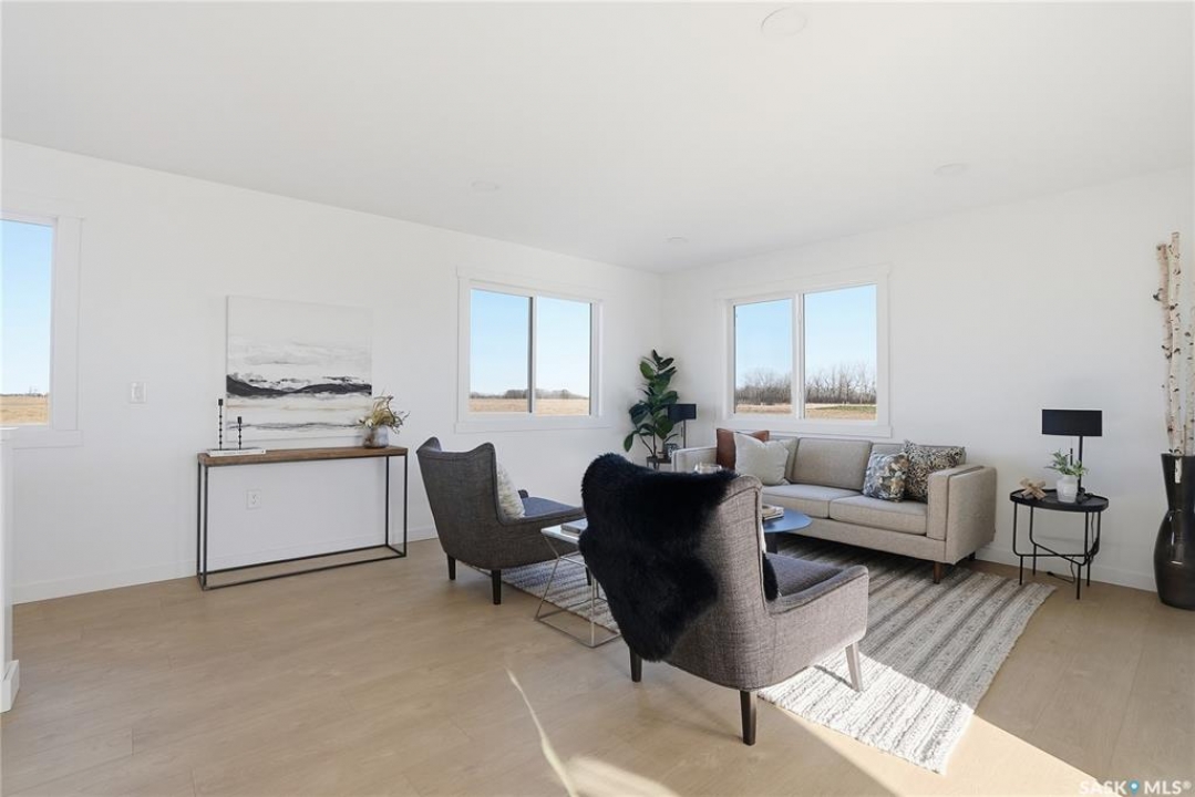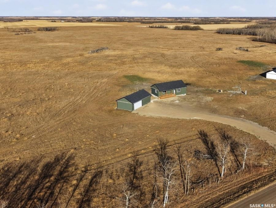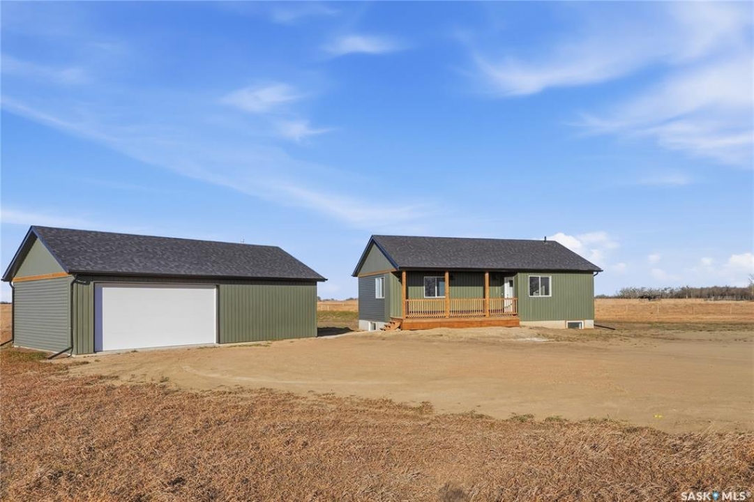 What an Opportunity! Just minutes west of Saskatoon-enjoy peaceful acreage living with city convenience! This newly constructed property sits on 7 acres and offers just over 1,700 sq. ft. of developed space (856 sq. ft. on the main level), featuring 4 beds, two baths, a fully developed basement, and an impressive heated triple detached garage (36' wide with a double overhead door). The home welcomes you home with a charming covered front porch and a functional large foyer complete with a built-in bench and a separate boot room area with floor-to-ceiling wardrobes. The open-concept main floor connects a spacious living room, dining area, and kitchen. The kitchen is a standout, showcasing an abundance of custom lacquer cabinetry, full-height pantry storage, quartz countertops, stainless steel appliances including a microwave hood fan, subway tile backsplash, and an oversized island ideal for large gatherings. The adjacent dining room easily accommodates a large table for the entire family! A convenient two-piece bath completes the main level. An open staircase leads to the bright lower level, which offers four bedrooms (one smaller-ideal as a nursery, office, or den), a spacious family-style 4-piece bathroom, and a large walk-in closet in the primary bedroom. Outside, the detached 36' heated and insulated garage is a dream setup-complete with a workshop area and a double overhead door. The yard is unlandscaped but cleared and ready for your personal design-bring your garden plans and your green thumb. Property is built by a reputable experience Saskatoon builder.