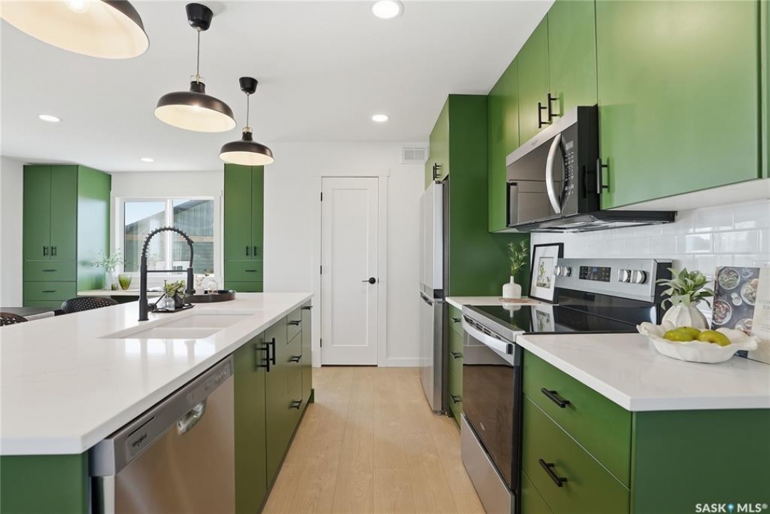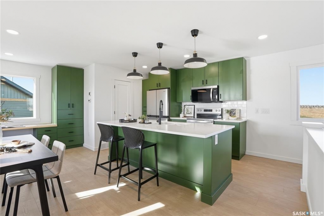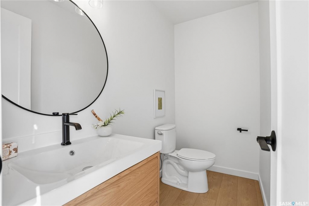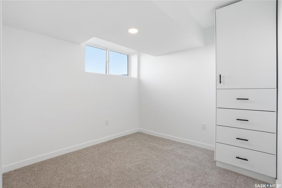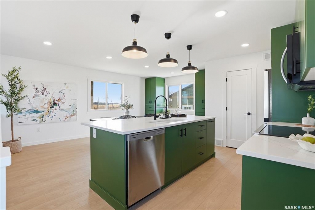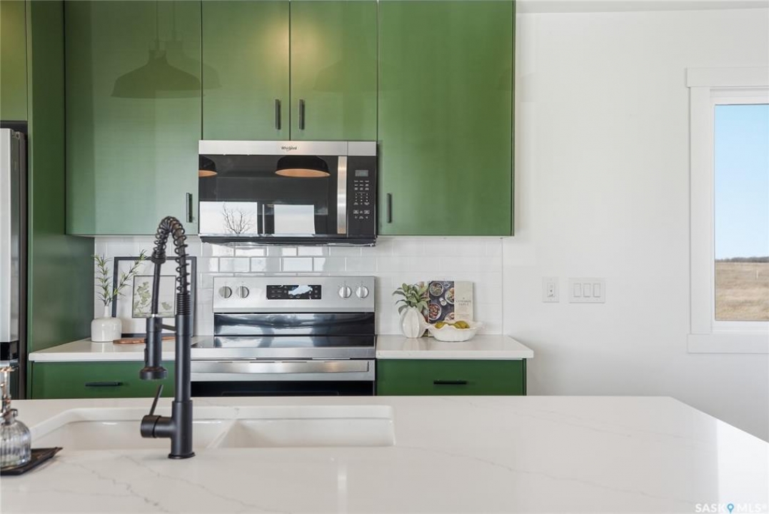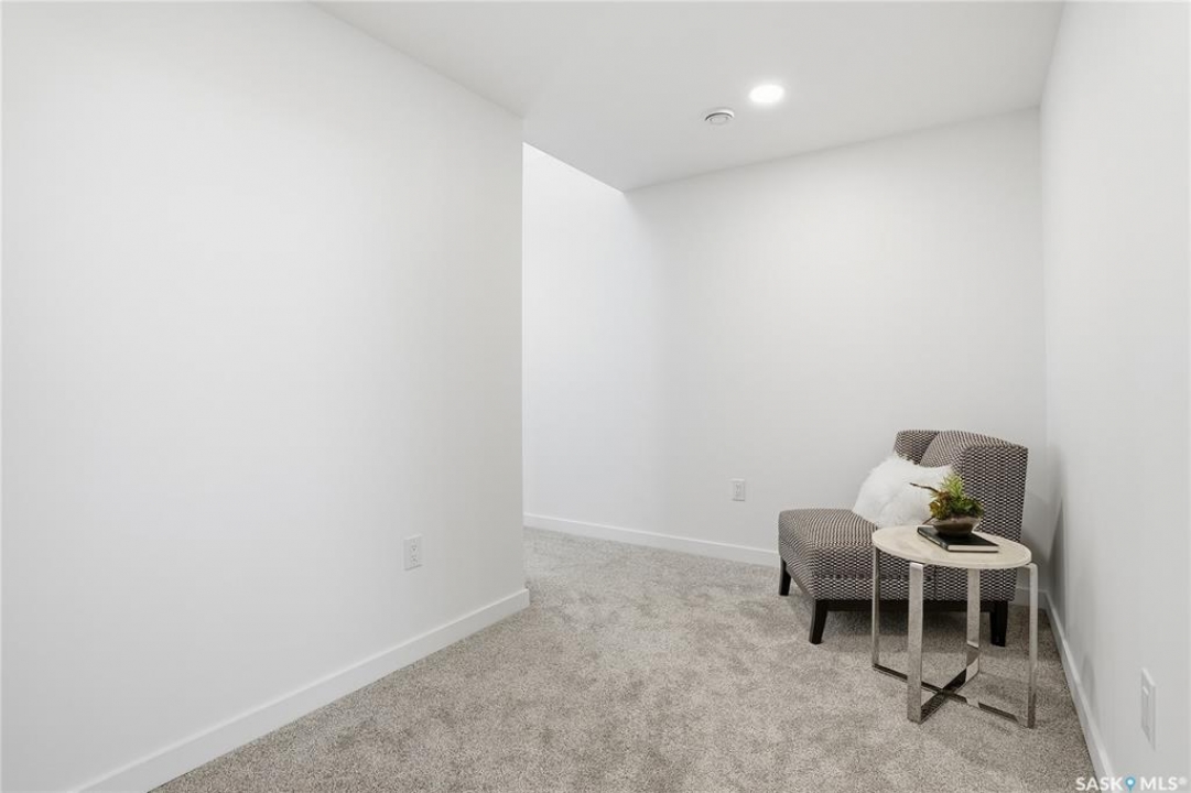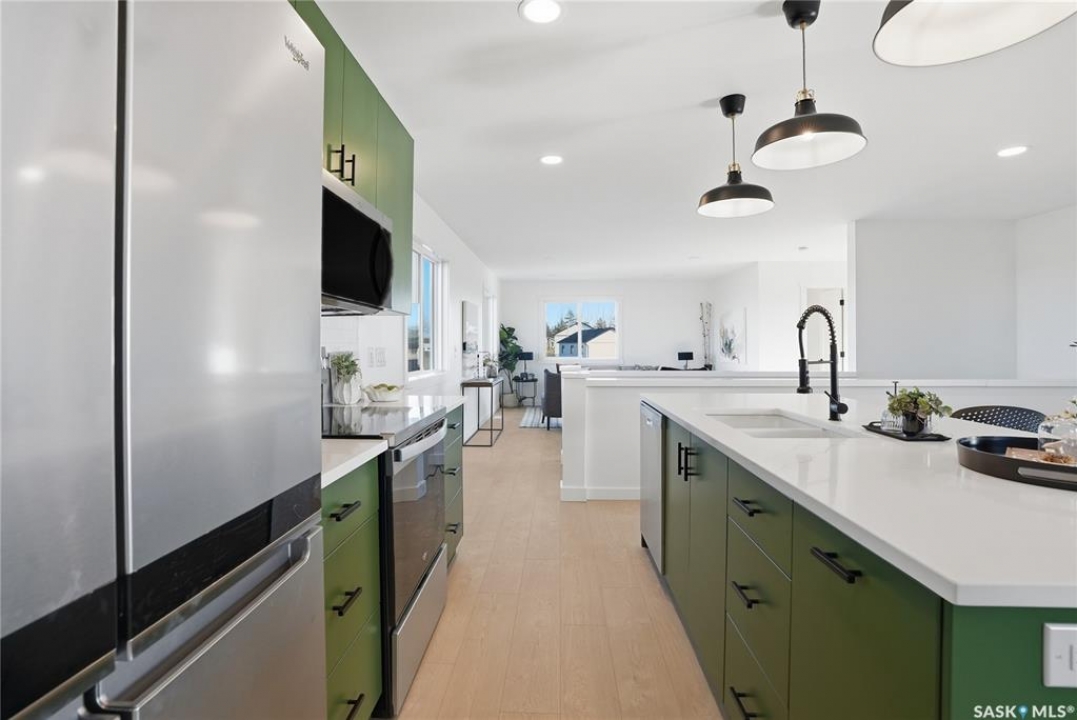 What an Opportunity! Just minutes west of Saskatoon-enjoy peaceful acreage living with city convenience! This newly constructed property sits on 7 acres and offers just over 1,700 sq. ft. of developed space (856 sq. ft. on the main level), featuring 4 beds, two baths, a fully developed basement, and an impressive heated triple detached garage (36' wide with a double overhead door). The home welcomes you home with a charming covered front porch and a functional large foyer complete with a built-in bench and a separate boot room area with floor-to-ceiling wardrobes. The open-concept main floor connects a spacious living room, dining area, and kitchen. The kitchen is a standout, showcasing an abundance of custom lacquer cabinetry, full-height pantry storage, quartz countertops, stainless steel appliances including a microwave hood fan, subway tile backsplash, and an oversized island ideal for large gatherings. The adjacent dining room easily accommodates a large table for the entire family! A convenient two-piece bath completes the main level. An open staircase leads to the bright lower level, which offers four bedrooms (one smaller-ideal as a nursery, office, or den), a spacious family-style 4-piece bathroom, and a large walk-in closet in the primary bedroom. Outside, the detached 36' heated and insulated garage is a dream setup-complete with a workshop area and a double overhead door. The yard is unlandscaped but cleared and ready for your personal design-bring your garden plans and your green thumb. Property is built by a reputable experience Saskatoon builder.