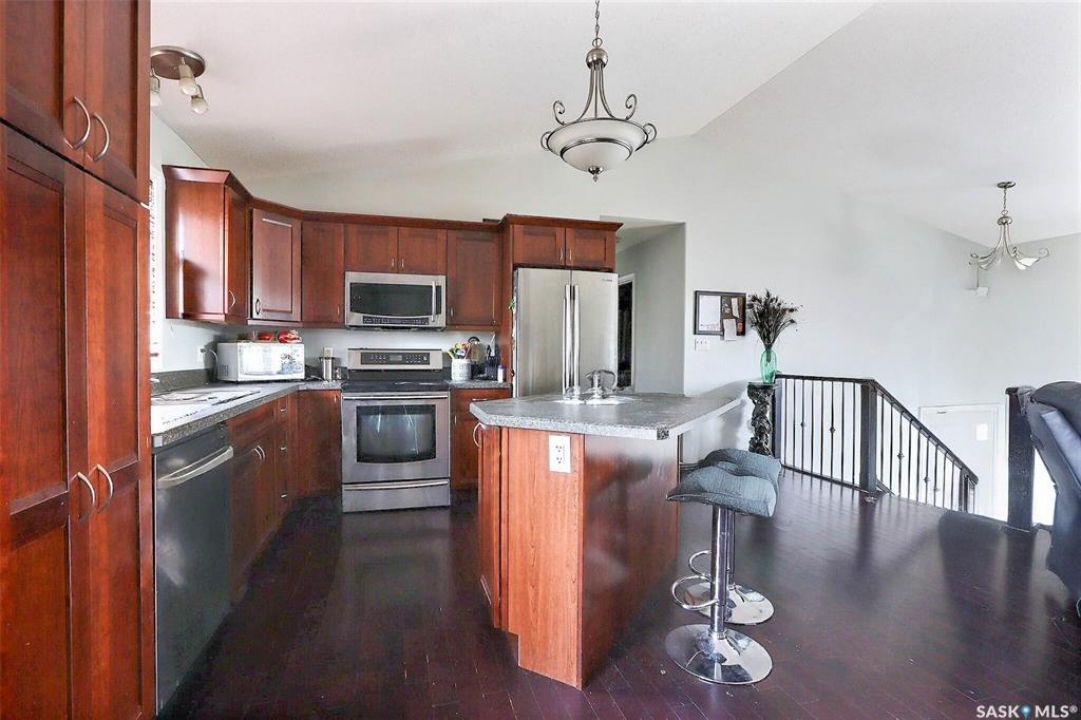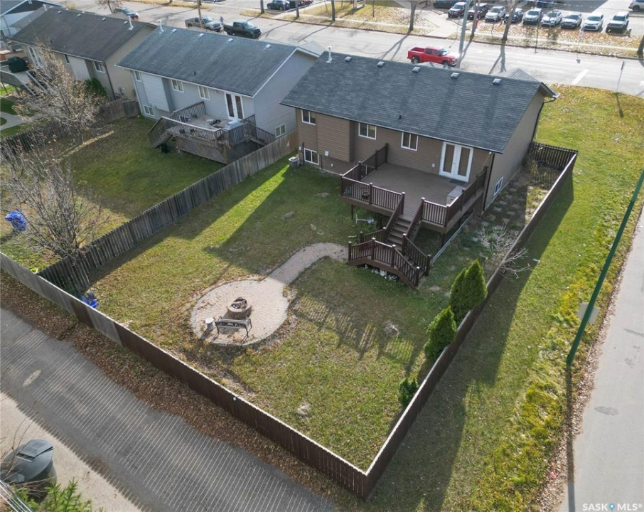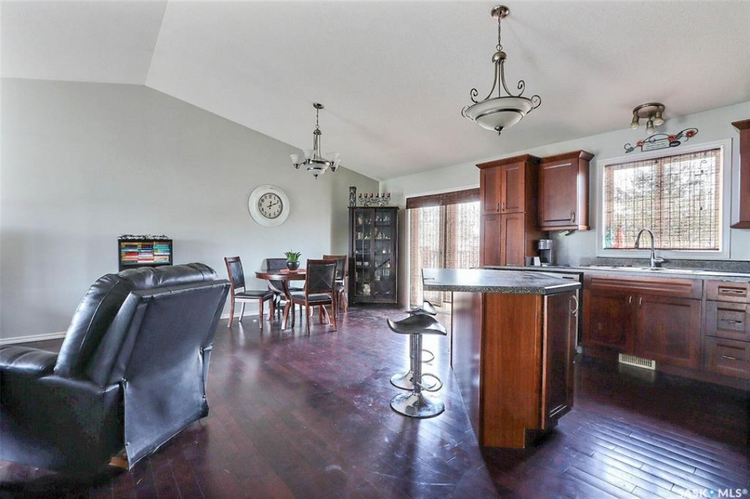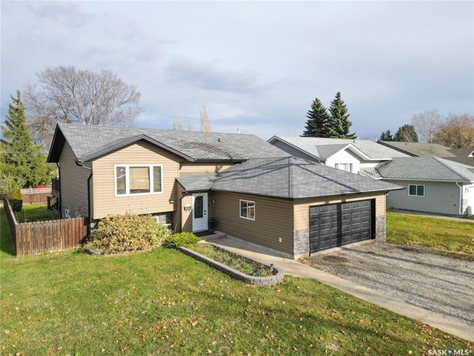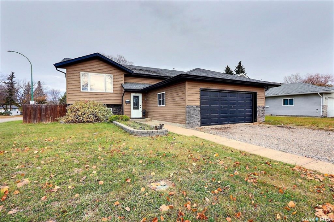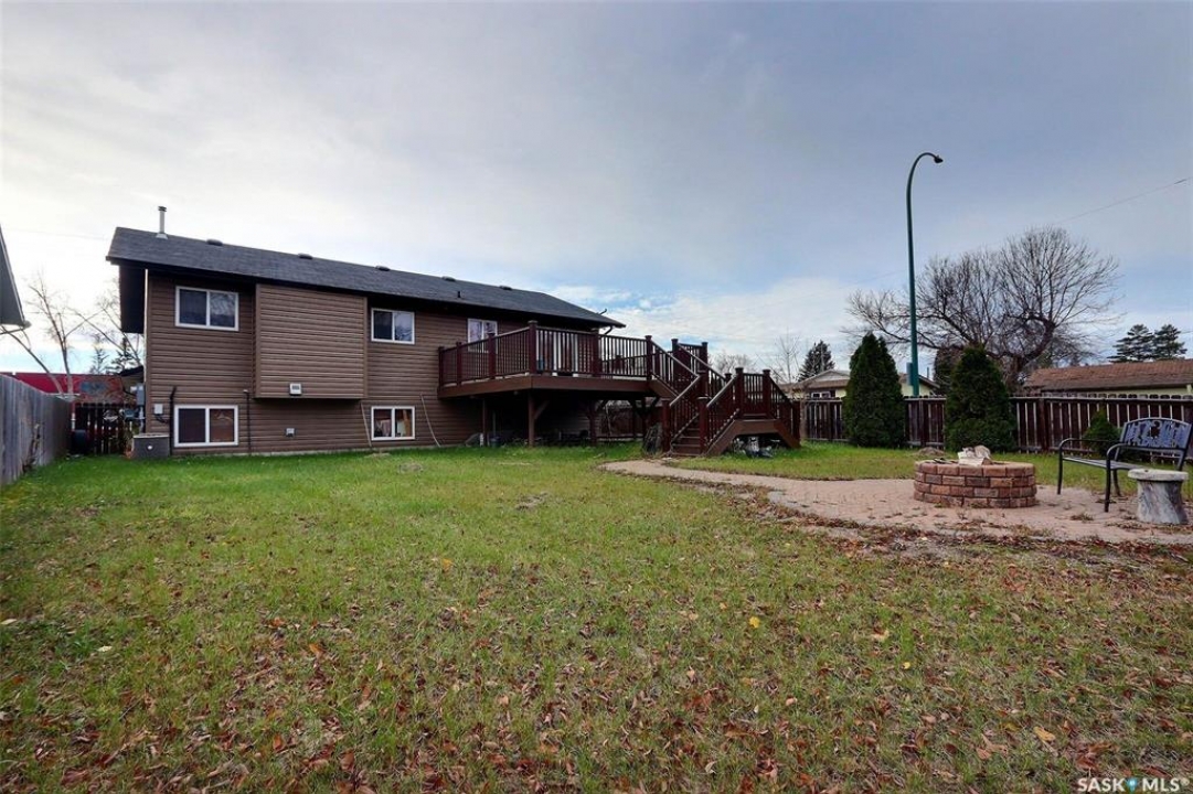 This spacious 1,245 sq/ft 5 bedroom bi-level, built in 2008, offers a fantastic layout and great potential. Located in East Flat across from St. John Community School and close to many amenities, this property makes for an ideal family home. The main floor features an open-concept design with vaulted ceilings, hardwood flooring, and a bright, spacious feel throughout. The kitchen offers plenty of dark cabinetry, an island with sink and bar seating, and patio doors leading to a large composite deck overlooking the fully fenced yard with a cozy fire pit area. There are 3 bedrooms and 2 bathrooms on the main level, including a primary suite with a walk-in closet and 3-piece ensuite. Downstairs, you'll find a large rec room with plenty of windows, a den, and two additional bedrooms, plus a 4-piece bathroom — perfect for a growing family. Additional features include a 22x24 insulated double attached garage, arborite counters throughout, natural gas hot water heater (2022), central air, and an air-to-air exchanger. Set on a 54 x 130 lot, this home offers space and comfort - an excellent opportunity!