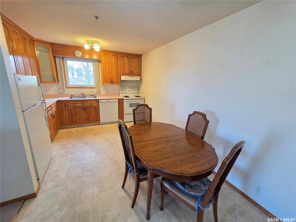 Welcome to the Manhatten! Bright 2 bedroom condo on ground level. Balcony faces the ball diamond. Eat-in kitchen with lots of oak cupboards & appliances included. 2 large bedrooms --one with a full en-suite. Patio doors to cement deck. Radiant in-floor heating. Air conditioning. Elevator access to underground heated parking space and storage included. Laundry room in unit.