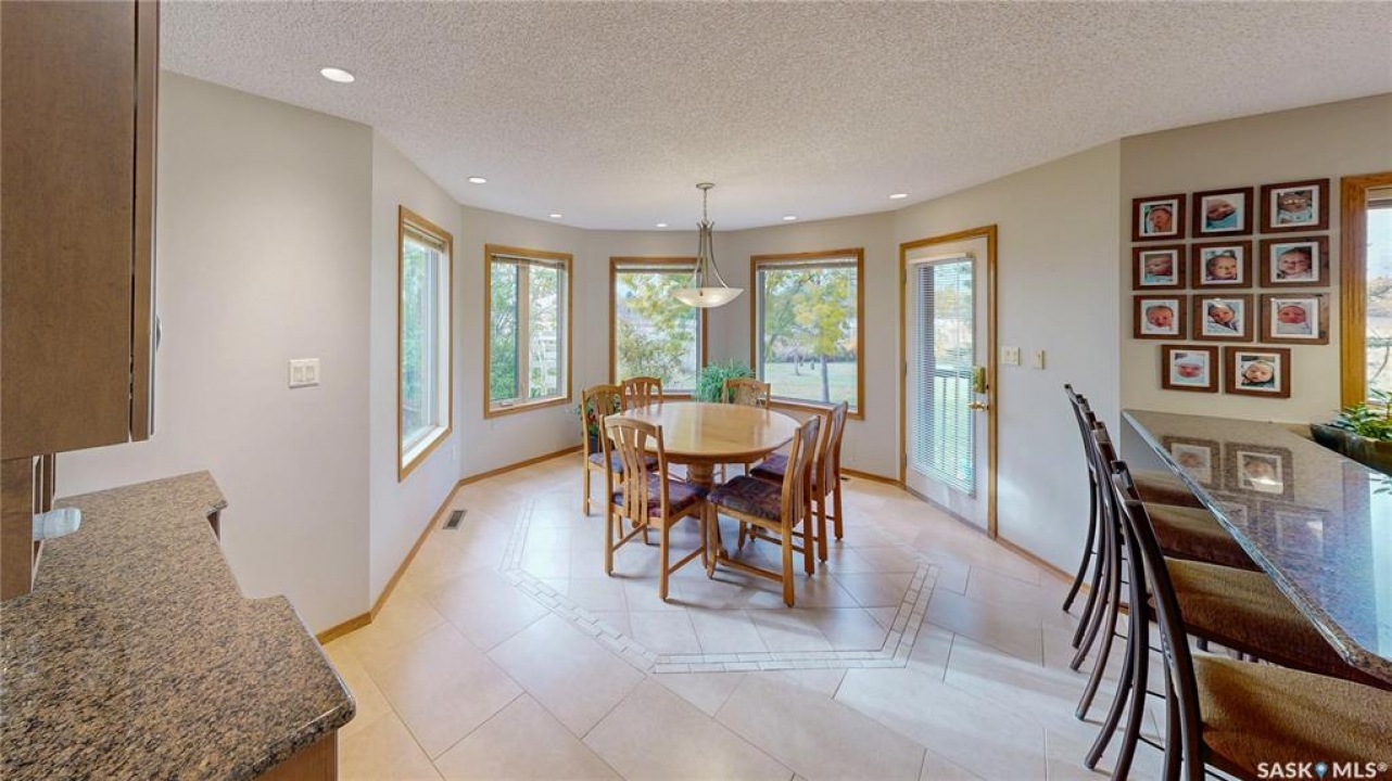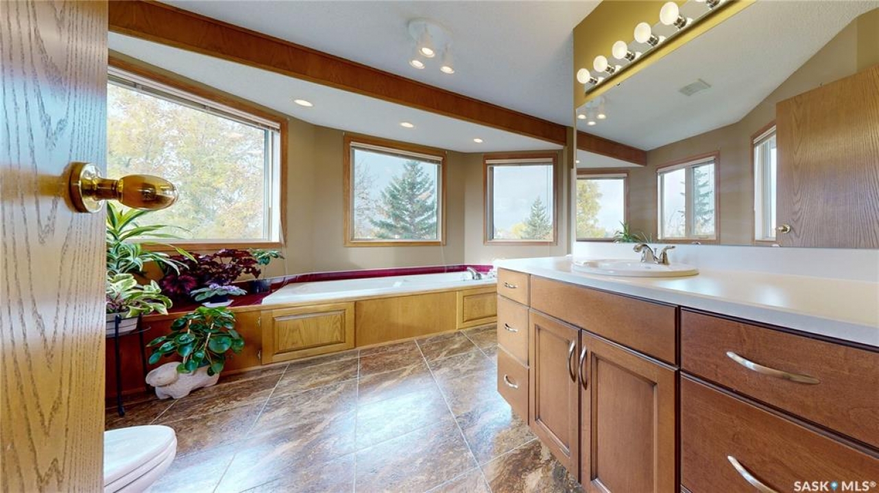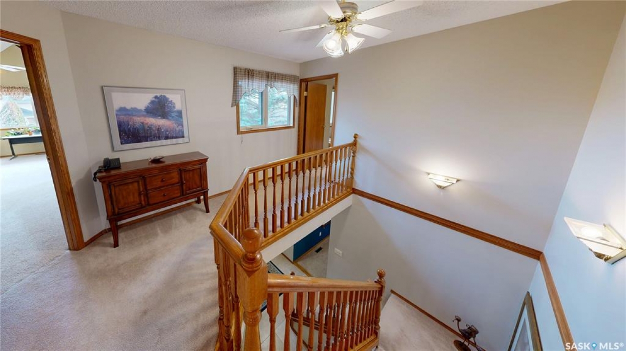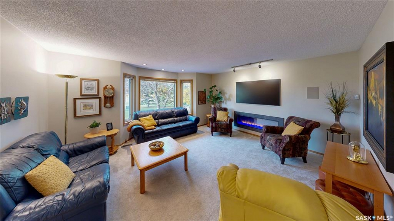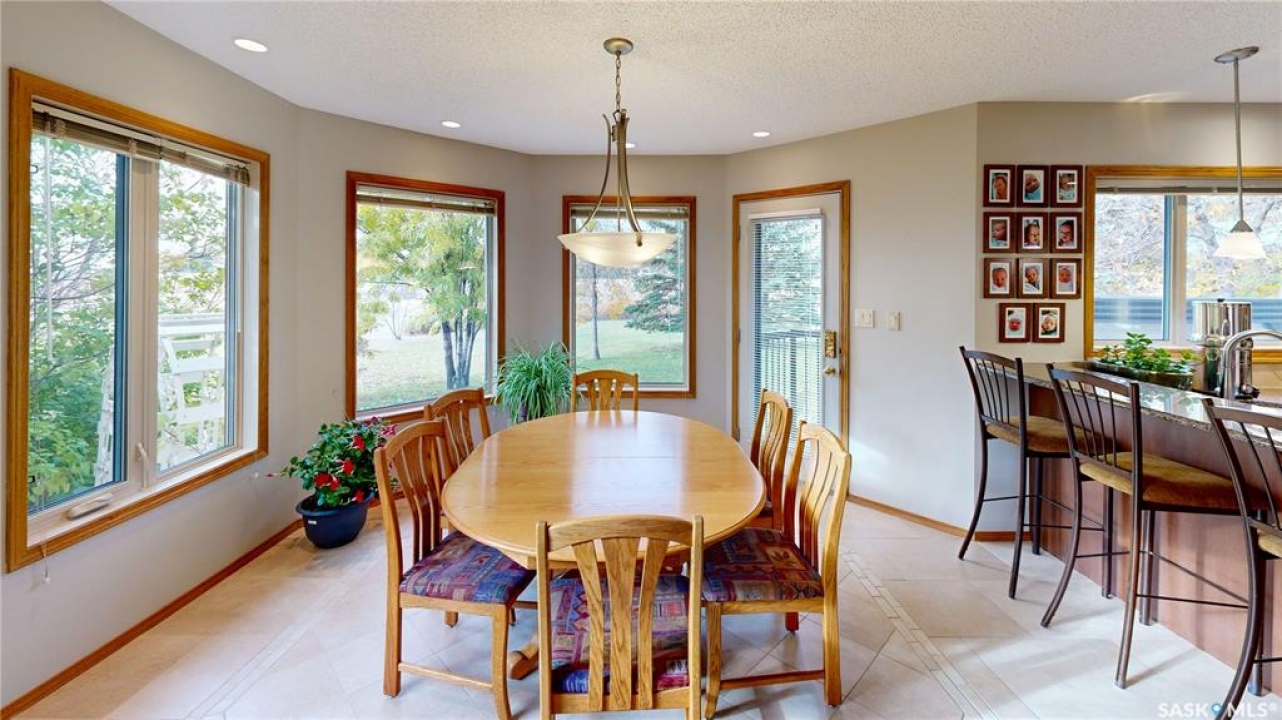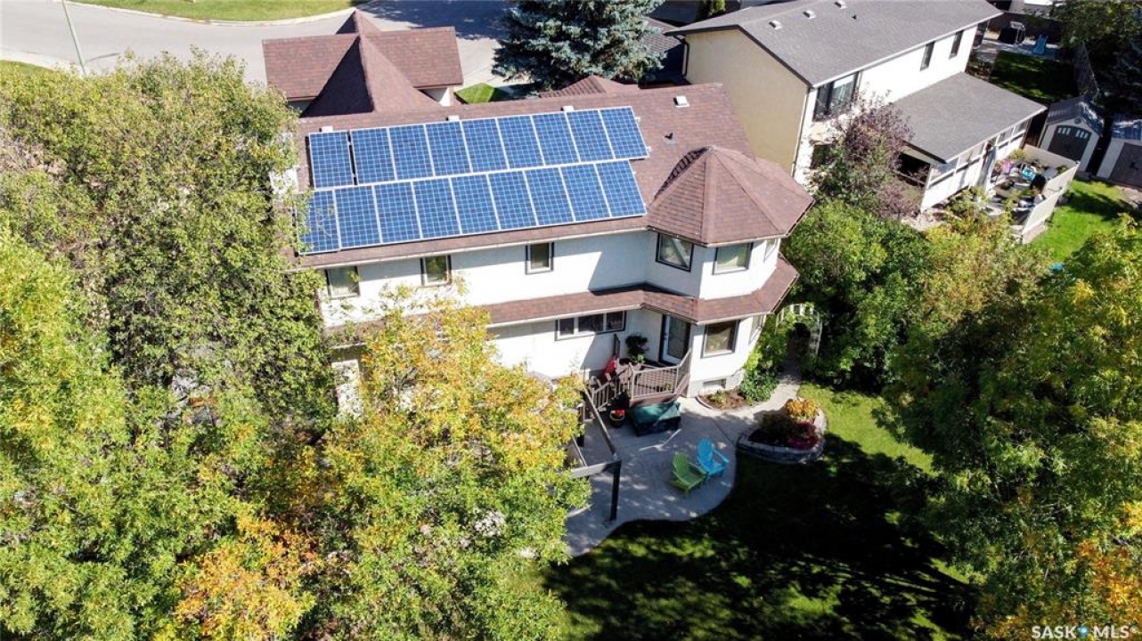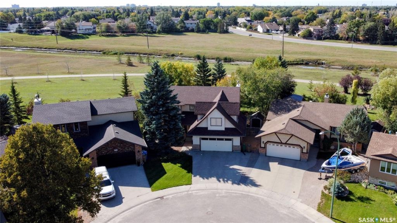 Welcome to 2631 Crocus Drive in the desirable Wood Meadows neighborhood close to WF Ready school and park, St. Marguerite School, and a short drive away from all the shopping amenities Regina's East End has. This original owner, 1991 built, 2588 square foot, 5 bedroom, 4 bathroom, 2 story house sits on a massive 8840 sqft irregular lot backing a walking path. The front yard has a lawn, pine tree, greenery and the double concrete driveway that leads to the 24'x24' double attached, insulated garage and covered front porch. There are 18 solar panels on the roof! The backyard has an endless lawn, trees and shrubs, a patio with an included pergola, a garden, a fenced area and a shed! You enter this home into the foyer that has a coat closet. Next is the family room. Walking through french doors you enter into the large dining room that is surrounded by large windows that overlook the beautiful green space. The updated kitchen is next with a window overlooking the back yard, cappuccino maple cabinets, granite counter tops and the included fridge, stove, microwave hood fan and built-in dishwasher are all included. Next is the living room with carpet flooring, a bay window, and a beautiful electric fireplace. The main floor is finished off with a 2pc bathroom, the door to the garage and a laundry room with a sink and cabinetry. Upstairs are 2 good sized bedrooms with ample closet space, the main 4pc bathroom with double sinks, another bedroom, and then the huge bonus room. The 2nd floor is completed with a large primary bedroom with a walk-in closet as well as a 4pc ensuite bathroom featuring a jet tub. The finished basement starts out with a large rec room, another large bedroom with a walk in closet and is finished off with a 3pc bathroom and the utility room that has 2 high efficiency furnaces (2015), the owned gas water heater (2024) and brand new water softener (2025). This house has also received updated windows throughout, and has central air conditioning!