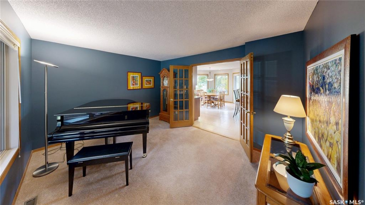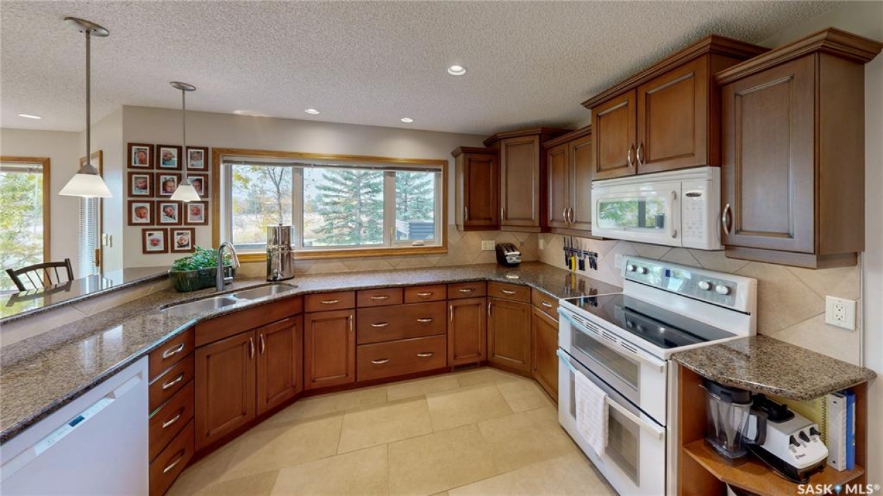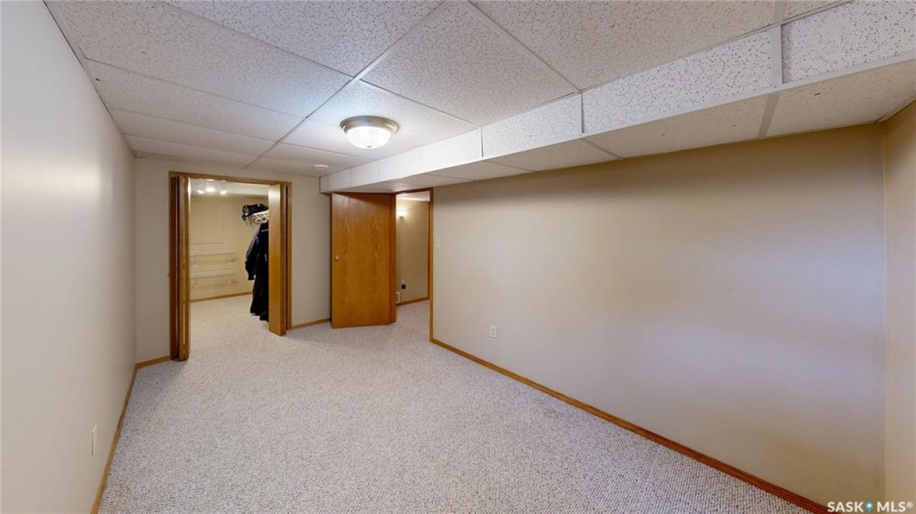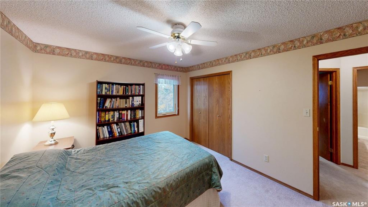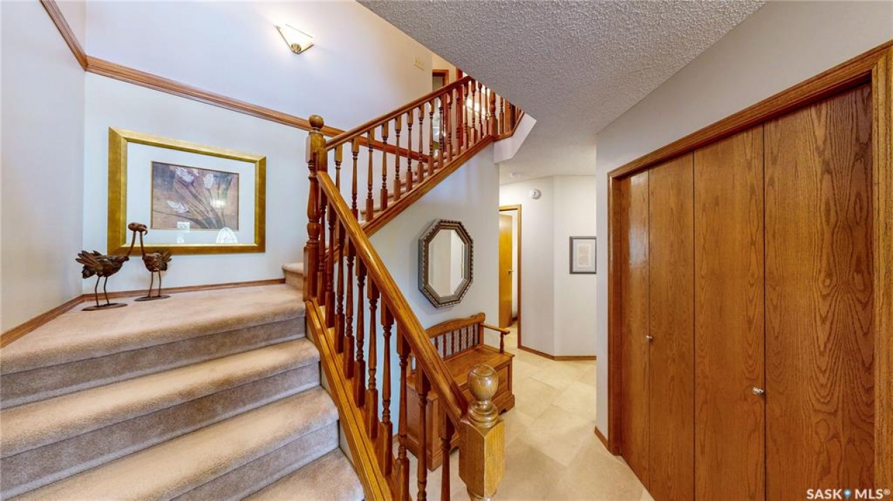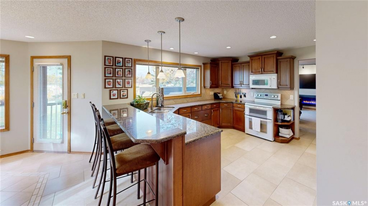 Welcome to 2631 Crocus Drive in the desirable Wood Meadows neighborhood close to WF Ready school and park, St. Marguerite School, and a short drive away from all the shopping amenities Regina's East End has. This original owner, 1991 built, 2588 square foot, 5 bedroom, 4 bathroom, 2 story house sits on a massive 8840 sqft irregular lot backing a walking path. The front yard has a lawn, pine tree, greenery and the double concrete driveway that leads to the 24'x24' double attached, insulated garage and covered front porch. There are 18 solar panels on the roof! The backyard has an endless lawn, trees and shrubs, a patio with an included pergola, a garden, a fenced area and a shed! You enter this home into the foyer that has a coat closet. Next is the family room. Walking through french doors you enter into the large dining room that is surrounded by large windows that overlook the beautiful green space. The updated kitchen is next with a window overlooking the back yard, cappuccino maple cabinets, granite counter tops and the included fridge, stove, microwave hood fan and built-in dishwasher are all included. Next is the living room with carpet flooring, a bay window, and a beautiful electric fireplace. The main floor is finished off with a 2pc bathroom, the door to the garage and a laundry room with a sink and cabinetry. Upstairs are 2 good sized bedrooms with ample closet space, the main 4pc bathroom with double sinks, another bedroom, and then the huge bonus room. The 2nd floor is completed with a large primary bedroom with a walk-in closet as well as a 4pc ensuite bathroom featuring a jet tub. The finished basement starts out with a large rec room, another large bedroom with a walk in closet and is finished off with a 3pc bathroom and the utility room that has 2 high efficiency furnaces (2015), the owned gas water heater (2024) and brand new water softener (2025). This house has also received updated windows throughout, and has central air conditioning!