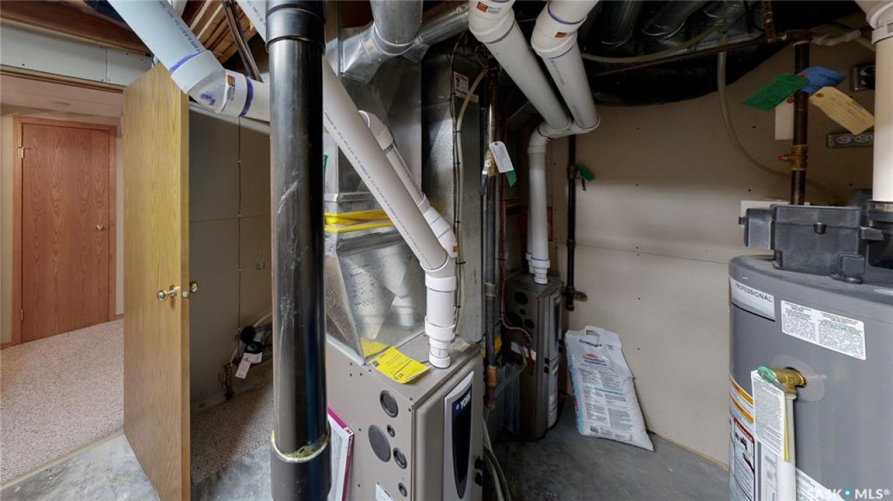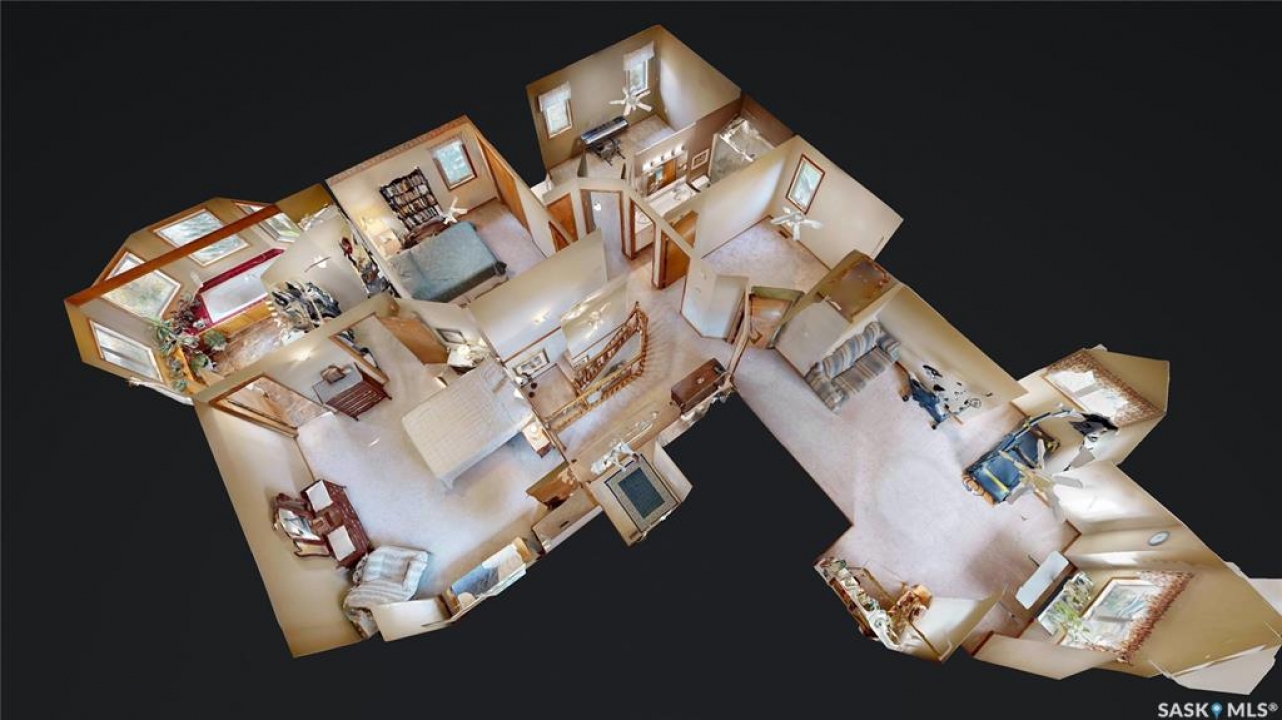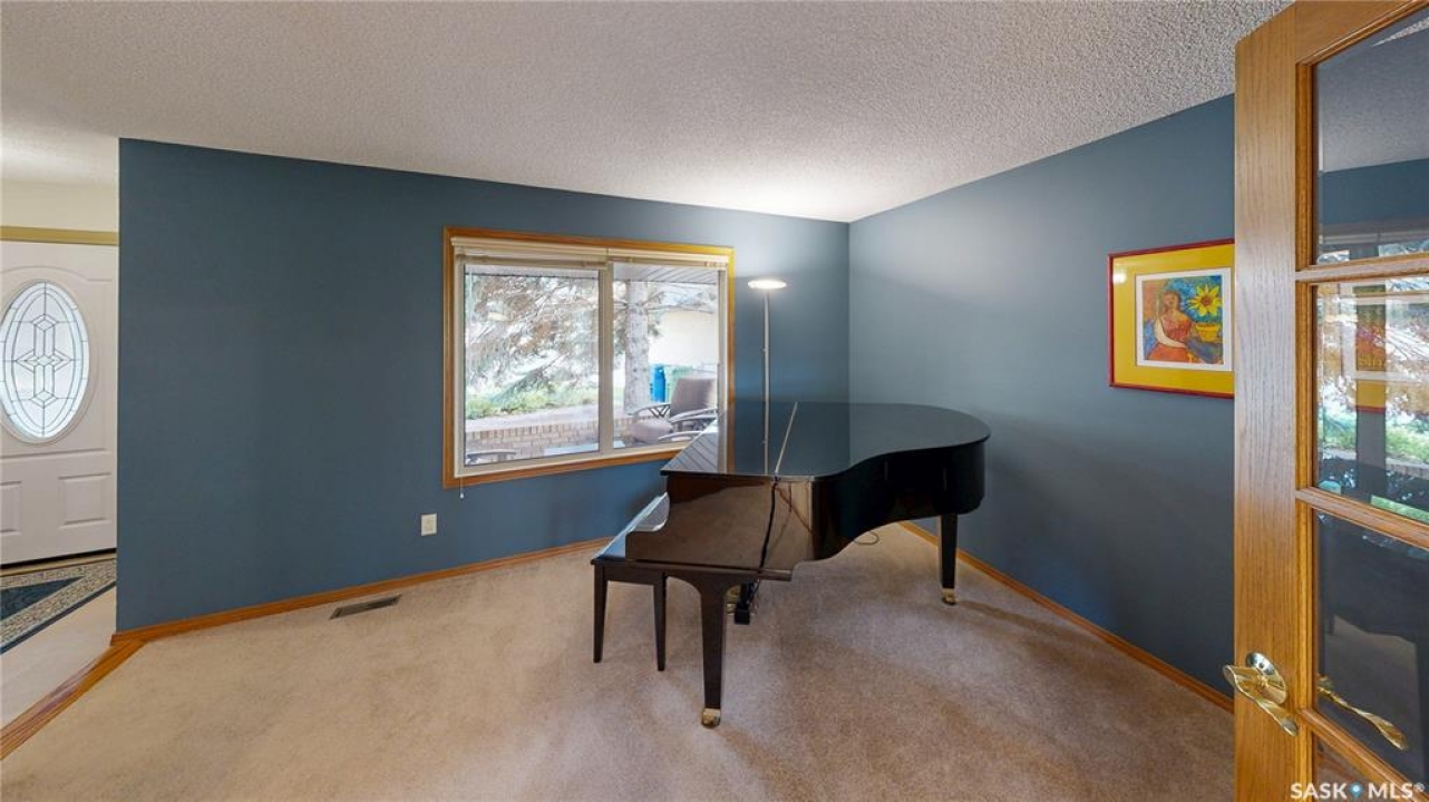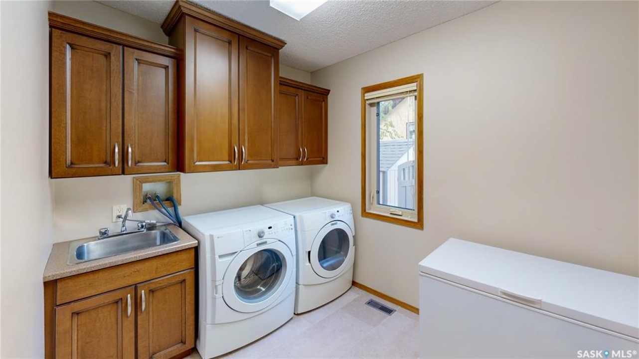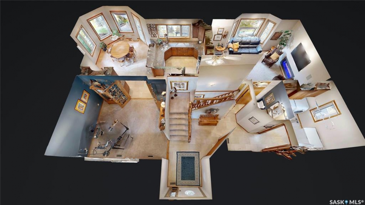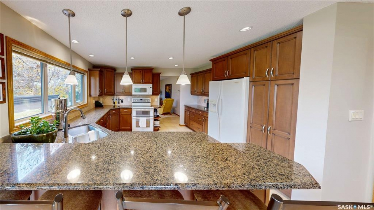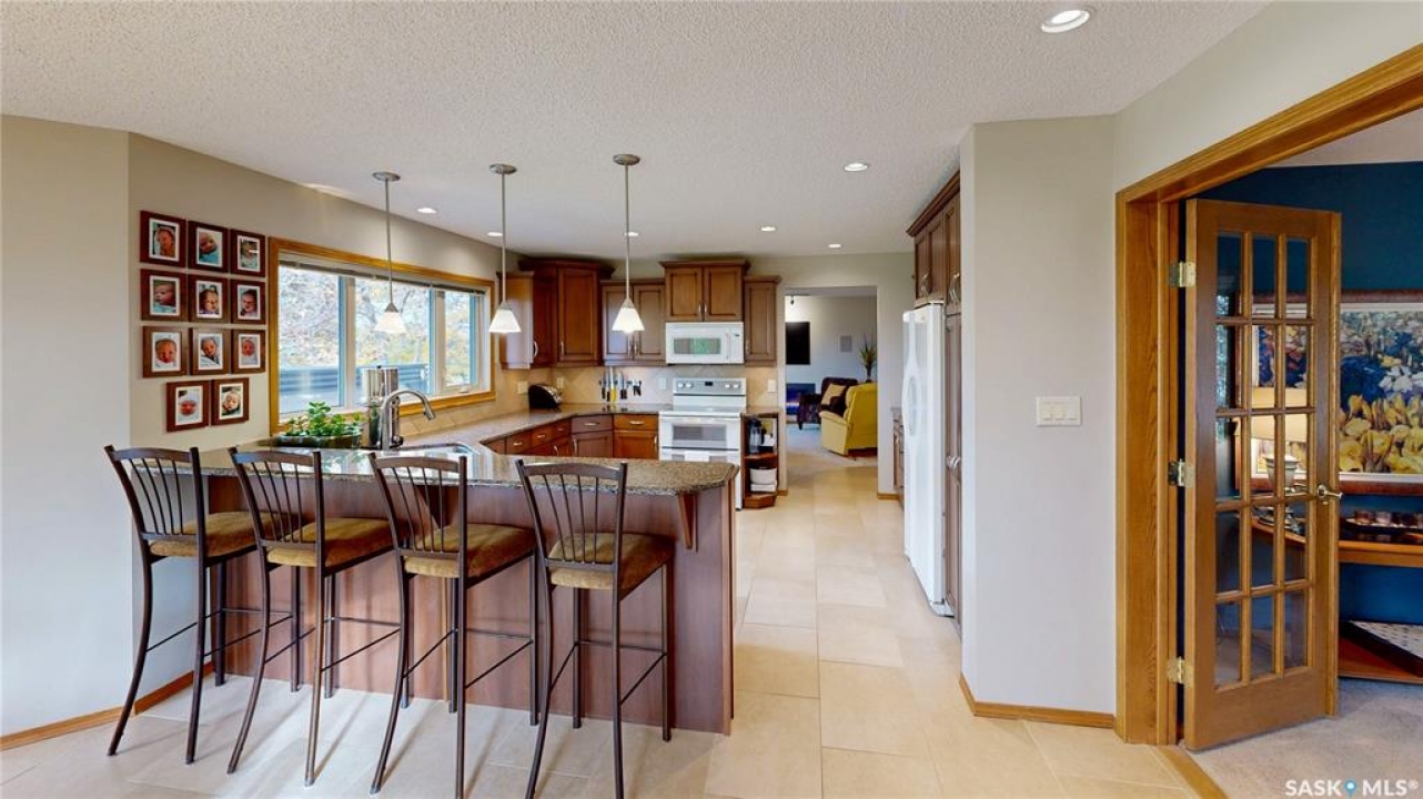 Welcome to 2631 Crocus Drive in the desirable Wood Meadows neighborhood close to WF Ready school and park, St. Marguerite School, and a short drive away from all the shopping amenities Regina's East End has. This original owner, 1991 built, 2588 square foot, 5 bedroom, 4 bathroom, 2 story house sits on a massive 8840 sqft irregular lot backing a walking path. The front yard has a lawn, pine tree, greenery and the double concrete driveway that leads to the 24'x24' double attached, insulated garage and covered front porch. There are 18 solar panels on the roof! The backyard has an endless lawn, trees and shrubs, a patio with an included pergola, a garden, a fenced area and a shed! You enter this home into the foyer that has a coat closet. Next is the family room. Walking through french doors you enter into the large dining room that is surrounded by large windows that overlook the beautiful green space. The updated kitchen is next with a window overlooking the back yard, cappuccino maple cabinets, granite counter tops and the included fridge, stove, microwave hood fan and built-in dishwasher are all included. Next is the living room with carpet flooring, a bay window, and a beautiful electric fireplace. The main floor is finished off with a 2pc bathroom, the door to the garage and a laundry room with a sink and cabinetry. Upstairs are 2 good sized bedrooms with ample closet space, the main 4pc bathroom with double sinks, another bedroom, and then the huge bonus room. The 2nd floor is completed with a large primary bedroom with a walk-in closet as well as a 4pc ensuite bathroom featuring a jet tub. The finished basement starts out with a large rec room, another large bedroom with a walk in closet and is finished off with a 3pc bathroom and the utility room that has 2 high efficiency furnaces (2015), the owned gas water heater (2024) and brand new water softener (2025). This house has also received updated windows throughout, and has central air conditioning!