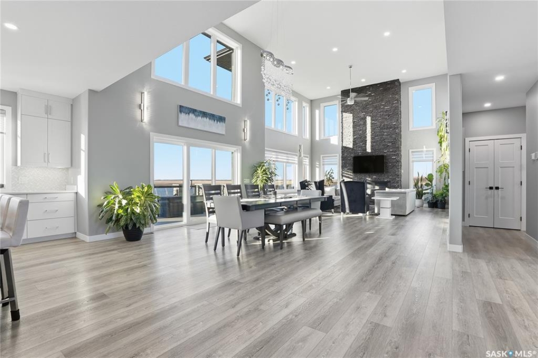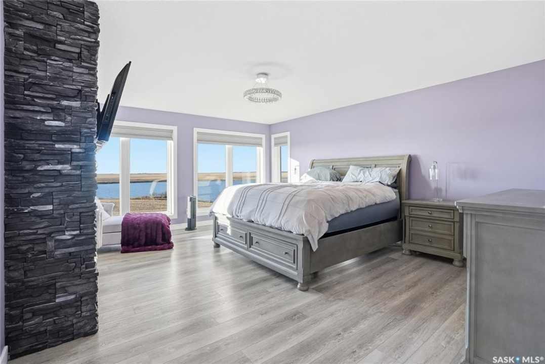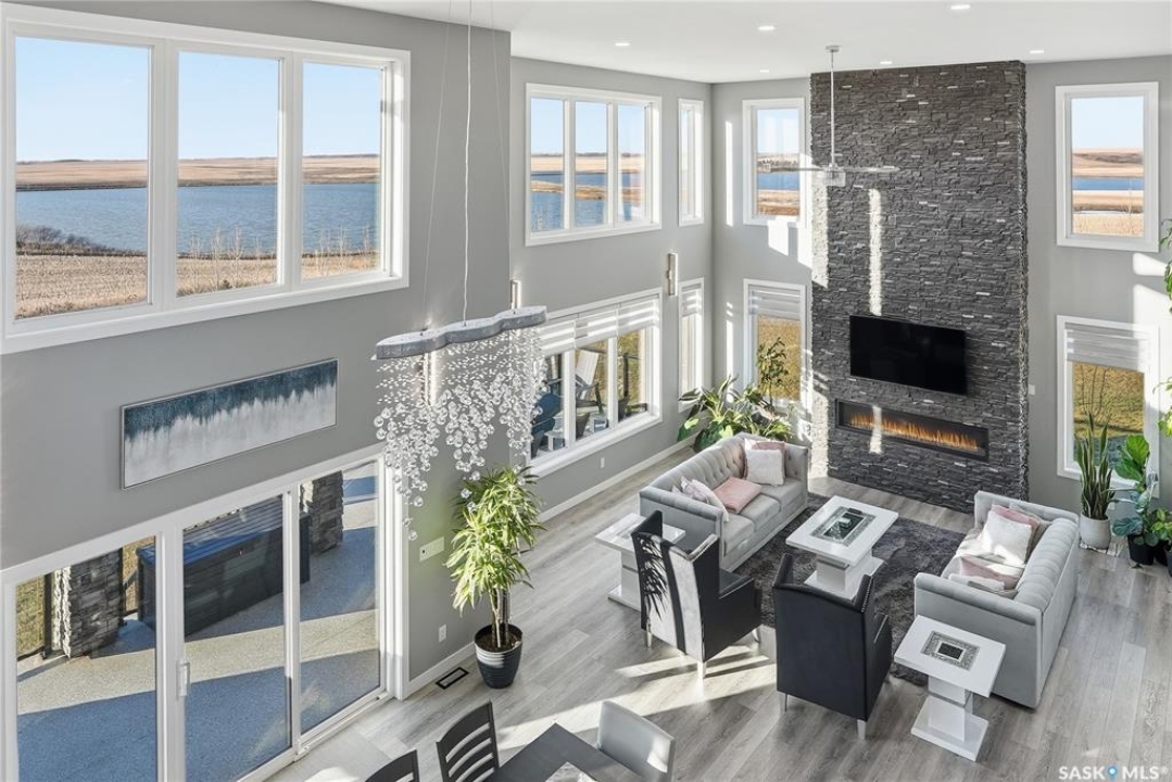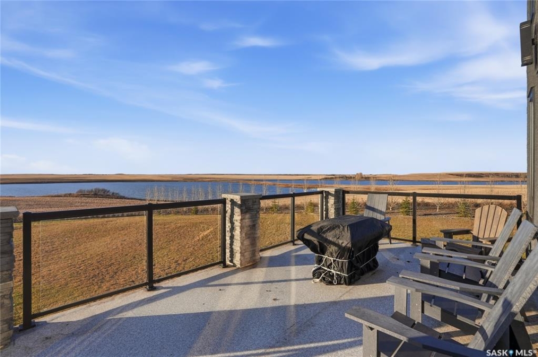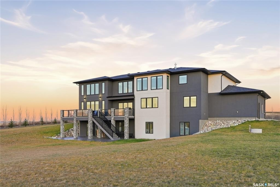 Located 30 minutes east of Saskatoon, this exceptional 2021 custom-built two-storey home spans over 3,700 sq. ft. above grade with a fully finished walkout basement, perfectly positioned to capture sweeping views of rolling hills and endless sunsets. The main floor's open-concept design showcases a chef-inspired kitchen, elegant dining area, and a grand great room with a striking gas fireplace framed by expansive windows. A spacious mudroom seamlessly connects to the heated 3-car garage, complemented by an additional single garage. The main level also features a private office, laundry, and powder room. Upstairs, discover an impressive bonus room and a luxurious primary bedroom complete with a spa-style 5-piece ensuite and a walk-in closet designed to impress, plus two additional bedrooms and a 4-piece bath. The walkout level extends the living space with two more bedrooms, a full bath, a family room with a gas fireplace and wet bar, and a fitness room. With city water, dual furnaces and A/C units, in-floor heat in the garage and basement, a mature shelterbelt, and absolute peace and privacy, this remarkable property redefines country luxury. You'll want to see this incredible property for yourself!