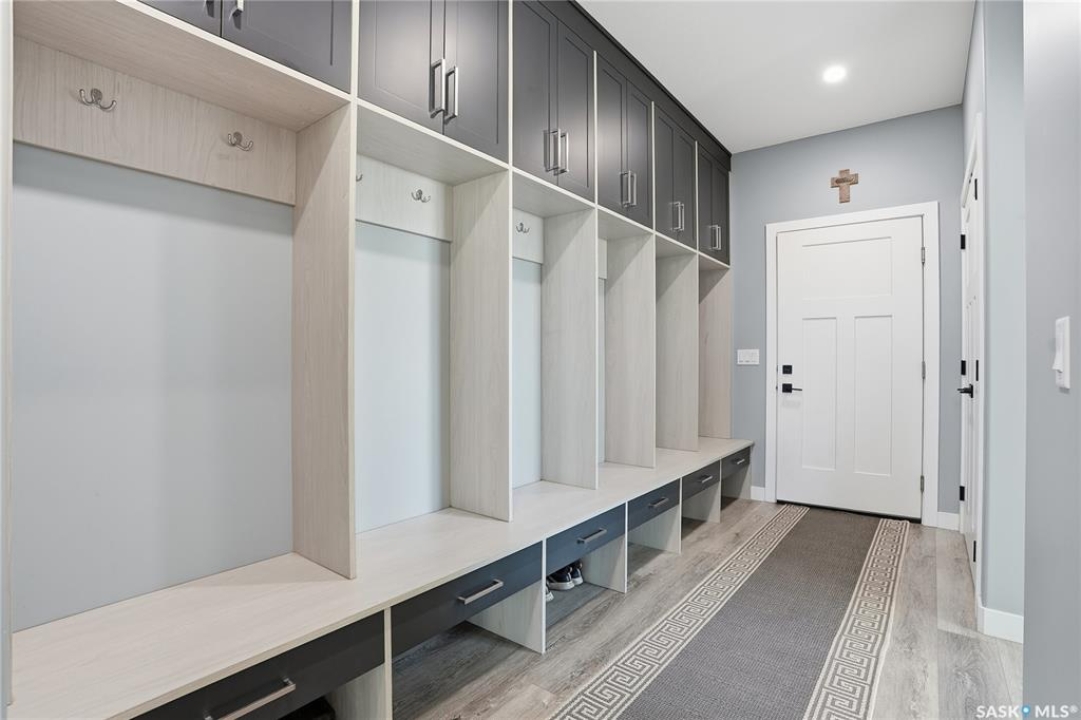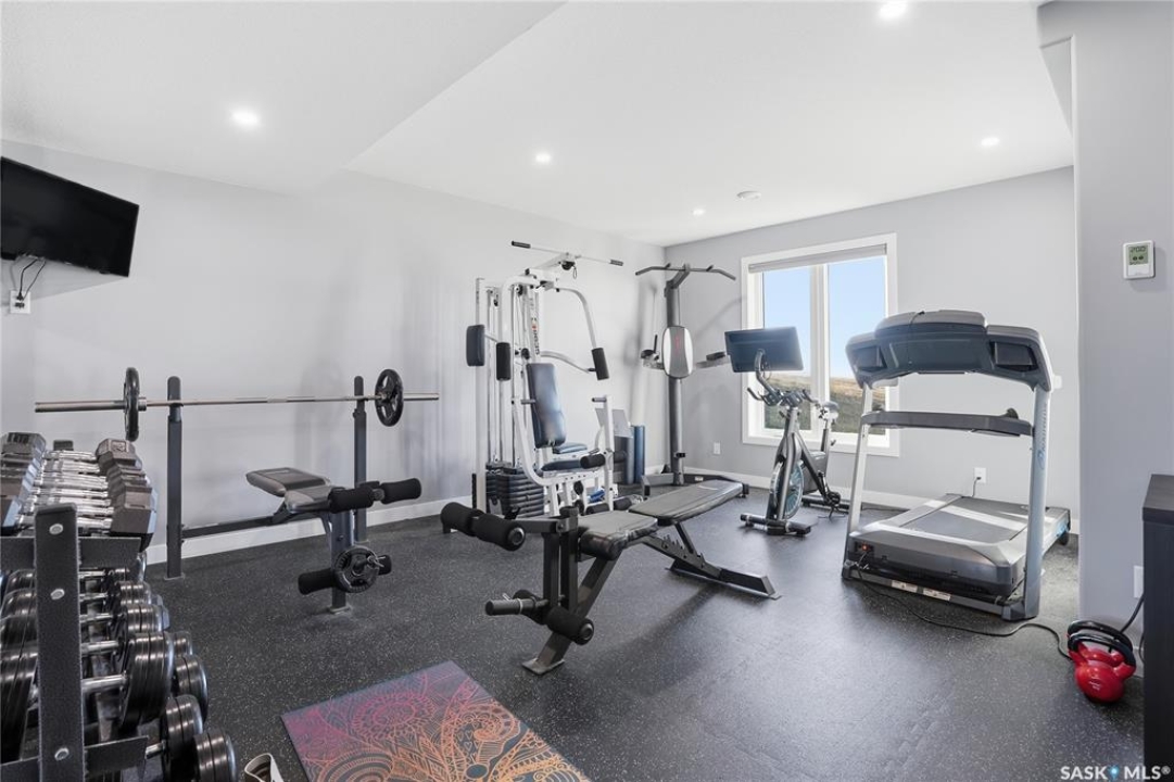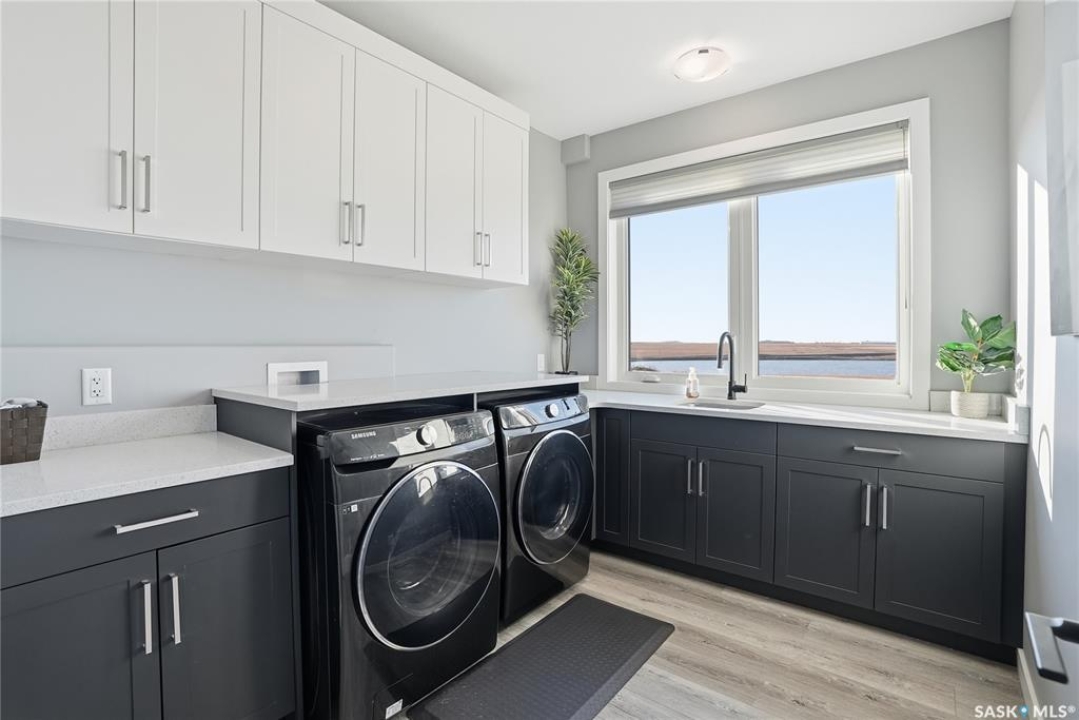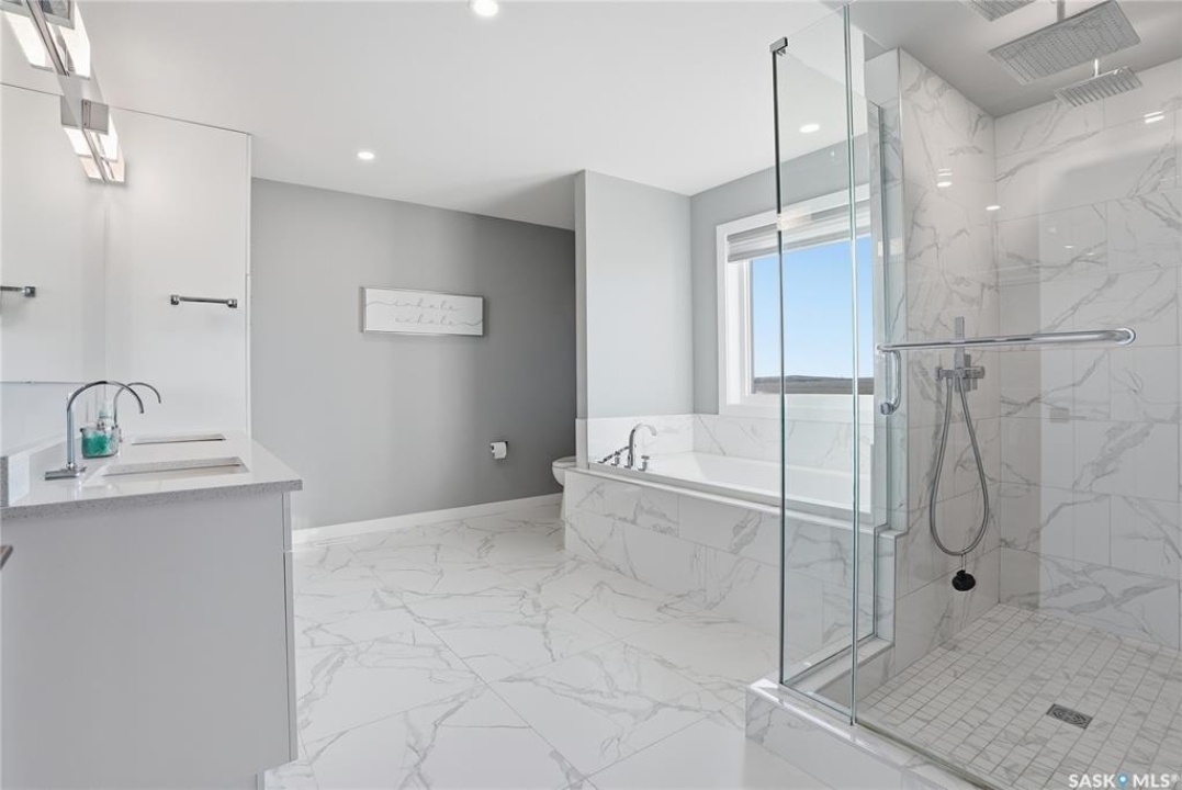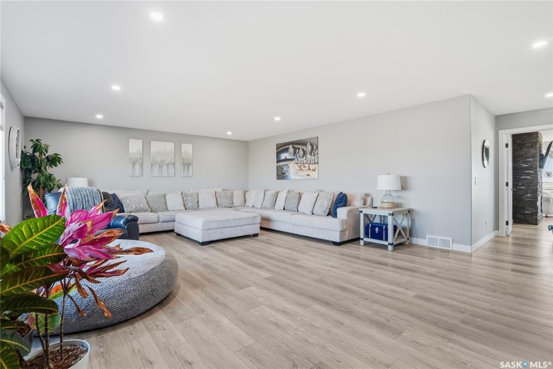 Located 30 minutes east of Saskatoon, this exceptional 2021 custom-built two-storey home spans over 3,700 sq. ft. above grade with a fully finished walkout basement, perfectly positioned to capture sweeping views of rolling hills and endless sunsets. The main floor's open-concept design showcases a chef-inspired kitchen, elegant dining area, and a grand great room with a striking gas fireplace framed by expansive windows. A spacious mudroom seamlessly connects to the heated 3-car garage, complemented by an additional single garage. The main level also features a private office, laundry, and powder room. Upstairs, discover an impressive bonus room and a luxurious primary bedroom complete with a spa-style 5-piece ensuite and a walk-in closet designed to impress, plus two additional bedrooms and a 4-piece bath. The walkout level extends the living space with two more bedrooms, a full bath, a family room with a gas fireplace and wet bar, and a fitness room. With city water, dual furnaces and A/C units, in-floor heat in the garage and basement, a mature shelterbelt, and absolute peace and privacy, this remarkable property redefines country luxury. You'll want to see this incredible property for yourself!
