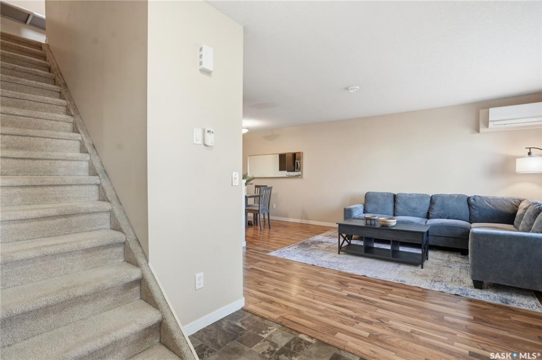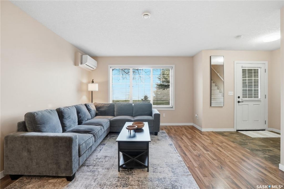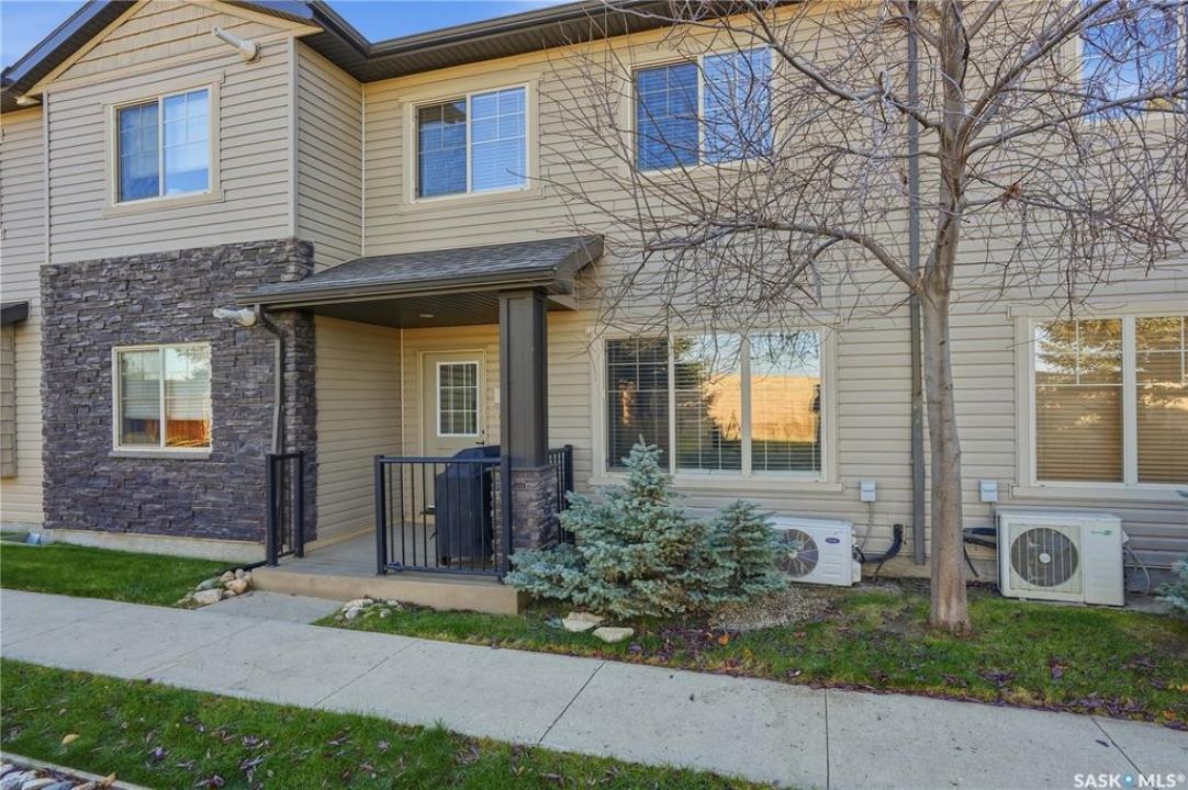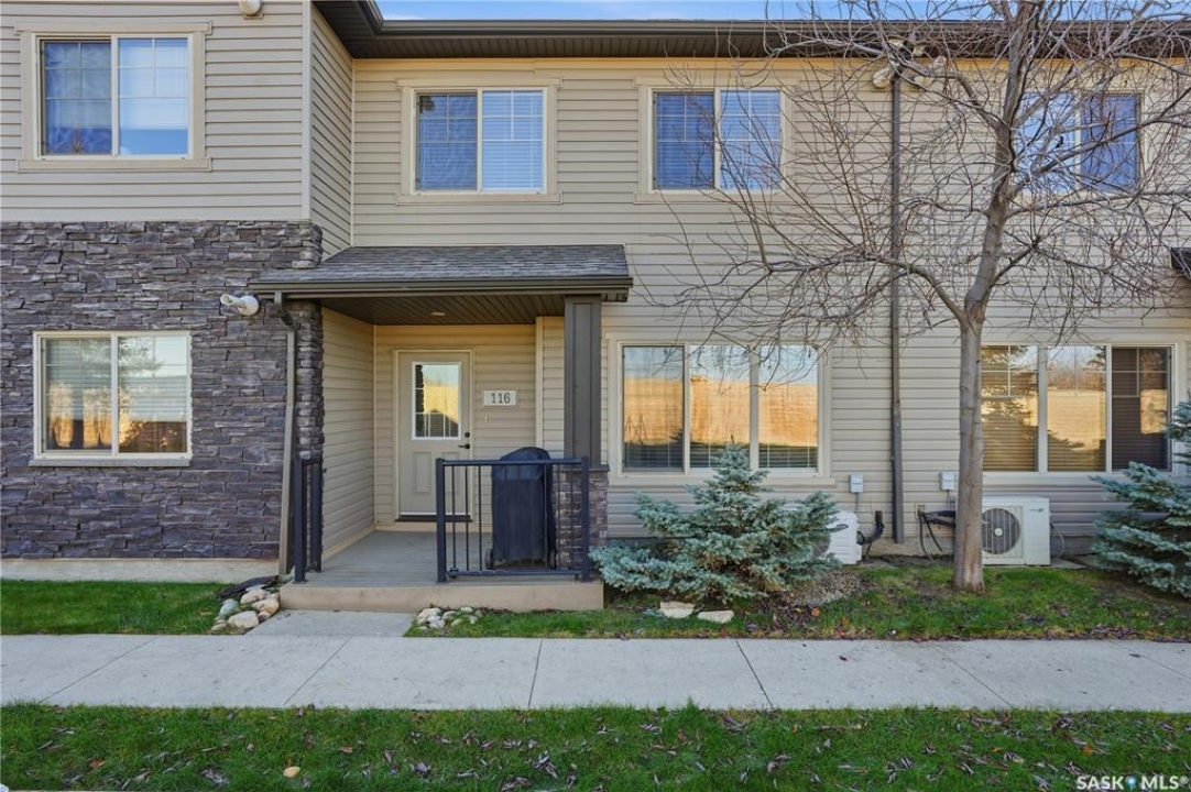 Welcome to Unit 116 at 5521 Blake Crescent! This inviting two-storey condo offers comfort, convenience, and a peaceful setting — located on the north side of the complex with a private view of the green space. As you approach, you'll appreciate the charming front patio area — the perfect spot to unwind and enjoy warm summer evenings. Inside, the open-concept main floor is bright and spacious, featuring a large living area, a modern kitchen with a full stainless steel appliance package, a generous pantry, and a dedicated dining space that easily accommodates family gatherings or entertaining friends. Upstairs, you'll find two north-facing bedrooms, including a primary suite with a walk-in closet, a full 4-piece bathroom, and a conveniently located laundry area. This well-kept home is efficiently heated with in-floor heating to help keep utility costs low, and also includes a recently upgraded wall-mounted A/C unit and window coverings. Located within walking distance to many of Regina's northwest amenities, this condo offers the perfect balance of privacy and accessibility. Whether you're a first-time buyer, downsizing, or looking for a low-maintenance lifestyle — this home checks all the boxes!