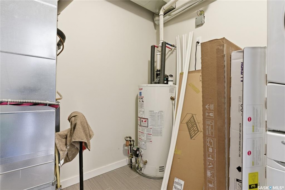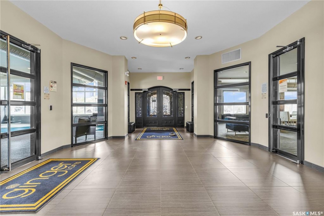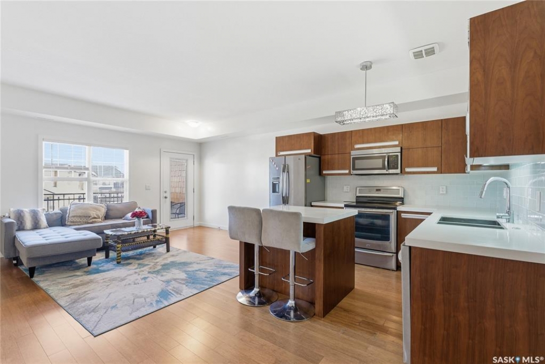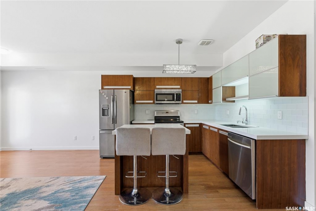 Discover the largest unit in the Ginger Lofts complex, featuring the most expansive balcony and two electrified parking stalls. This modern, open-concept second-floor condo offers a bright and functional layout, perfect for comfortable living and entertaining. The inviting living room opens onto a large east-facing balcony, ideal for enjoying your morning coffee or evening relaxation. The stylish kitchen showcases quartz countertops, stainless steel appliances, and a generous dining area — all enhanced by beautiful bamboo hardwood flooring throughout the main living spaces. This unit includes two well-sized bedrooms and a spacious four-piece bathroom featuring a quartz countertop and porcelain tile flooring. The in-suite laundry, conveniently located in the utility room, also provides additional storage space. Residents enjoy access to an impressive clubhouse equipped with an indoor saltwater pool, saltwater hot tub, fully outfitted fitness room suitable for all levels, a lounge with billiards, a furnished patio area, outdoor BBQs, and more. With low condo fees, this property presents an excellent opportunity for first-time buyers, students, or investors alike. Ideally situated close to all amenities in Brighton, with quick access to the freeway and the University of Saskatchewan. Call today to schedule your private viewing and experience all that this exceptional property has to offer.