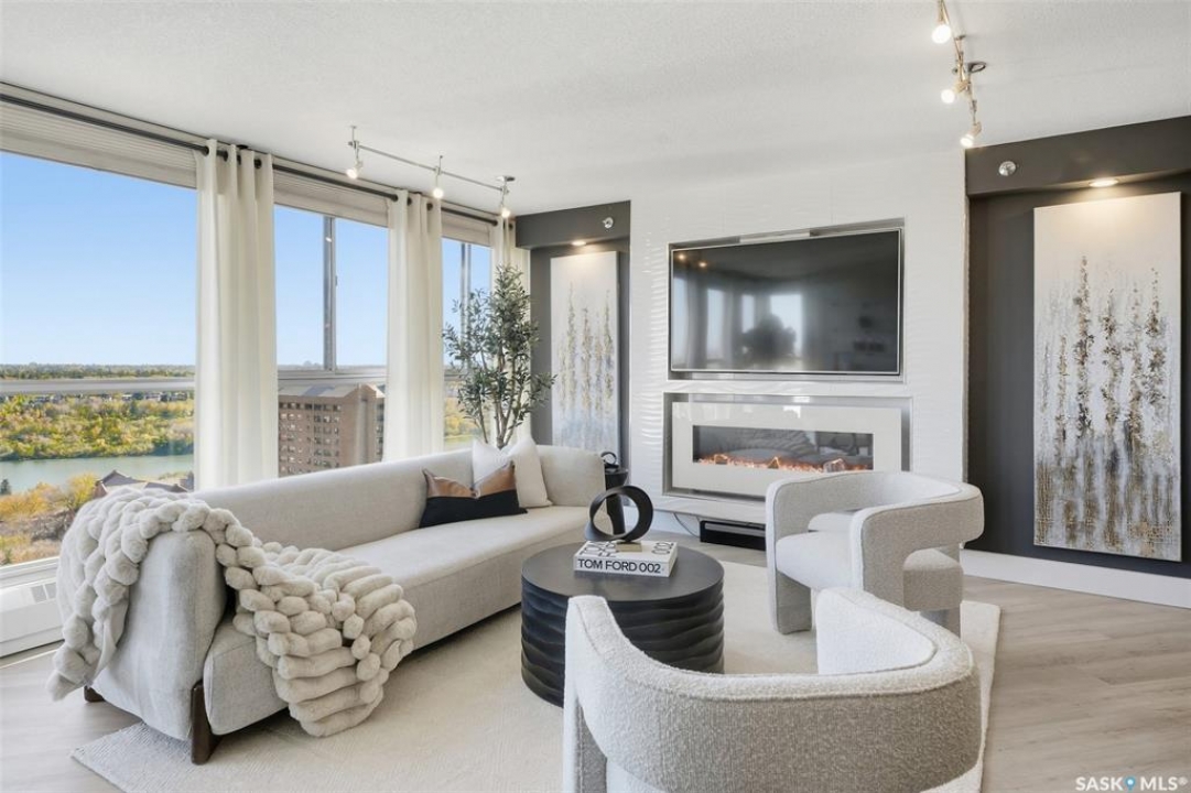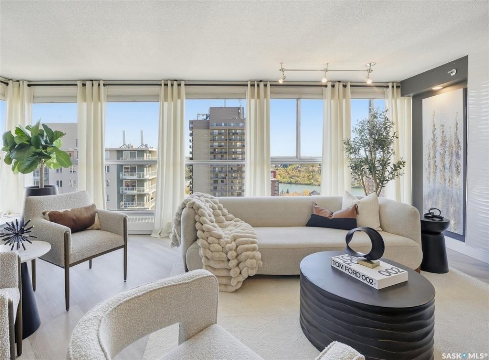 Experience Downtown Saskatoon Penthouse Living with an amazing View of the River! Indulge your desire for high-end, maintenance-free living with this breathtaking 1,528 sqft Penthouse Condominium in the vibrant core of Saskatoon. Far more than a home, this is a lifestyle defined by convenience and sophistication, boasting an enviable Walk Score of 96 and a Bike Score of 99. This professionally renovated sanctuary is a testament to modern design. The stunning kitchen is a chef's dream, featuring upgraded appliances, sleek quartz countertops, and a generous island with a sit-up bar that flows seamlessly into the main living space. The entire unit has been elevated with modern flooring, designer paint tones, and updated light fixtures, culminating in the removal & replacement of the dated ceiling for a smooth, contemporary finish. Designer touches by Fresco Interiors, including but not limited to custom drapery, add a final touch of tailored elegance. Upgraded blinds throughout give you privacy when you want it most. Step outside and immerse yourself in the city's best. You are mere steps from the 60 km of trails in the serene Meewasin Valley. Enjoy cultural gems like the Remai Modern, Persephone Theatre, and the charming seasonal Shakespeare on the Saskatchewan. Every amenity—from fine dining and popular taverns to museums and nature parks—is just a short, pleasant stroll away. The Terrace amenities redefine community living, offering a large facility with a swimming pool, hot tub, sauna, an adjacent indoor lounge, and an expansive outdoor patio with community barbecues. For an even more spectacular experience, retreat to the rooftop patio for breathtaking, panoramic city views. Your exclusive, heated covered parking spot means you can safely forget about your vehicle and embrace urban life. Don't just move... move up! Call today for a private viewing of this affordable, classy, and perfectly located penthouse on Fifth Avenue.