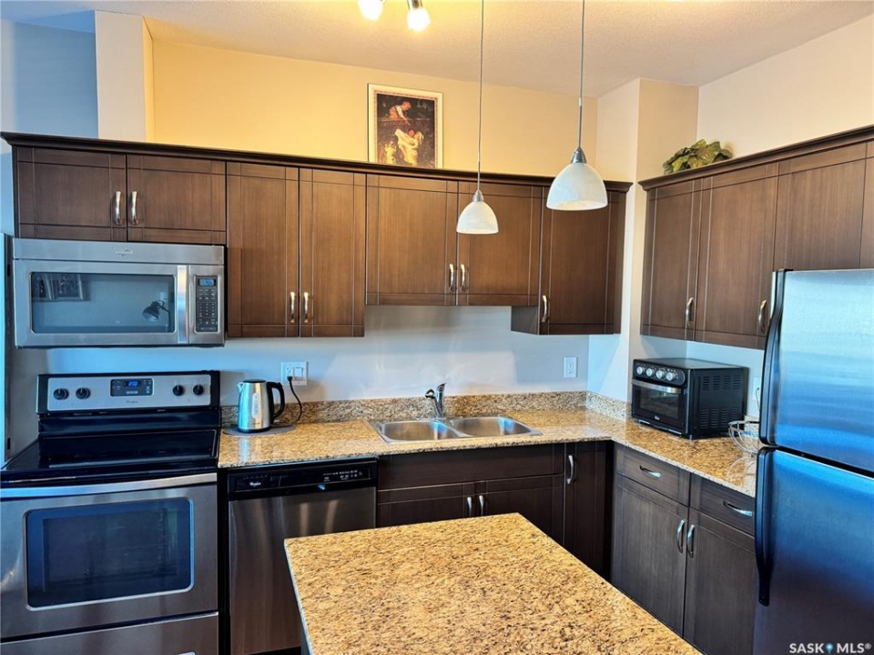 Affordable comfort meets modern convenience — your perfect start in Blairmore. Welcome to this stylish and functional 1-bedroom, 1-bathroom condo offering 580 sq ft of thoughtfully designed living space in the heart of Blairmore. With 9 ft ceilings and a bright open-concept layout, this second-floor unit feels spacious and inviting from the moment you walk in. The kitchen features sleek stone countertops and plenty of workspace, while the generous living area opens onto a large north-facing balcony — complete with a natural gas BBQ hookup for effortless outdoor dining. You'll love the oversized storage/laundry room that provides exceptional functionality and organization — a rare find in condo living! Enjoy the comfort of central air conditioning, a convenient surface parking stall, and elevator access in this well-kept building. Perfectly located within walking distance to all of Blairmore's shopping, restaurants, and amenities, this condo combines value and lifestyle in one package. Priced to sell — don't miss your chance! Book your showing today!