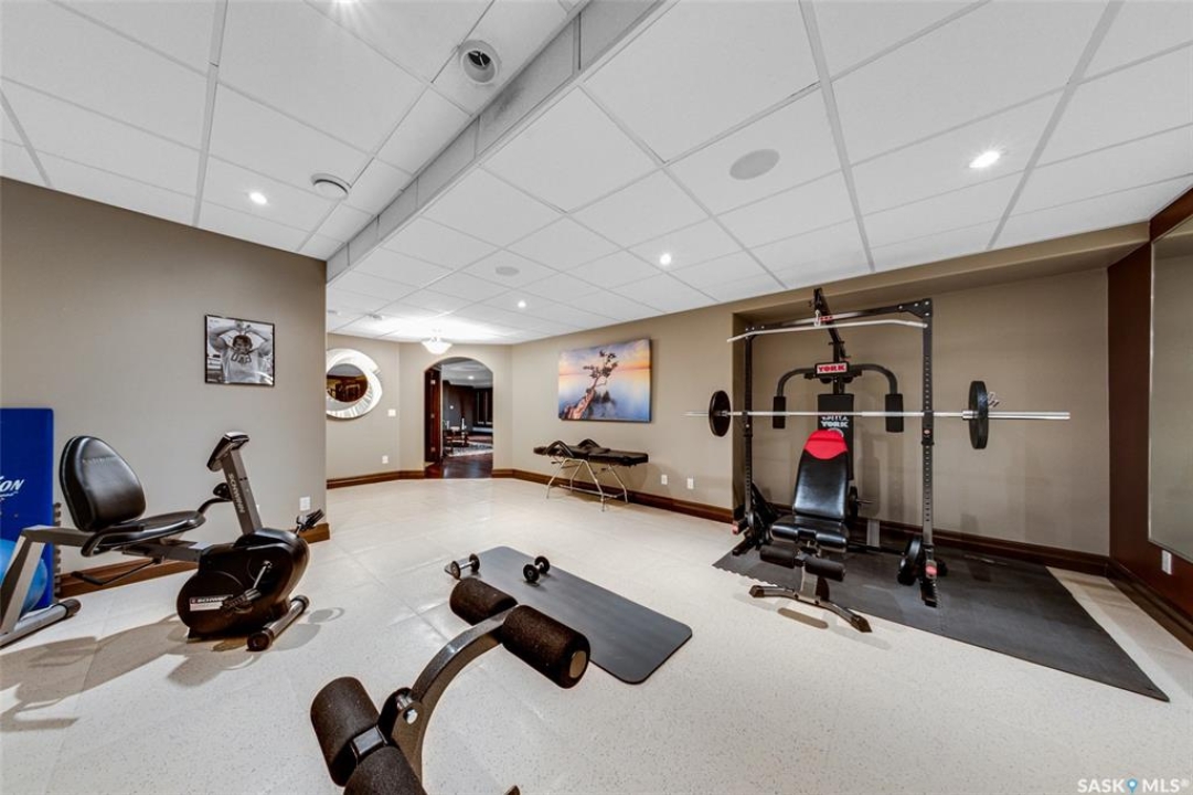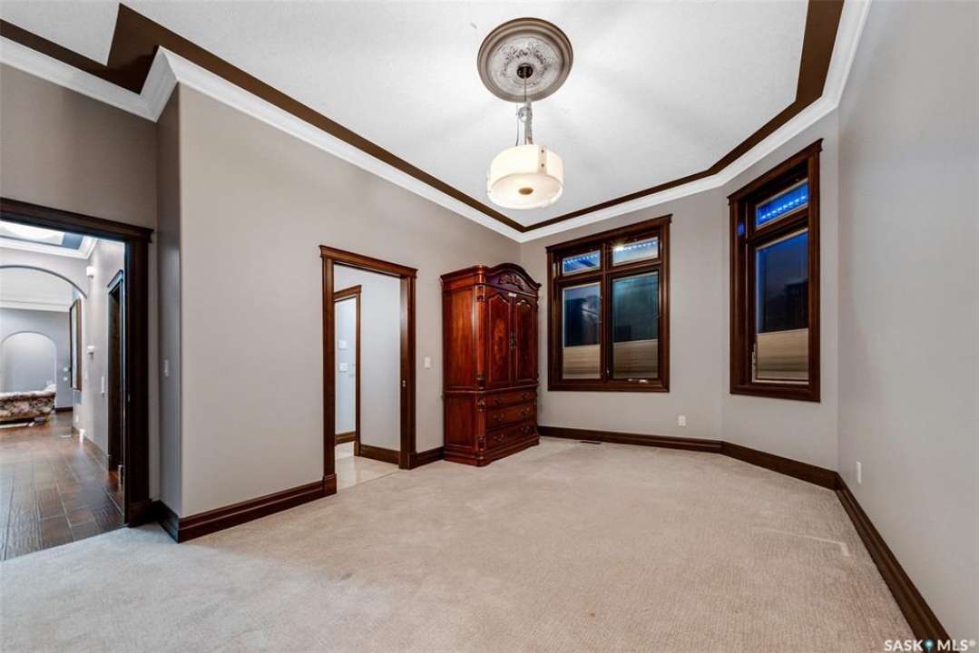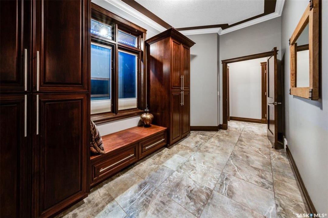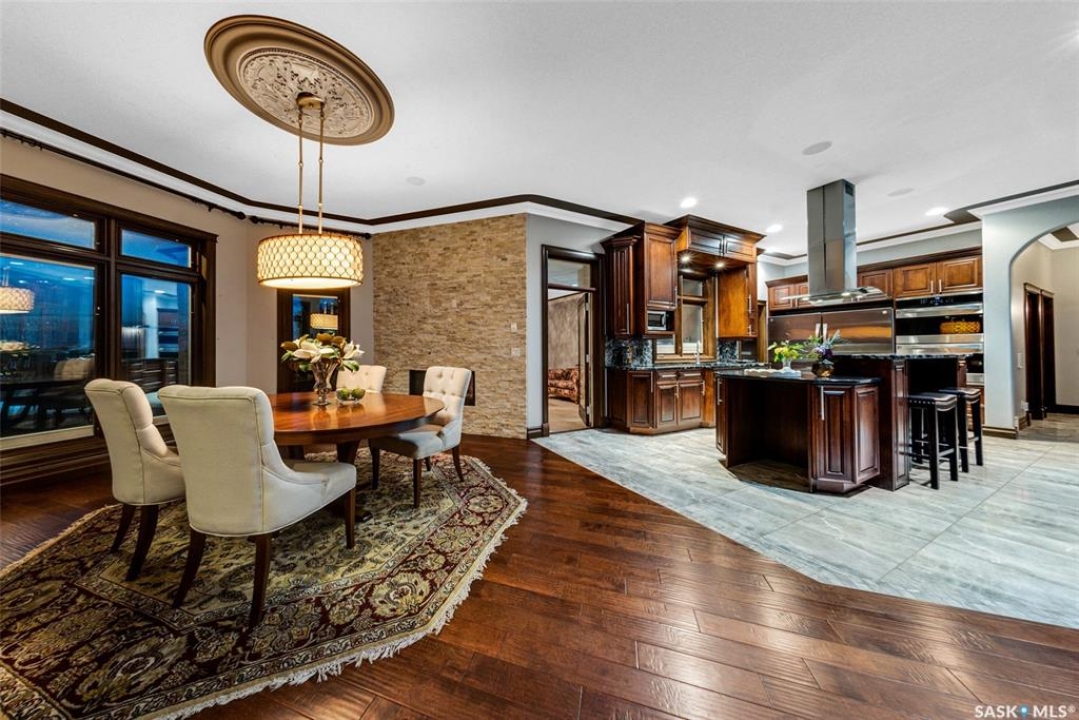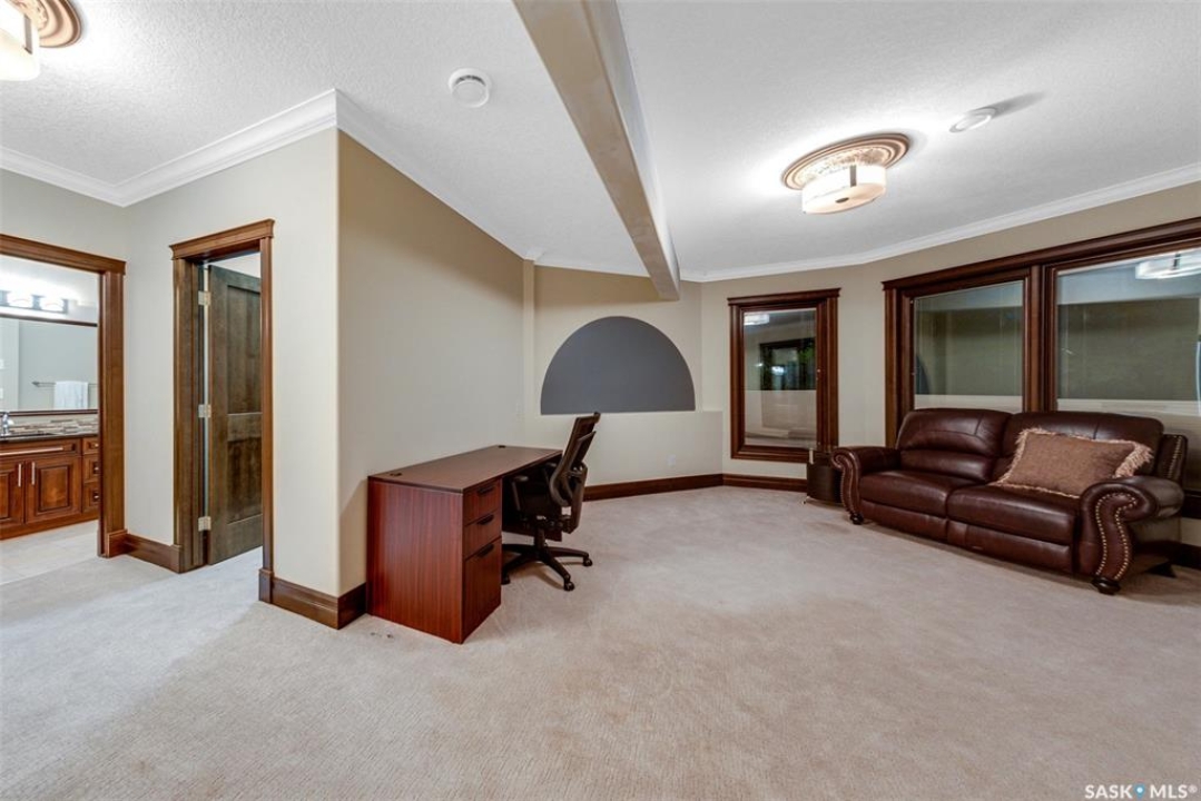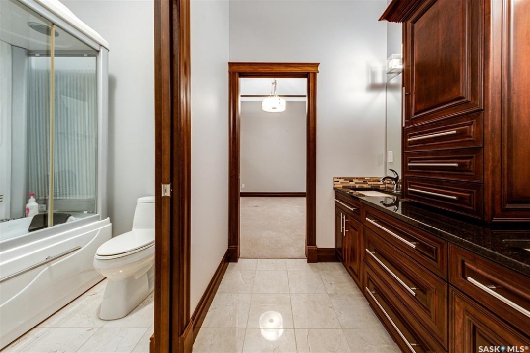 Welcome to one of Saskatoon's most prestigious estates. Located in the hamlet of Rivers Edge, this property is a mere 16 minute drive from the University of Saskatchewan. Perched atop the plateau of Rivers Edge the views from the home are breathtaking with access to the South Saskatchewan River below. Featured here is a 4406 square foot walkout bungalow that features 5 bedrooms, 5 bathrooms, in addition to a gorgeous nanny-suite which is designed to extend ownership longevity. As you walk through the main doors to the home you are greeted by a grand foyer which introduces you to the great room with 12' ceilings. Features that proliferate the home are solid wood cabinetry, casings, baseboards, jambs, doors, and millwork in addition to 6 gas-fireplaces. The walkout is complete with a beautiful wet bar, remarkable theatre room, and custom exercise area with steam shower. Outside you will find a sweeping 830 square foot deck that spans nearly the entire width of the home, complemented by over $250,000 of custom landscaping and road work. This property is truly extraordinary in every sense.