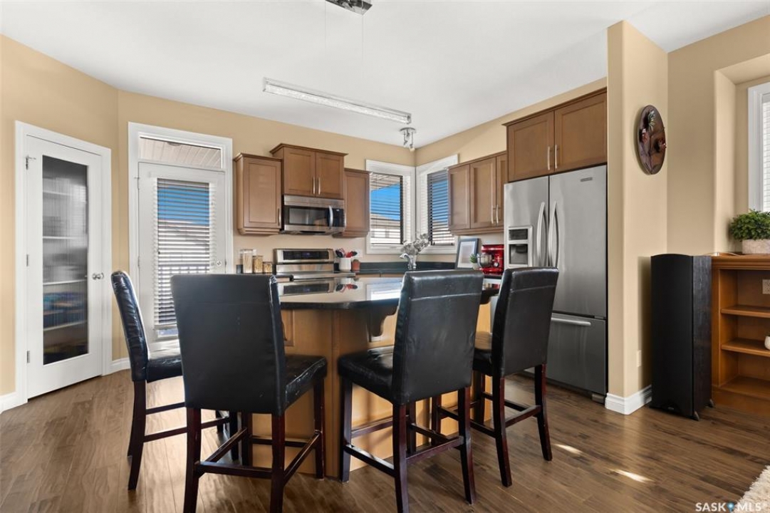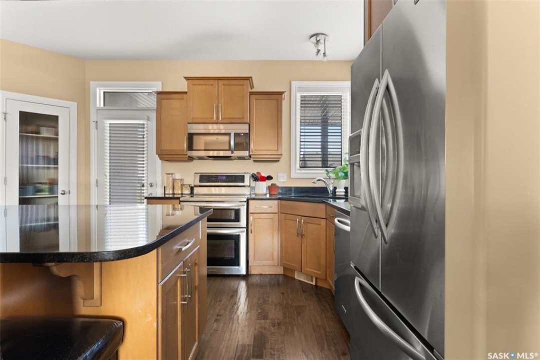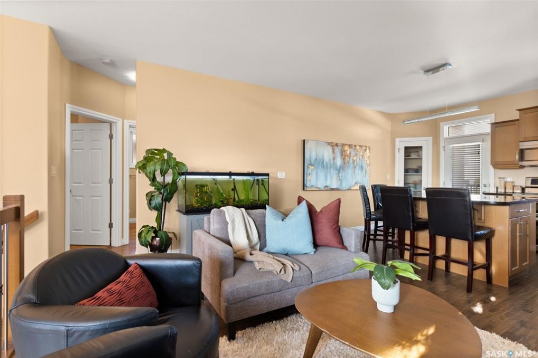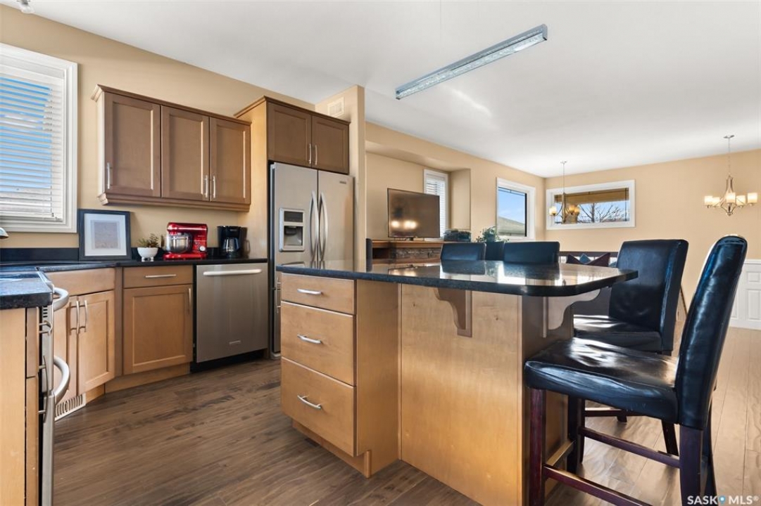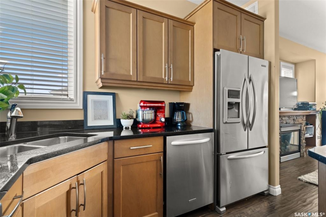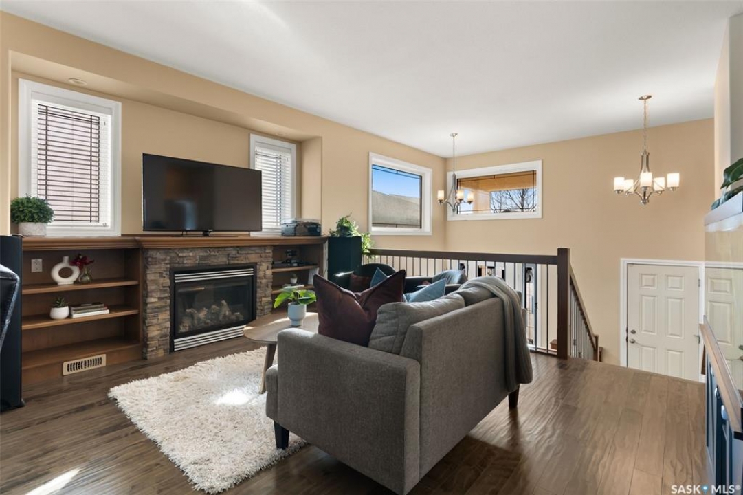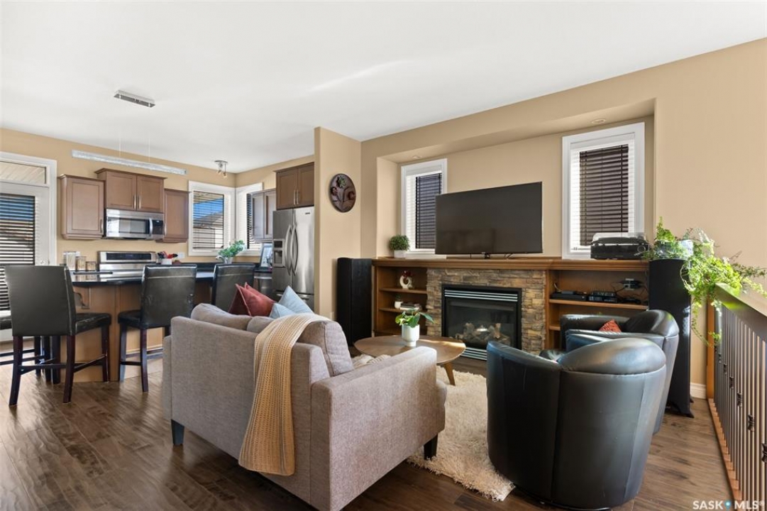 Welcome to 5241 Aerial Crescent, a beautifully maintained bi-level home in the heart of desirable Harbour Landing. Built in 2012, this 1,011 sq ft home offers great curb appeal with its stucco exterior accented by brick and a double attached garage. Step inside to a bright and open-concept main floor featuring laminate flooring throughout the living room and kitchen. The spacious living room is highlighted by a cozy gas fireplace with built-in shelving. The kitchen is a chef's delight with stainless steel appliances including a double oven, sleek black granite countertops, a large island with seating, and a convenient corner pantry. From the kitchen, access the covered deck with gas hook-up, perfect for BBQ season! The yard is fully fenced and ready for kids, pets, and entertaining. The primary suite is generous in size and offers a walk-in closet and a 3-piece ensuite with a tiled walk-in shower. A second bedroom and a 4-piece main bath complete the main floor. Downstairs, large windows fill the space with natural light. The fully developed basement features a spacious family room wired with surround sound, two additional bedrooms, and a 3-piece bath. The home also includes thoughtful extras such as storage under the stairs, newer washer and dryer, high-efficiency furnace, on-demand hot water, and a water softener/HRV system (rented through Reliance Mackenzie). This is a move-in ready home in a great family-friendly neighbourhood close to parks, schools, and all amenities. Offers to be reviewed Monday, November 17th at 1:00 PM.