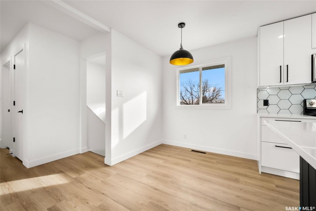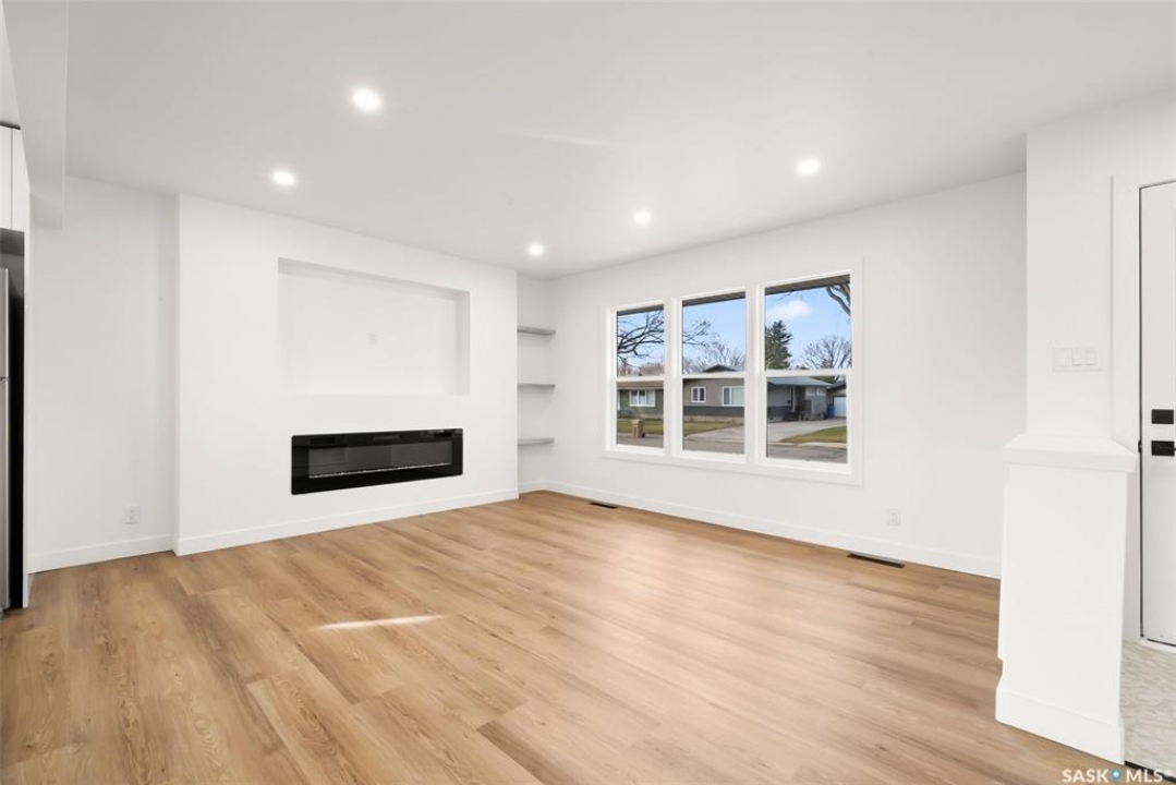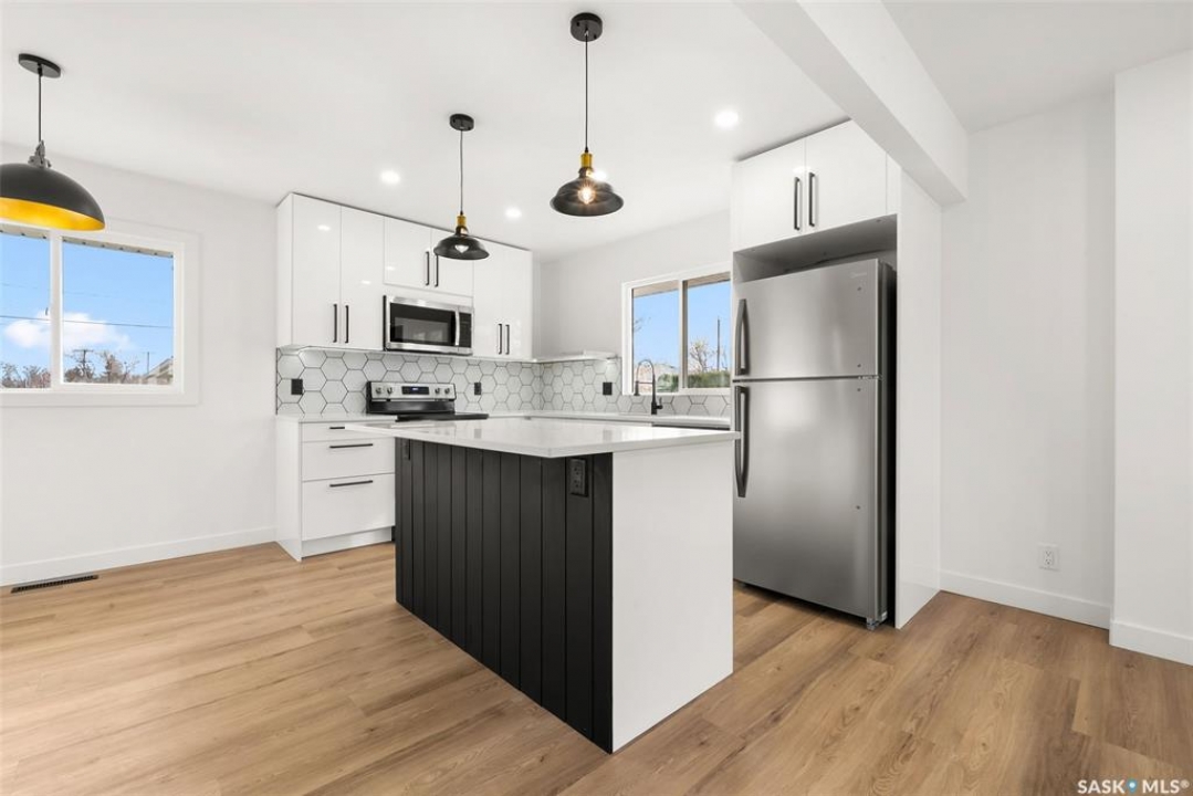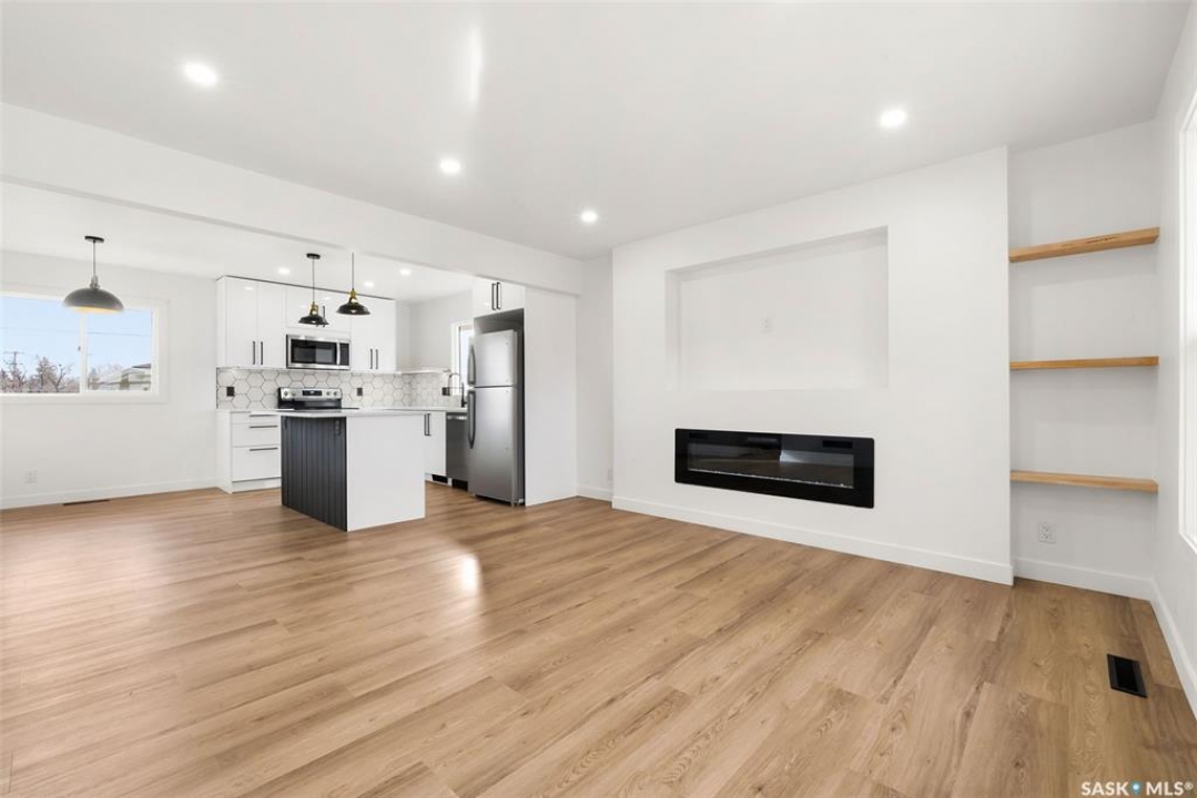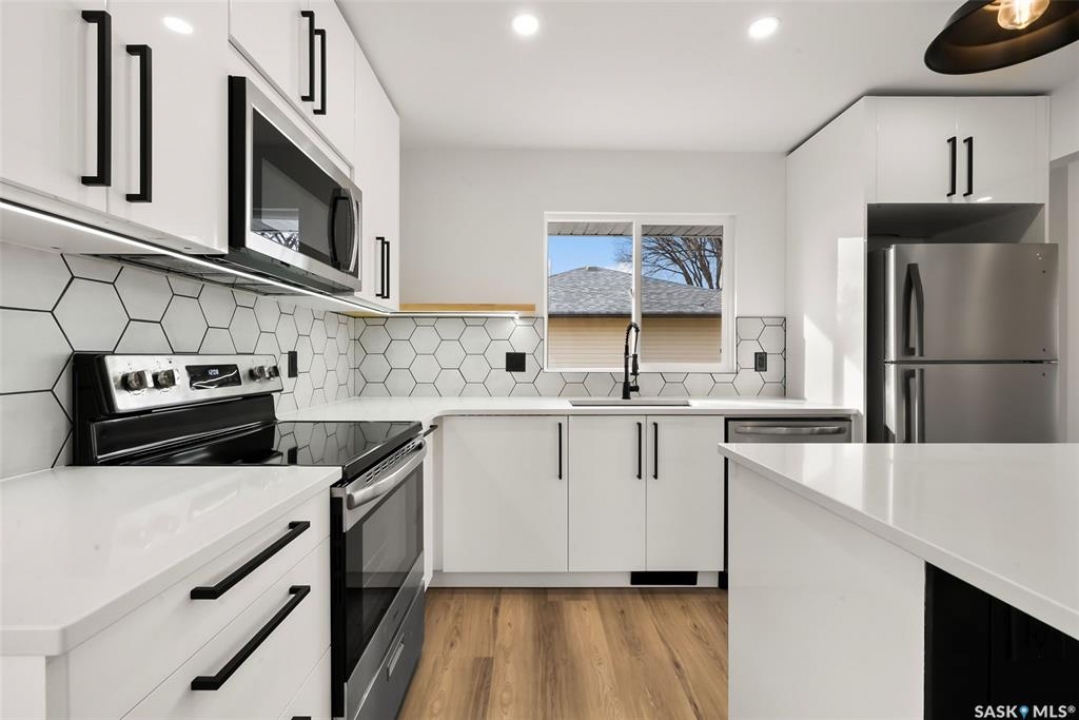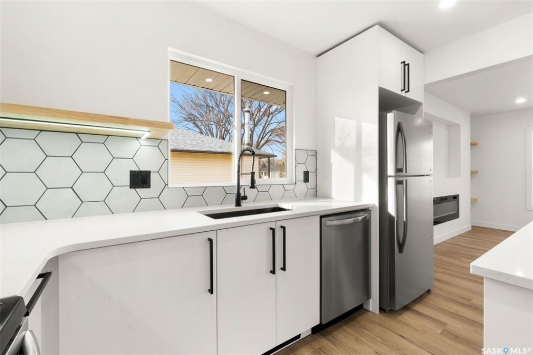 Located on one of the most desirable streets in the quiet Regent Park neighbourhood, this beautifully redeveloped home sits on a 7,000 sq. ft. lot backing green space! Professionally completed by Bouss Construction this property showcases quality craftsmanship and thoughtful design throughout. Step inside to a bright, open-concept main floor featuring sleek vinyl plank flooring and a neutral colour palette that feels fresh and inviting. The kitchen has been completely reimagined for both function and style, with quartz countertops, white cabinetry accented by black hardware, Hevea wood shelving, and a centre island with an eat-up bar. The dining area offers the perfect space for family dinners or entertaining. The living room features large windows and a custom feature wall with a built-in electric fireplace, TV insert and a side shelf for a modern, polished look. Down the hall are three spacious bedrooms and a fully renovated 4-piece bathroom showcasing custom tilework and updated fixtures. The basement extends your living space with a large rec room, a den ideal for a playroom or hobby area, an additional bedroom (window does not meet today's egress standards), a nicely curated 3-piece bathroom, and a laundry/utility room with extra storage. Outside, you'll find an oversized single detached garage equipped with a natural gas heater, plus a spacious yard perfect for kids or pets to enjoy. Additional value-added upgrades include new main-floor windows, new shingles on the house and garage, a newer water heater and brand-new kitchen appliances. This turnkey home offers the perfect combination of location, quality, and comfort — a rare find!