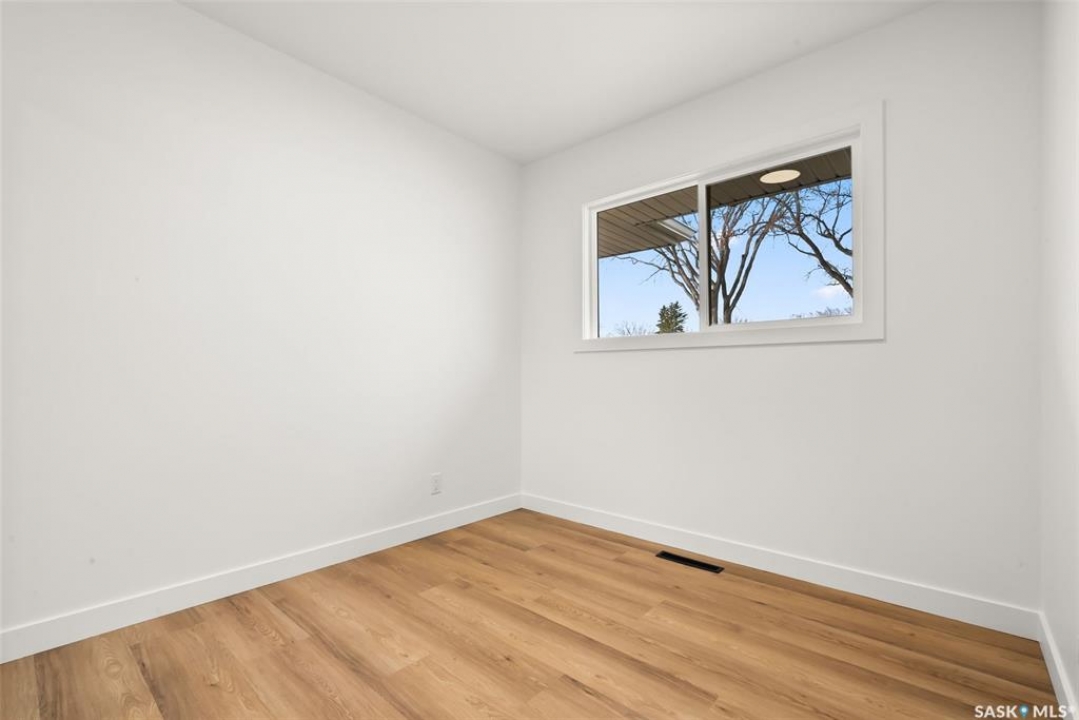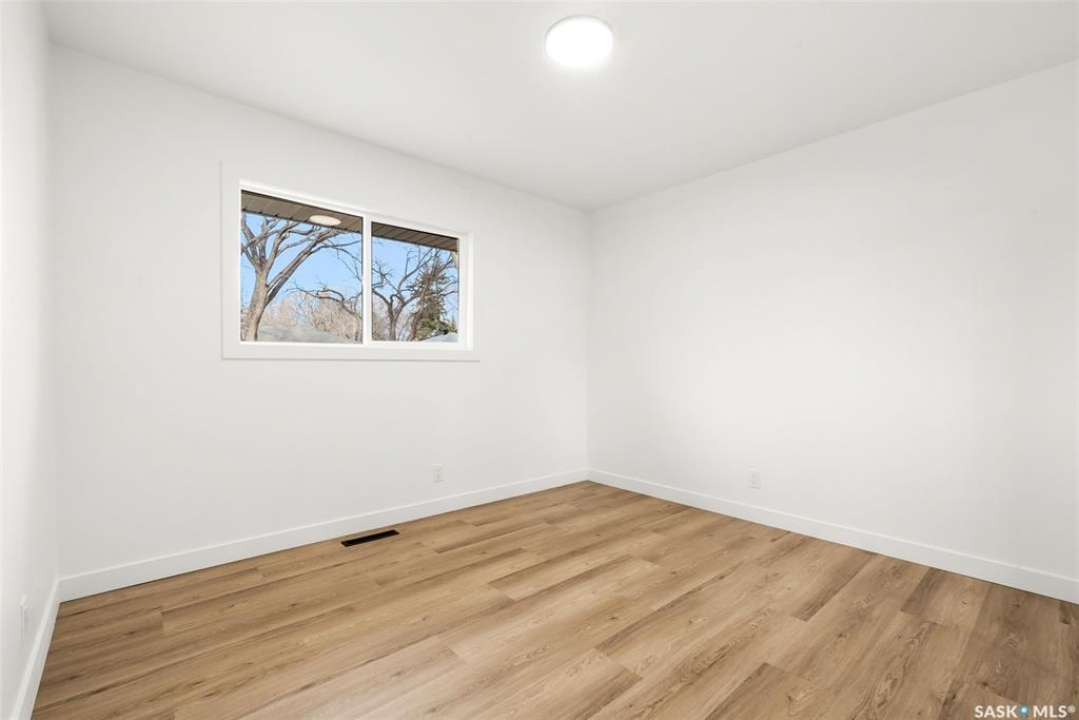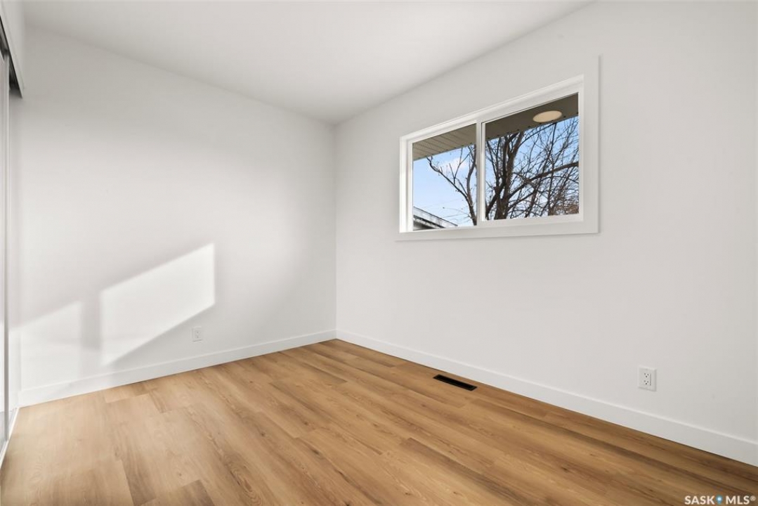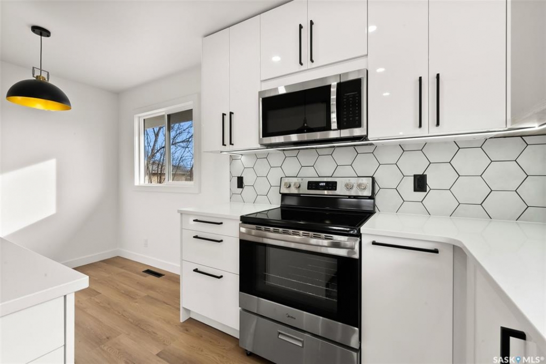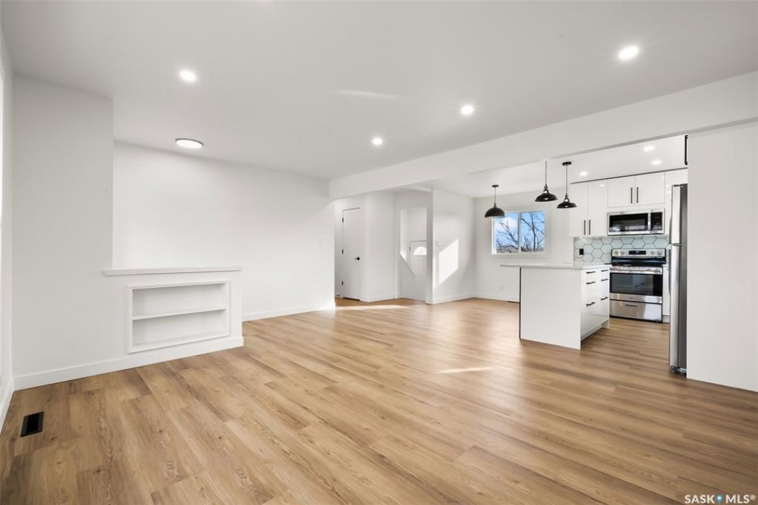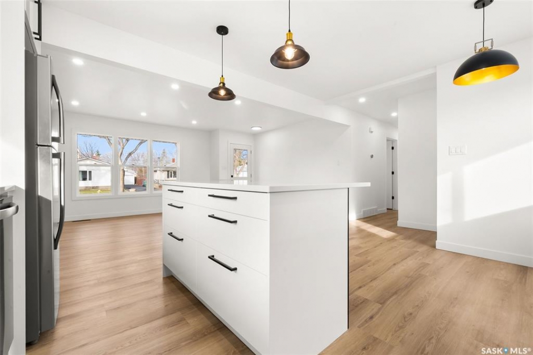 Located on one of the most desirable streets in the quiet Regent Park neighbourhood, this beautifully redeveloped home sits on a 7,000 sq. ft. lot backing green space! Professionally completed by Bouss Construction this property showcases quality craftsmanship and thoughtful design throughout. Step inside to a bright, open-concept main floor featuring sleek vinyl plank flooring and a neutral colour palette that feels fresh and inviting. The kitchen has been completely reimagined for both function and style, with quartz countertops, white cabinetry accented by black hardware, Hevea wood shelving, and a centre island with an eat-up bar. The dining area offers the perfect space for family dinners or entertaining. The living room features large windows and a custom feature wall with a built-in electric fireplace, TV insert and a side shelf for a modern, polished look. Down the hall are three spacious bedrooms and a fully renovated 4-piece bathroom showcasing custom tilework and updated fixtures. The basement extends your living space with a large rec room, a den ideal for a playroom or hobby area, an additional bedroom (window does not meet today's egress standards), a nicely curated 3-piece bathroom, and a laundry/utility room with extra storage. Outside, you'll find an oversized single detached garage equipped with a natural gas heater, plus a spacious yard perfect for kids or pets to enjoy. Additional value-added upgrades include new main-floor windows, new shingles on the house and garage, a newer water heater and brand-new kitchen appliances. This turnkey home offers the perfect combination of location, quality, and comfort — a rare find!