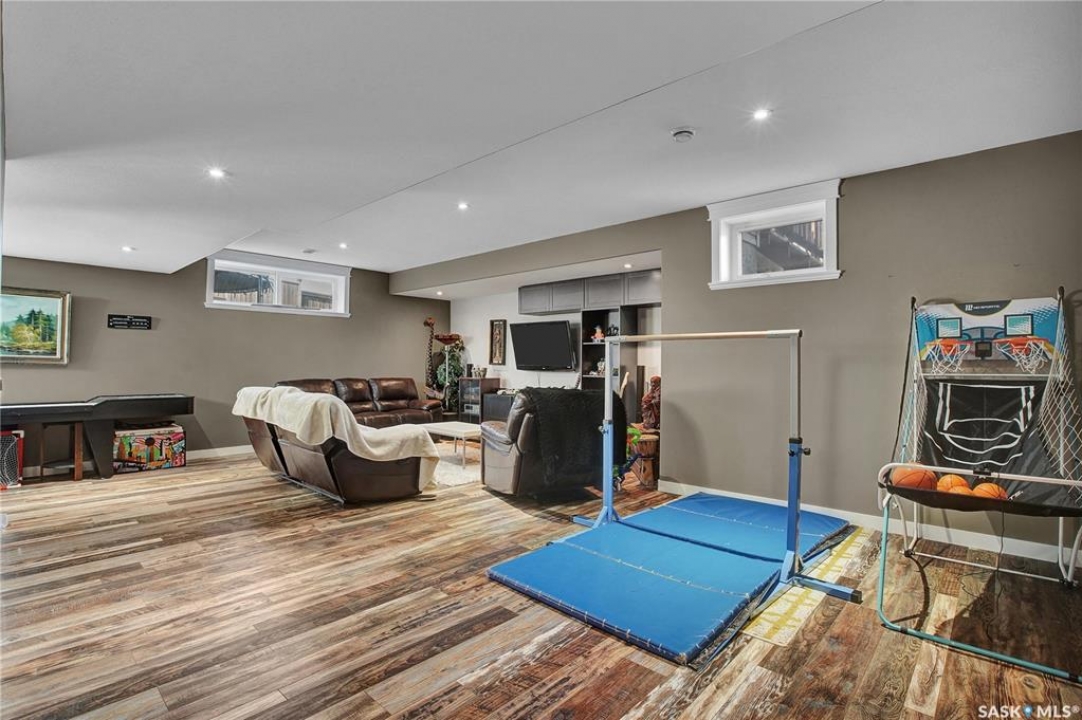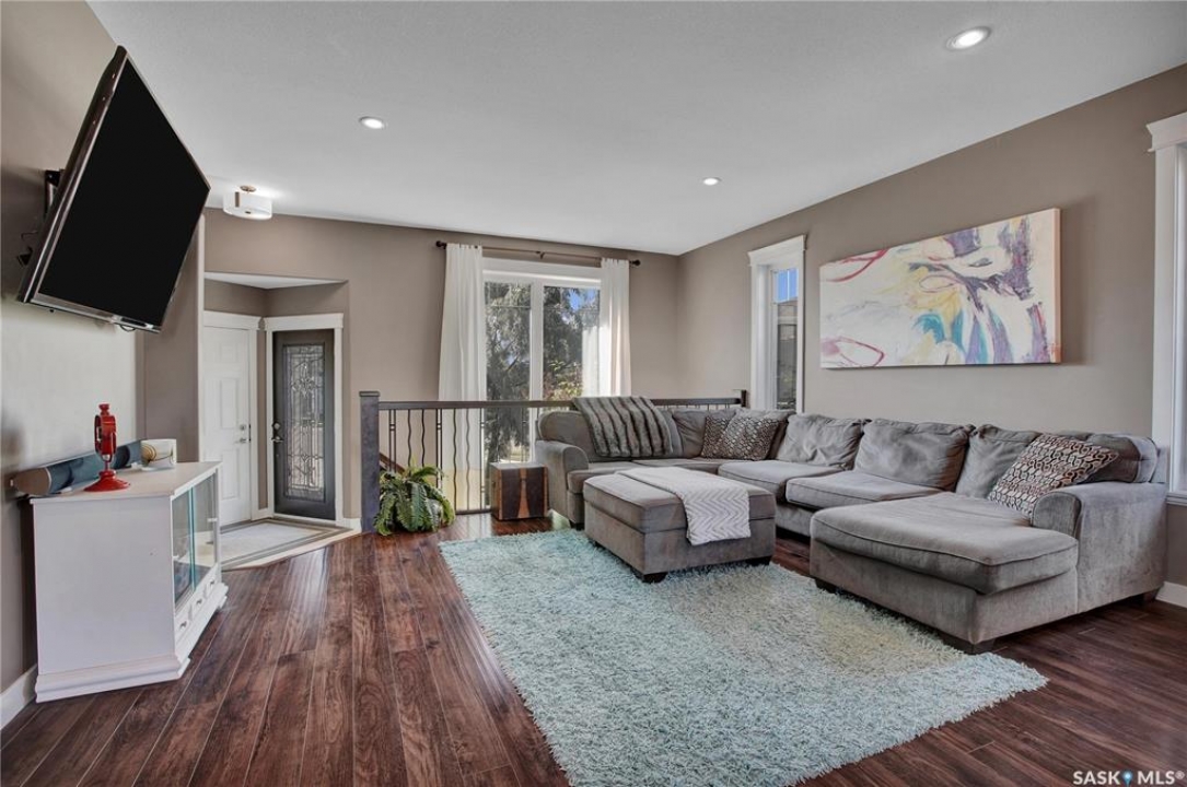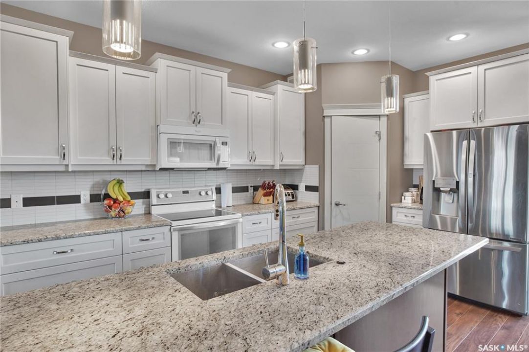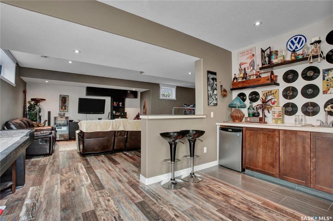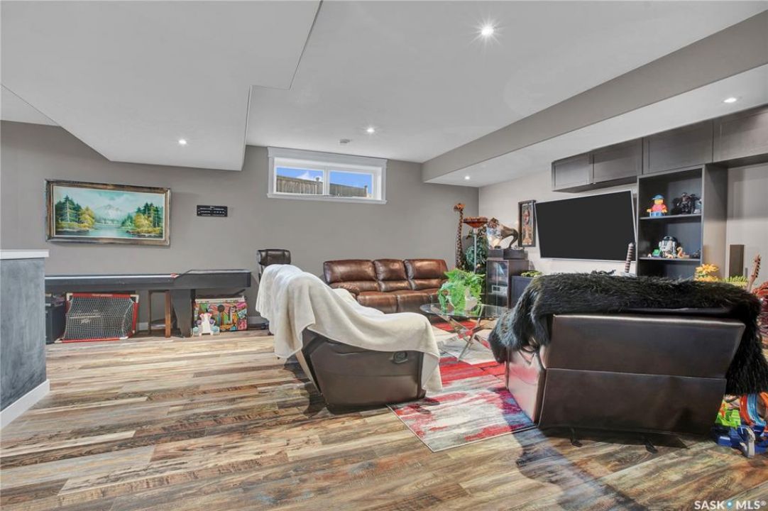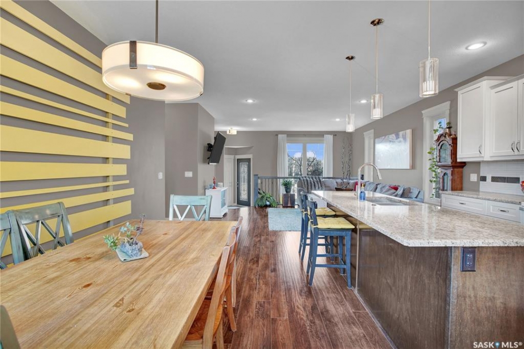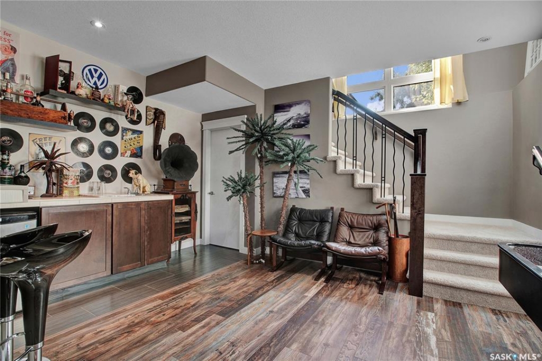 Welcome home to this immaculate 1,316 sq. ft. 4-bedroom, 3-bathroom bungalow—fully finished top to bottom and beautifully maintained throughout. The main floor offers a bright, open layout with a spacious living room featuring rich laminate floors and maple railings with metal spindles. The timeless two-tone kitchen includes granite countertops, tile backsplash, a large eat-up island, walk-in corner pantry, and under-cabinet lighting. The dining area easily accommodates large gatherings and includes a glass patio door to the back deck, plus transom windows that fill the space with natural light. Down the hall, the primary suite awaits with an upgraded drop-soffit ceiling, walk-in closet, and a 3-piece ensuite with custom tiled shower. Two additional bedrooms and a full 4-piece bathroom with tile floors and granite countertops complete the main level. The basement was designed for entertaining. A fantastic wet bar area features built-in cabinetry, bar fridge, and a raised seating peninsula. The massive family room is perfect for hosting game nights, movie nights, or setting up your home theater, and the adjoining games area offers plenty of room for a pool table or poker table. You'll also find a large bedroom, another full 4-piece bathroom, and a spacious laundry/storage/utility room—plus extra storage under the stairs. Outside, this property sits on a huge inside-corner, irregular lot with ample room for a trampoline, play structure, firepit, and more. Enjoy relaxing on the back deck with plenty of open views behind you looking out towards the golf course. Additional highlights include central A/C, HRV, an extra-wide concrete driveway, and an oversized 26'x26' attached garage that is fully insulated and drywalled. Upgraded bungalows like this are a rare find in Warman—this one shows 10/10 and is ready for its next owners. Contact your favourite Realtor today to book a private viewing!